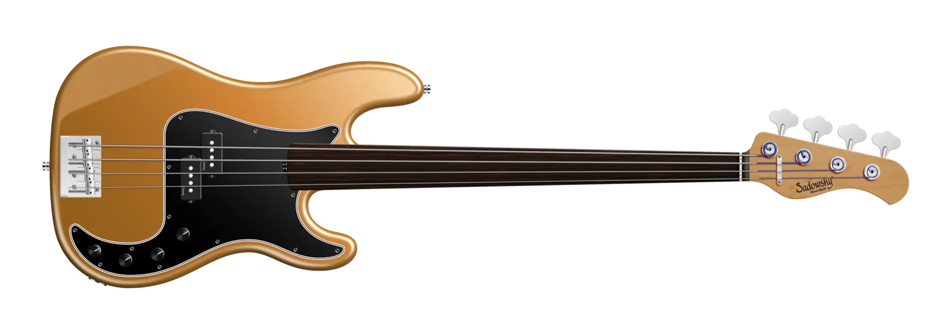 Der Sadowsky MasterBuilt 20-Fret Ultra Vintage P Bass ist ein Vintage P-Style Bass mit dem berühmten modernen Sadowsky Sound! Diese 4-saitige Fretless-Version hat einen P-Style-Korpus aus amerikanischer Roterle (chambered), der in einem Solid Firemist Gold Metallic Satin-Finish lackiert ist, und einen Hals aus geröstetem amerikanischem Ahorn mit einem Tigerstripe Ebony Griffbrett. Zu den besonderen Merkmalen dieses Basses gehören ein passiver Sadowsky P-Style Tonabnehmer, eine aktive Elektronik mit True Bypass, Höhen- und Bassanhebung und Vintage Tone Control, die den speziellen Sadowsky-Ton erzeugen: Niemals harsch oder schrill klingend, mit starken, kraftvollen (aber niemals matschigen!) Bässen, Mitten, die präsent, aber nicht zu aggressiv sind, und einem süßen und luftigen Höhenbereich. Außerdem verfügt sie über offene Sadowsky-Mechaniken und eine Sadowsky Quick String Release Bridge. Dieser Bass wird ausschließlich in unserer Werkstatt in Deutschland hergestellt und wiegt nie mehr als 3,8 kg. Eine gute Wahl für Bassisten, die einen schönen Vintage-P-Bass suchen, der gleichzeitig leicht ist und einen modernen Bass-Sound hat.