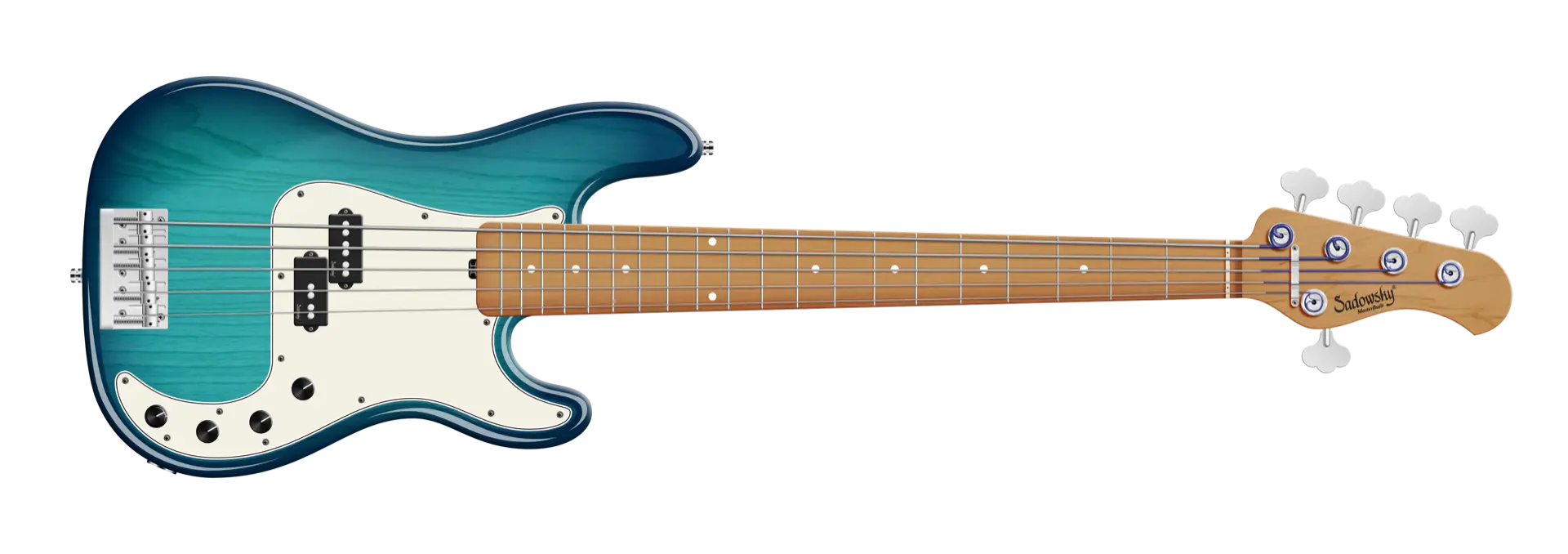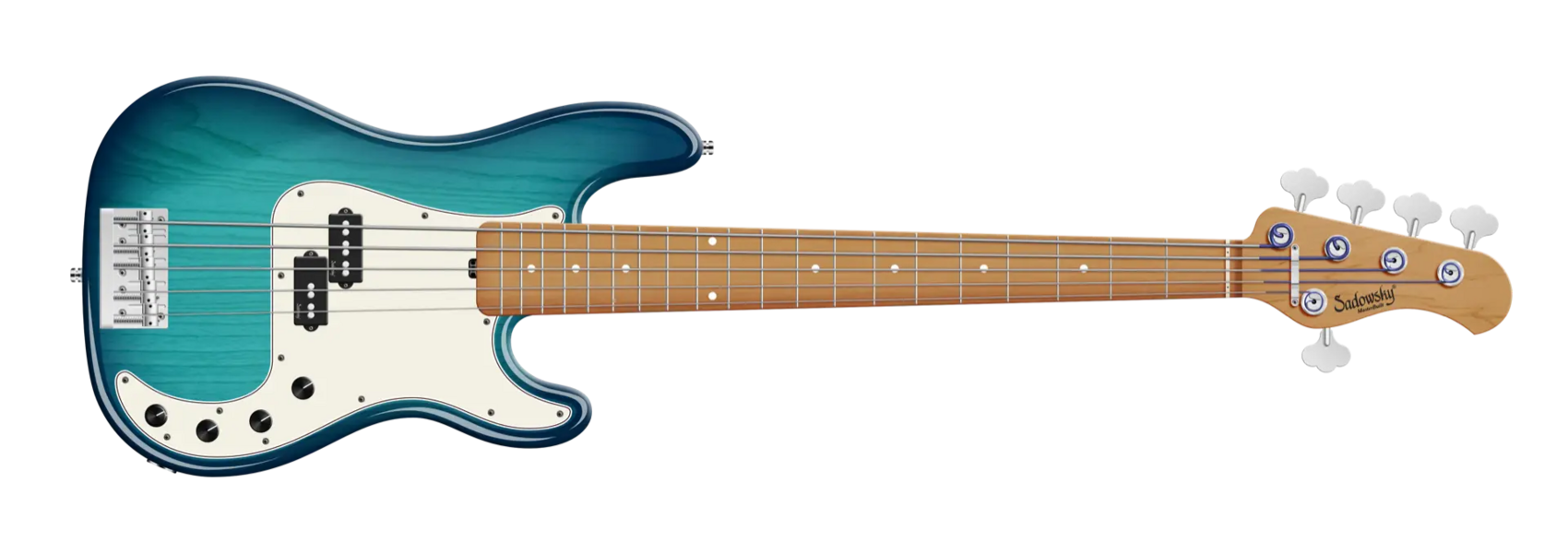 Der Sadowsky MasterBuilt 20-Fret Ultra Vintage P Bass ist ein Vintage P-Style Bass mit dem berühmten modernen Sadowsky Sound! Diese 5-saitige Version hat einen P-Style-Korpus aus amerikanischer Sumpfesche (chambered), der in einem Bora Blue Burst Transparent High Polish-Finish lackiert ist, und einen Hals aus geröstetem amerikanischem Ahorn mit einem Griffbrett aus geröstetem amerikanischem Ahorn. Zu den besonderen Merkmalen dieses Basses gehören ein passiver Sadowsky P-Style Tonabnehmer, eine aktive Elektronik mit True Bypass, Höhen- und Bassanhebung und Vintage Tone Control, die den speziellen Sadowsky-Ton erzeugen: Niemals harsch oder schrill klingend, mit starken, kraftvollen (aber niemals matschigen!) Bässen, Mitten, die präsent, aber nicht zu aggressiv sind, und einem süßen und luftigen Höhenbereich. Außerdem verfügt sie über offene Sadowsky-Mechaniken und eine Sadowsky Quick String Release Bridge. Dieser Bass wird ausschließlich in unserer Werkstatt in Deutschland hergestellt und wiegt nie mehr als 3,8 kg. Eine gute Wahl für Bassisten, die einen schönen Vintage-P-Bass suchen, der gleichzeitig leicht ist und einen modernen Bass-Sound hat.