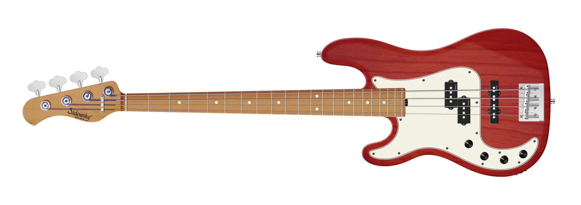 Roger Sadowskys Ziel war es immer, ein bereits sehr erfolgreiches Bassdesign durch eine Reihe von Detailverbesserungen weiter zu verbessern. Es ist ihm gelungen, den bekannten P/J-Bass-Sound auf ein neues Niveau zu heben und einen Ton zu schaffen, der nie hart oder schrill klingt, mit starken, kraftvollen (aber nie matschigen) Bässen, mit präsenten (aber nicht zu aggressiven) Mitten und einem süßen und luftigen Höhenbereich. Dieser Sound findet sich in der Sadowsky MasterBuilt 21-Fret Hybrid P/J Linie von Bässen wieder. Der hier als 4-saitiger Linkshänder-Bass mit Burgundy Red Transparent Satin-Lackierung gezeigte Bass besitzt einen P-Style-Korpus aus amerikanischer Sumpfesche (chambered). Der Hals ist aus geröstetem amerikanischem Ahorn und hat ein Griffbrett aus geröstetem amerikanischem Ahorn. Zu den besonderen Merkmalen dieses Basses gehören Sadowsky P- und J-Tonabnehmer, aktive Elektronik mit True Bypass, Vintage Tone Control, Treble und Bass Boost. Dieser Bass ist mit leichten, offenen Sadowsky-Mechaniken und der Sadowsky Quick String Release Bridge ausgestattet. Sadowsky MasterBuilt 21-Fret Hybrid P/J Bässe werden ausschließlich in Deutschland hergestellt. Das Gewicht dieses Basses beträgt nie mehr als 3,8 kg (8,4 lbs). Eine gute Wahl für Spieler, die einen sehr leichten Bass mit einem modernen Bass-Sound wünschen.