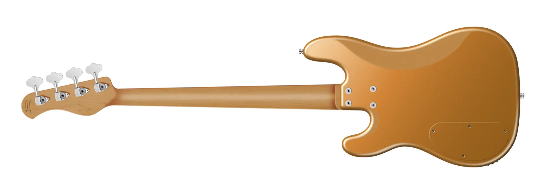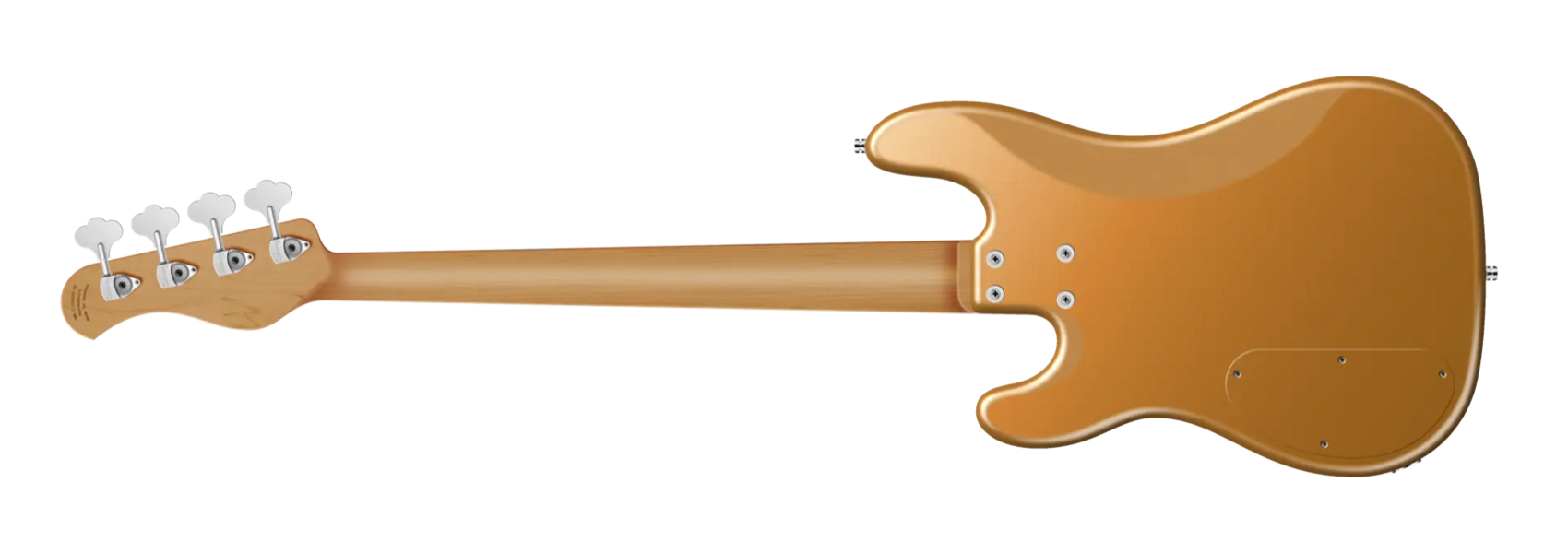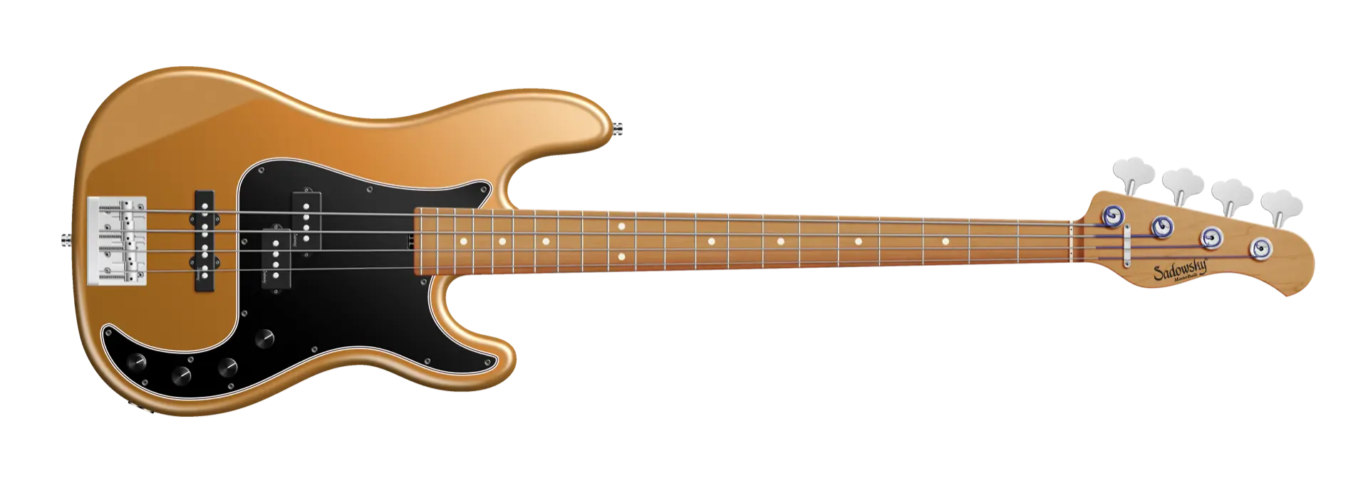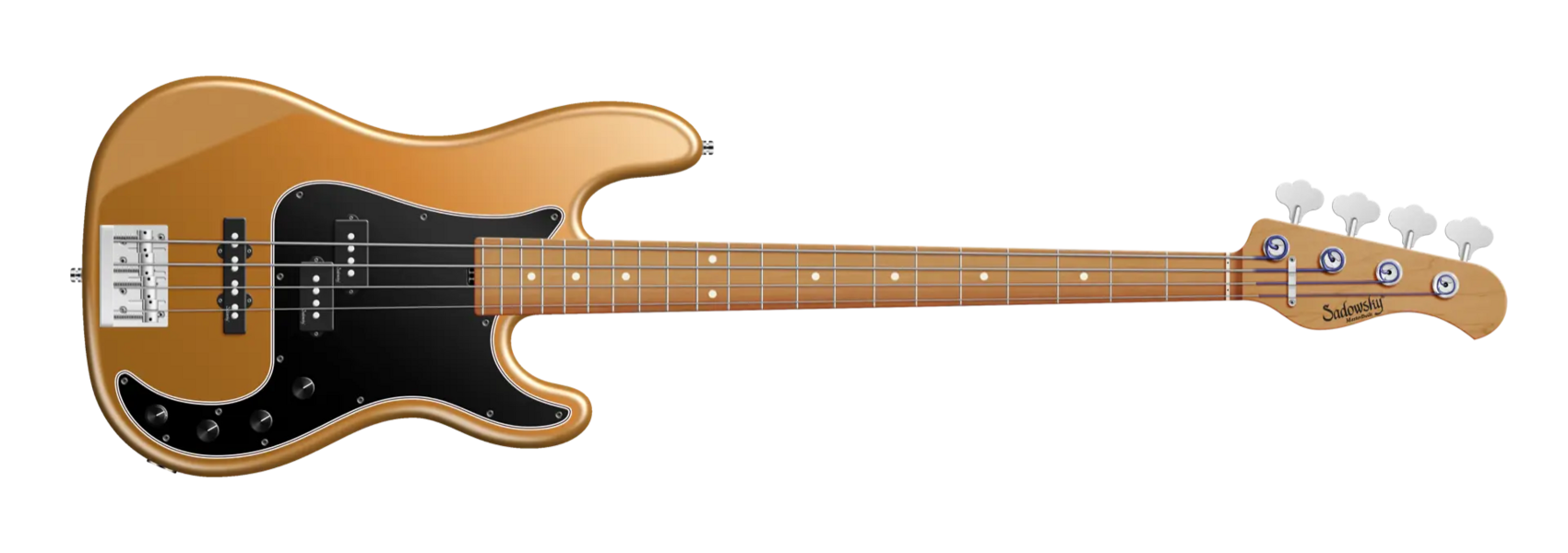 Roger Sadowskys Ziel war es immer, ein bereits sehr erfolgreiches Bassdesign durch eine Reihe von Detailverbesserungen weiter zu verbessern. Es ist ihm gelungen, den bekannten P/J-Bass-Sound auf ein neues Niveau zu heben und einen Ton zu schaffen, der nie hart oder schrill klingt, mit starken, kraftvollen (aber nie matschigen) Bässen, mit präsenten (aber nicht zu aggressiven) Mitten und einem süßen und luftigen Höhenbereich. Dieser Sound findet sich in der Sadowsky MasterBuilt 21-Fret Hybrid P/J Linie von Bässen wieder. Der hier als 4-saitiger Bass mit Solid Firemist Gold Metallic Satin-Lackierung gezeigte Bass besitzt einen P-Style-Korpus aus amerikanischer Sumpfesche (chambered). Der Hals ist aus geröstetem amerikanischem Ahorn und hat ein Griffbrett aus geröstetem amerikanischem Ahorn. Zu den besonderen Merkmalen dieses Basses gehören Sadowsky P- und J-Tonabnehmer, aktive Elektronik mit True Bypass, Vintage Tone Control, Treble und Bass Boost. Dieser Bass ist mit leichten, offenen Sadowsky-Mechaniken und der Sadowsky Quick String Release Bridge ausgestattet. Sadowsky MasterBuilt 21-Fret Hybrid P/J Bässe werden ausschließlich in Deutschland hergestellt. Das Gewicht dieses Basses beträgt nie mehr als 3,8 kg (8,4 lbs). Eine gute Wahl für Spieler, die einen sehr leichten Bass mit einem modernen Bass-Sound wünschen.
