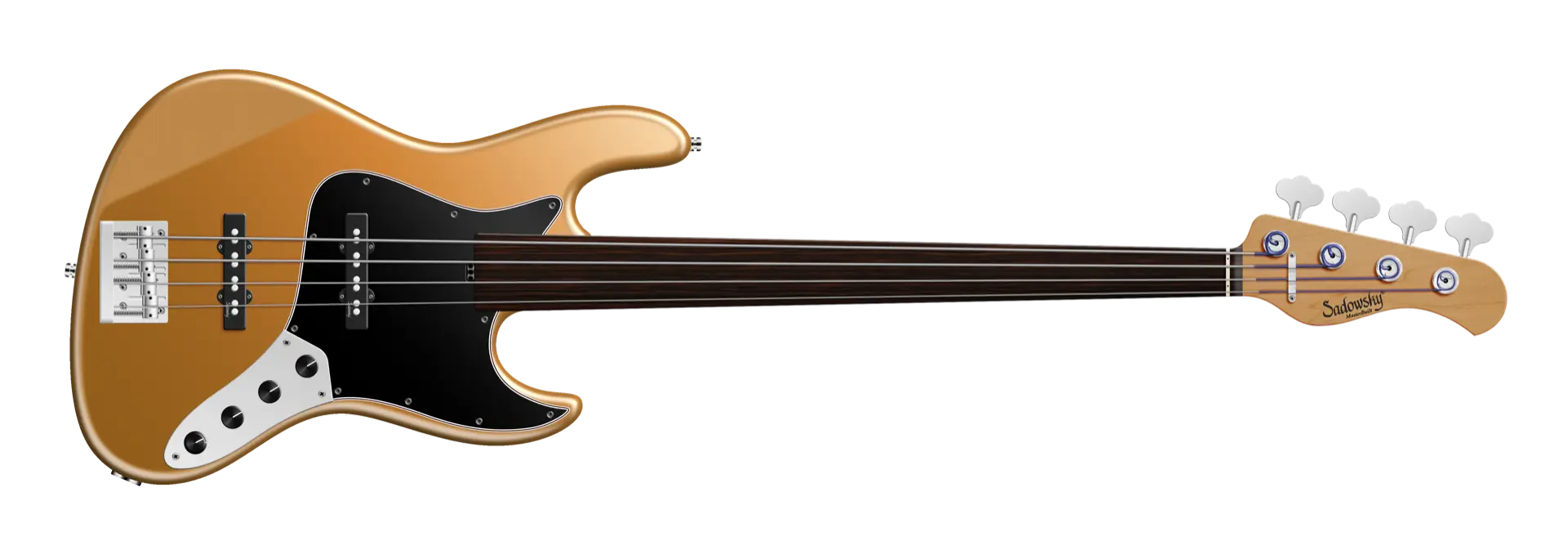 Der Sadowsky MasterBuilt 21-Fret Vintage J/J Bass hat einen tollen Vintage-Vibe! Dank der berühmten Sadowsky-Elektronik erhalten Sie einen Bass im Vintage-Look mit dem speziellen Sadowsky-Ton: Niemals harsch oder schrill klingend, mit starken, kraftvollen (aber niemals matschigen!) Bässen, Mitten, die präsent, aber nicht zu aggressiv sind, und einem süßen und luftigen Höhenbereich. Diese 4-saitige Fretless-Version hat einen schlanken, unterdimensionierten J-Style-Korpus aus amerikanischer Sumpfesche (chambered), der in einem Solid Firemist Gold Metallic Satin Finish lackiert ist. Der satinierte Hals ist aus geröstetem amerikanischem Ahorn gefertigt und hat ein Griffbrett aus geröstetem amerikanischem Ahorn. Zu den besonderen Merkmalen dieses Basses gehören zwei brummfreie Sadowsky J-Style-Tonabnehmer, eine aktive Elektronik mit True Bypass, Treble- und Bass-Boost und Vintage Tone Control. Außerdem verfügt er über leichte, offene Sadowsky-Mechaniken und eine Sadowsky Quick String Release Bridge. Dieser Bass wird ausschließlich in unserer Werkstatt in Deutschland hergestellt und wiegt nie mehr als 3,8 kg. Eine gute Wahl für Bassisten, die einen leichten Bass im Vintage-Stil mit einem modernen Bass-Sound suchen.