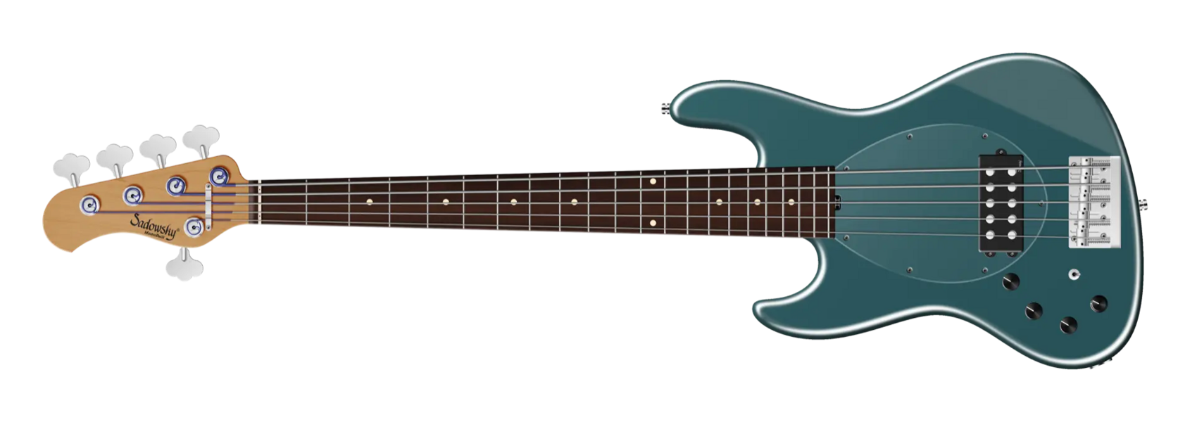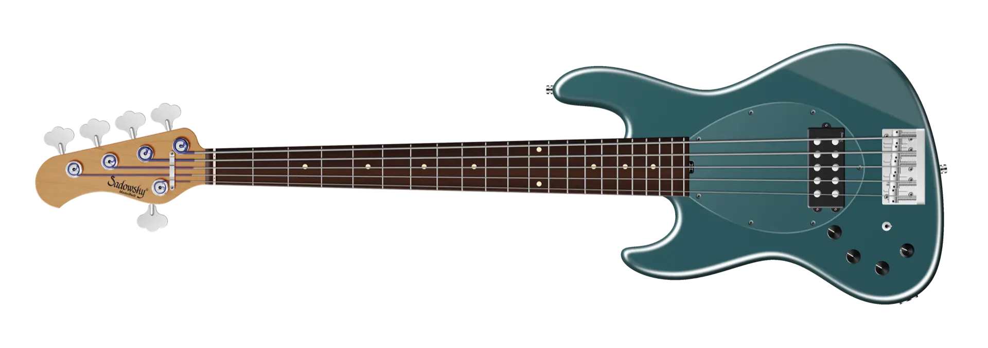 Der Sadowsky MasterBuilt 21-Fret Vintage M Bass bietet das Aussehen und das Spielgefühl eines Vintage M Basses, aber mit dem modernen Sadowsky-Ton. Dieser 5-saitige Linkshänder-Bass, hier in einem Solid Vintage Teal Green Metallic Satin-Finish, verfügt über einen schlanken, unterdimensionierten J-Style Korpus aus amerikanischem Roterle (chambered). Der Hals ist aus geröstetem amerikanischem Ahorn und verfügt über ein Morado (Pau Ferro) Griffbrett. Zu den besonderen Merkmalen dieses Basses gehören ein passiver Sadowsky Quad-Coil Humbucker mit Alnico V Magneten und eine aktive Elektronik mit True Bypass, Vintage Tone Control, Treble und Bass Boost und einem 3-Wege-Kippschalter für die Humbucker-Pickup-Konfiguration (Serie / Parallel / Single Coil). Dieser Bass verfügt außerdem über leichte, offene Sadowsky-Mechaniken und die Sadowsky Quick String Release Bridge. Jeder Sadowsky MasterBuilt Vintage M Bass wird ausschließlich in Deutschland gefertigt. Das Gewicht dieses Basses beträgt nie mehr als 3,8 kg. Eine gute Wahl für Spieler, die einen leichten Bass suchen, der einen modernen Bass-Sound bietet.