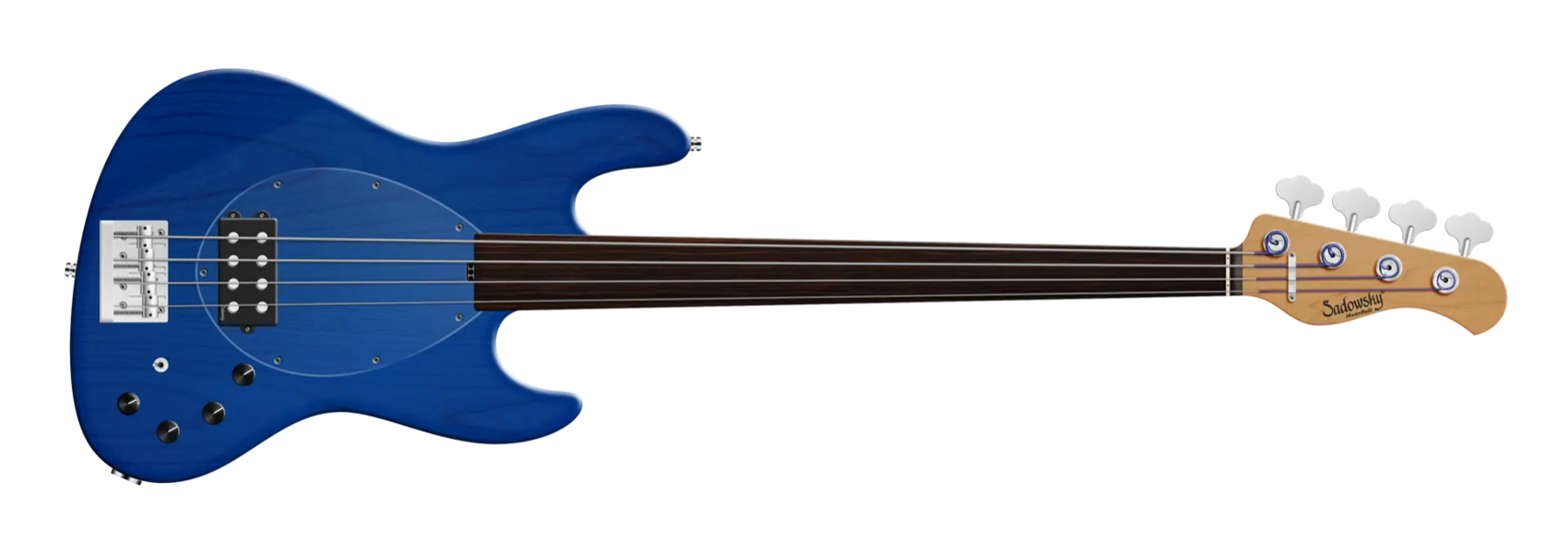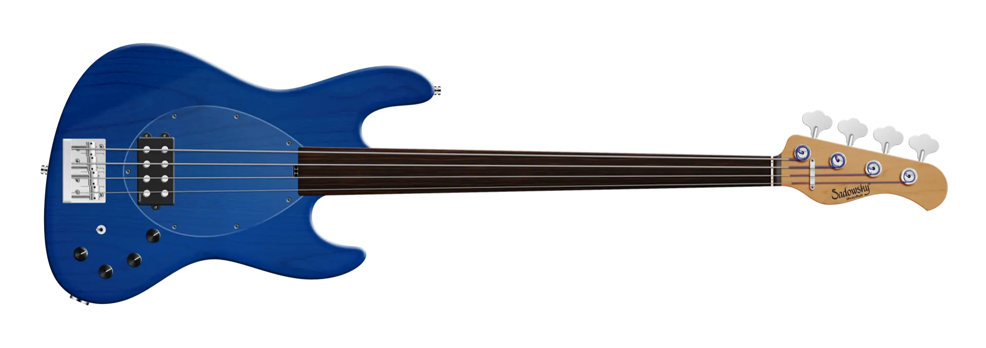 Der Sadowsky MasterBuilt 21-Fret Vintage M Bass bietet das Aussehen und das Spielgefühl eines Vintage M Basses, aber mit dem modernen Sadowsky-Ton. Dieser 4-saitige Fretless-Bass, hier in einem Ocean Blue Transparent Satin-Finish, verfügt über einen schlanken, unterdimensionierten, gekammerten J-Style-Korpus, der aus American Red Alder gefertigt ist. Der Hals ist aus geröstetem amerikanischem Ahorn und verfügt über ein Tigerstripe Ebony Griffbrett. Zu den besonderen Merkmalen dieses Basses gehören ein passiver Sadowsky Quad-Coil Humbucker mit Alnico V Magneten und eine aktive Elektronik mit True Bypass, Vintage Tone Control, Treble und Bass Boost und einem 3-Wege-Kippschalter für die Humbucker-Pickup-Konfiguration (Serie / Parallel / Single Coil). Dieser Bass verfügt außerdem über leichte, offene Sadowsky-Mechaniken und die Sadowsky Quick String Release Bridge. Jeder Sadowsky MasterBuilt Vintage M Bass wird ausschließlich in Deutschland gefertigt. Das Gewicht dieses Basses beträgt nie mehr als 3,8 kg. Eine gute Wahl für Spieler, die einen leichten Bass suchen, der einen modernen Bass-Sound bietet.