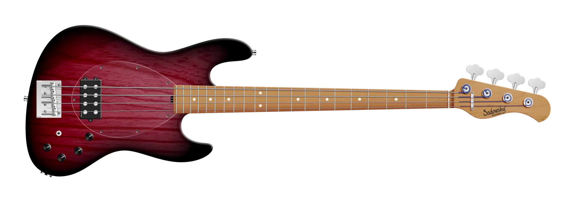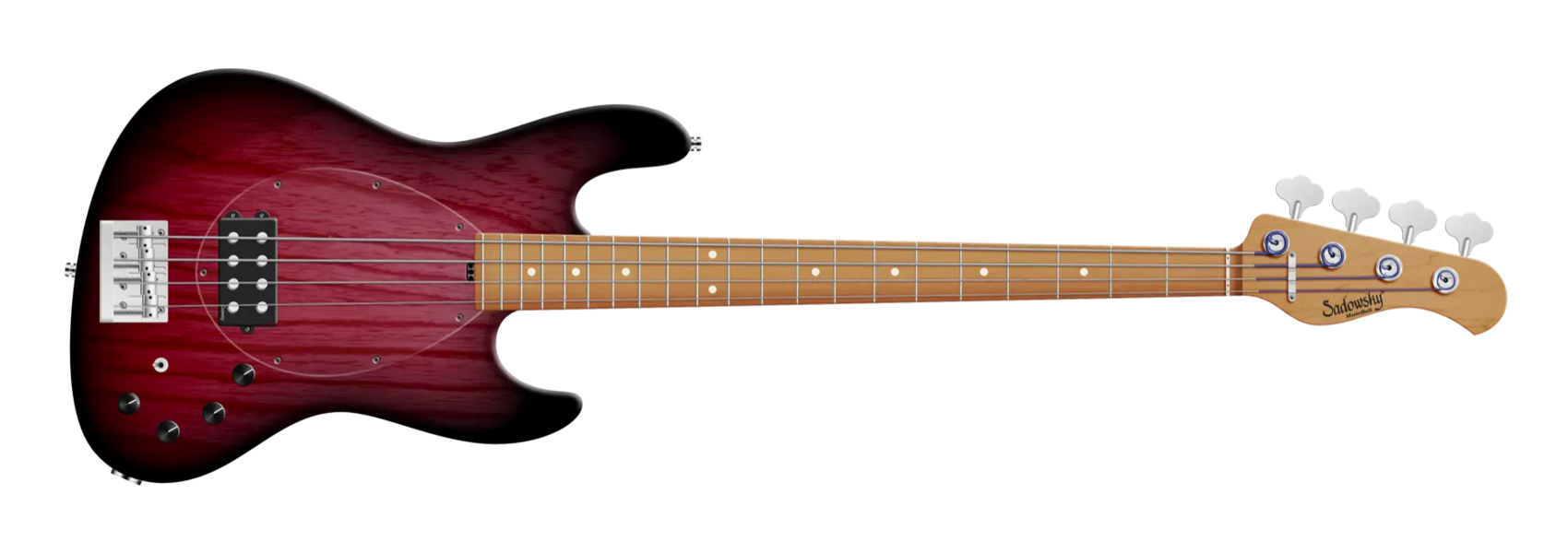 Der Sadowsky MasterBuilt 21-Fret Vintage M Bass bietet das Aussehen und das Spielgefühl eines Vintage M Basses, aber mit dem modernen Sadowsky-Ton. Dieser 4-saitige Bass, hier in einem Burgundy Blackburst Transparent Satin-Finish, verfügt über einen schlanken, unterdimensionierten J-Style Korpus aus amerikanischer Sumpfesche (chambered). Der Hals ist aus geröstetem amerikanischem Ahorn gefertigt und hat ein Griffbrett aus geröstetem amerikanischem Ahorn. Zu den besonderen Merkmalen dieses Basses gehören ein passiver Sadowsky Quad-Coil Humbucker mit Alnico V Magneten und eine aktive Elektronik mit True Bypass, Vintage Tone Control, Treble und Bass Boost und einem 3-Wege-Kippschalter für die Humbucker-Pickup-Konfiguration (Serie / Parallel / Single Coil). Dieser Bass verfügt außerdem über leichte, offene Sadowsky-Mechaniken und die Sadowsky Quick String Release Bridge. Jeder Sadowsky MasterBuilt Vintage M Bass wird ausschließlich in Deutschland gefertigt. Das Gewicht dieses Basses beträgt nie mehr als 3,8 kg. Eine gute Wahl für Spieler, die einen leichten Bass suchen, der einen modernen Bass-Sound bietet.