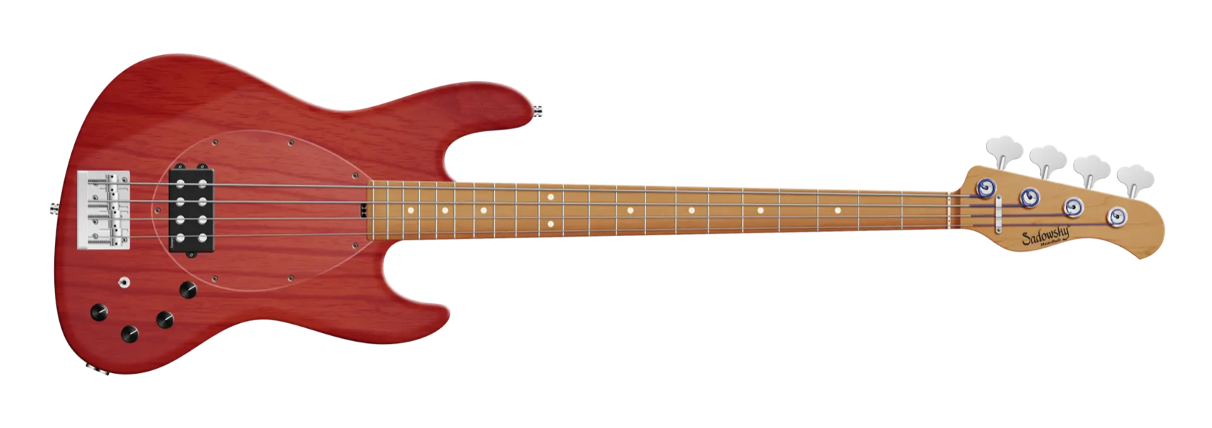Der Sadowsky MasterBuilt 21-Fret Vintage M Bass bietet das Aussehen und das Spielgefühl eines Vintage M Basses, aber mit dem modernen Sadowsky-Ton. Dieser 4-saitige Bass, hier in einem Burgundy Red Transparent Satin-Finish, verfügt über einen schlanken, unterdimensionierten J-Style Korpus aus amerikanischer Sumpfesche (chambered). Der Hals ist aus geröstetem amerikanischem Ahorn gefertigt und hat ein Griffbrett aus geröstetem amerikanischem Ahorn. Zu den besonderen Merkmalen dieses Basses gehören ein passiver Sadowsky Quad-Coil Humbucker mit Alnico V Magneten und eine aktive Elektronik mit True Bypass, Vintage Tone Control, Treble und Bass Boost und einem 3-Wege-Kippschalter für die Humbucker-Pickup-Konfiguration (Serie / Parallel / Single Coil). Dieser Bass verfügt außerdem über leichte, offene Sadowsky-Mechaniken und die Sadowsky Quick String Release Bridge. Jeder Sadowsky MasterBuilt Vintage M Bass wird ausschließlich in Deutschland gefertigt. Das Gewicht dieses Basses beträgt nie mehr als 3,8 kg. Eine gute Wahl für Spieler, die einen leichten Bass suchen, der einen modernen Bass-Sound bietet.