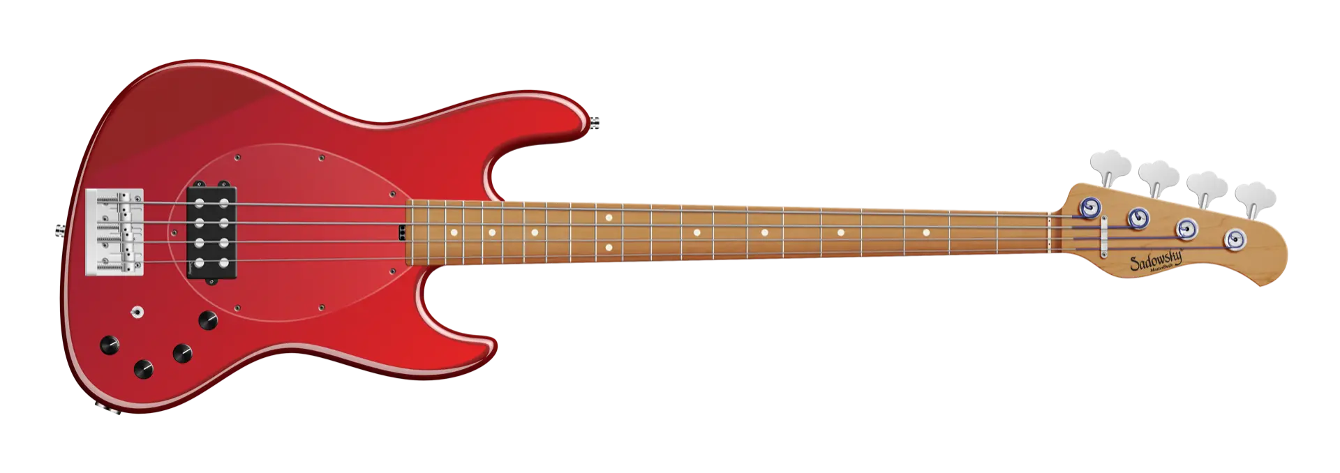 Der Sadowsky MasterBuilt 21-Fret Vintage M Bass bietet das Aussehen und das Spielgefühl eines Vintage M Basses, aber mit dem modernen Sadowsky-Ton. Dieser 4-saitige Bass, hier in einem Solid Candy Apple Red Metallic High Polish-Finish, verfügt über einen schlanken, unterdimensionierten J-Style Korpus aus amerikanischer Sumpfesche (chambered). Der Hals ist aus geröstetem amerikanischem Ahorn gefertigt und hat ein Griffbrett aus geröstetem amerikanischem Ahorn. Zu den besonderen Merkmalen dieses Basses gehören ein passiver Sadowsky Quad-Coil Humbucker mit Alnico V Magneten und eine aktive Elektronik mit True Bypass, Vintage Tone Control, Treble und Bass Boost und einem 3-Wege-Kippschalter für die Humbucker-Pickup-Konfiguration (Serie / Parallel / Single Coil). Dieser Bass verfügt außerdem über leichte, offene Sadowsky-Mechaniken und die Sadowsky Quick String Release Bridge. Jeder Sadowsky MasterBuilt Vintage M Bass wird ausschließlich in Deutschland gefertigt. Das Gewicht dieses Basses beträgt nie mehr als 3,8 kg. Eine gute Wahl für Spieler, die einen leichten Bass suchen, der einen modernen Bass-Sound bietet.