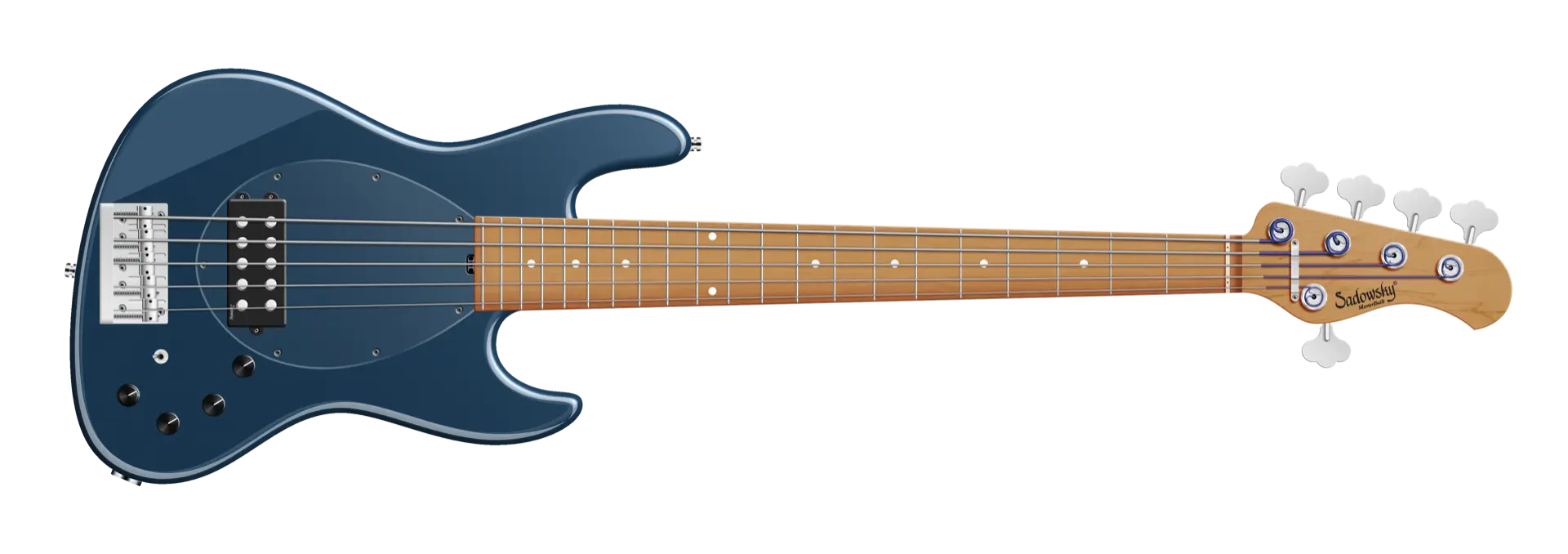 Der Sadowsky MasterBuilt 21-Fret Vintage M Bass bietet das Aussehen und das Spielgefühl eines Vintage M Basses, aber mit dem modernen Sadowsky-Ton. Dieser 5-saitige Bass, hier in einem Solid Dark Lake Placid Blue Metallic High Polish-Finish, verfügt über einen schlanken, unterdimensionierten J-Style Korpus aus amerikanischer Sumpfesche (chambered). Der Hals ist aus geröstetem amerikanischem Ahorn gefertigt und hat ein Griffbrett aus geröstetem amerikanischem Ahorn. Zu den besonderen Merkmalen dieses Basses gehören ein passiver Sadowsky Quad-Coil Humbucker mit Alnico V Magneten und eine aktive Elektronik mit True Bypass, Vintage Tone Control, Treble und Bass Boost und einem 3-Wege-Kippschalter für die Humbucker-Pickup-Konfiguration (Serie / Parallel / Single Coil). Dieser Bass verfügt außerdem über leichte, offene Sadowsky-Mechaniken und die Sadowsky Quick String Release Bridge. Jeder Sadowsky MasterBuilt Vintage M Bass wird ausschließlich in Deutschland gefertigt. Das Gewicht dieses Basses beträgt nie mehr als 3,8 kg. Eine gute Wahl für Spieler, die einen leichten Bass suchen, der einen modernen Bass-Sound bietet.