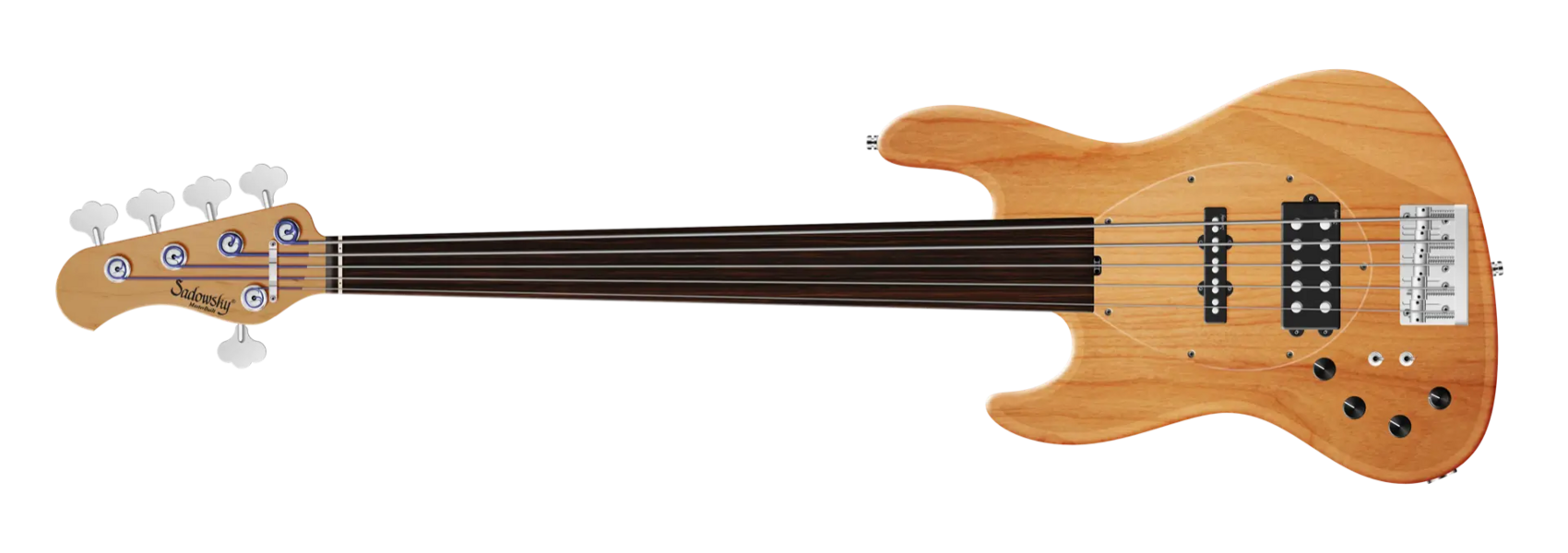 Der Sadowsky MasterBuilt 21-Fret Vintage M/J Bass bietet das Aussehen eines Vintage M/J Basses, aber mit dem berühmten modernen Sadowsky Ton. Dieser 5-saitige Linkshänder Fretless-Bass, hier in einem Natural Transparent Satin Finish, hat einen schlanken, unterdimensionierten J-Style Korpus aus amerikanischer Roterle (chambered). Der Hals ist aus geröstetem amerikanischem Ahorn und verfügt über ein Tigerstripe Ebony Griffbrett. Zu den besonderen Merkmalen dieses Basses gehören ein brummunterdrückender Sadowsky J-Style Halstonabnehmer und ein Sadowsky Quad-Coil Humbucker mit Alnico V Magneten. Die aktive Elektronik verfügt über True Bypass, Vintage Tone Control, Treble und Bass Boost und zwei 3-Wege-Kippschalter für Pickup-Konfiguration (Serie / Parallel / Single Coil). Dieser Bass verfügt außerdem über leichte, offene Sadowsky-Mechaniken und die Sadowsky Quick String Release Bridge. Sadowsky MasterBuilt 21-Fret Vintage M/J Bässe werden ausschließlich in Deutschland hergestellt. Das Gewicht dieses Basses beträgt nie mehr als 3,8 kg. Eine gute Wahl für Spieler, die einen leichten Bass suchen, der einen modernen Bass-Sound bietet.