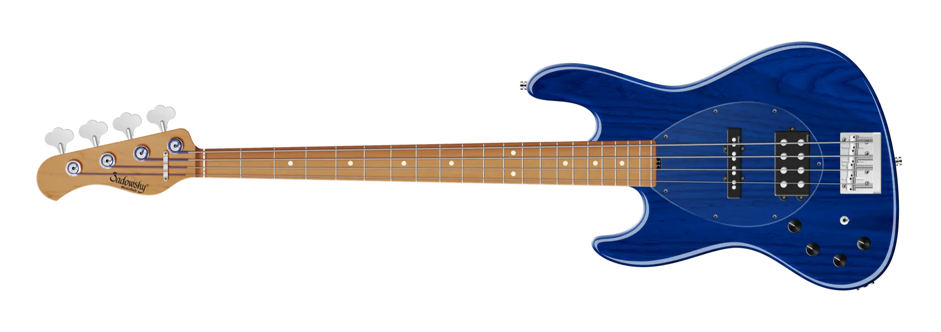 Der Sadowsky MasterBuilt 21-Fret Vintage M/J Bass bietet das Aussehen eines Vintage M/J Basses, aber mit dem berühmten modernen Sadowsky Ton. Dieser 4-saitige Linkshänder-Bass, hier in einem Ocean Blue Transparent High Polish Finish, hat einen schlanken, unterdimensionierten J-Style Korpus aus amerikanischer Sumpfesche (chambered). Der Hals ist aus geröstetem amerikanischem Ahorn gefertigt und hat ein Griffbrett aus geröstetem amerikanischem Ahorn. Zu den besonderen Merkmalen dieses Basses gehören ein brummunterdrückender Sadowsky J-Style Halstonabnehmer und ein Sadowsky Quad-Coil Humbucker mit Alnico V Magneten. Die aktive Elektronik verfügt über True Bypass, Vintage Tone Control, Treble und Bass Boost und einen 3-Wege-Kippschalter für die Humbucker-Pickup-Konfiguration (Serie / Parallel / Single Coil). Dieser Bass verfügt außerdem über leichte, offene Sadowsky-Mechaniken und die Sadowsky Quick String Release Bridge. Sadowsky MasterBuilt 21-Fret Vintage M/J Bässe werden ausschließlich in Deutschland hergestellt. Das Gewicht dieses Basses beträgt nie mehr als 3,8 kg. Eine gute Wahl für Spieler, die einen leichten Bass suchen, der einen modernen Bass-Sound bietet.