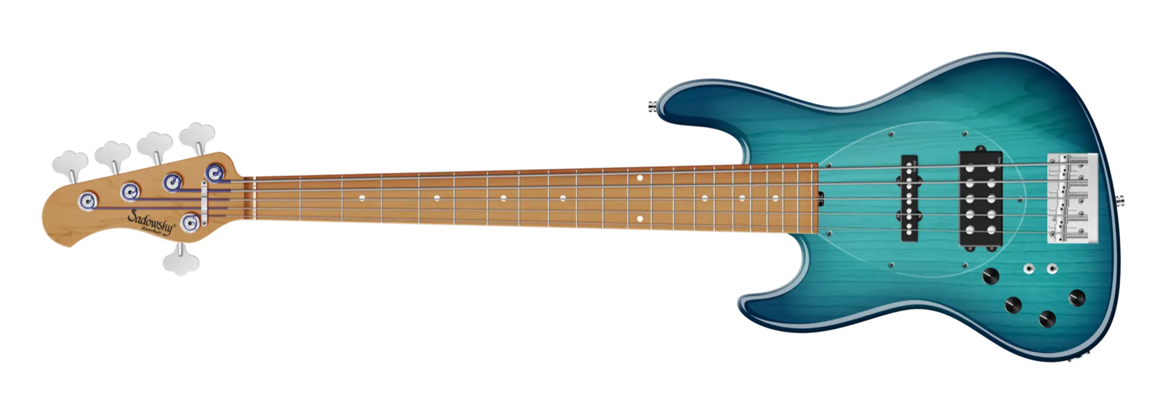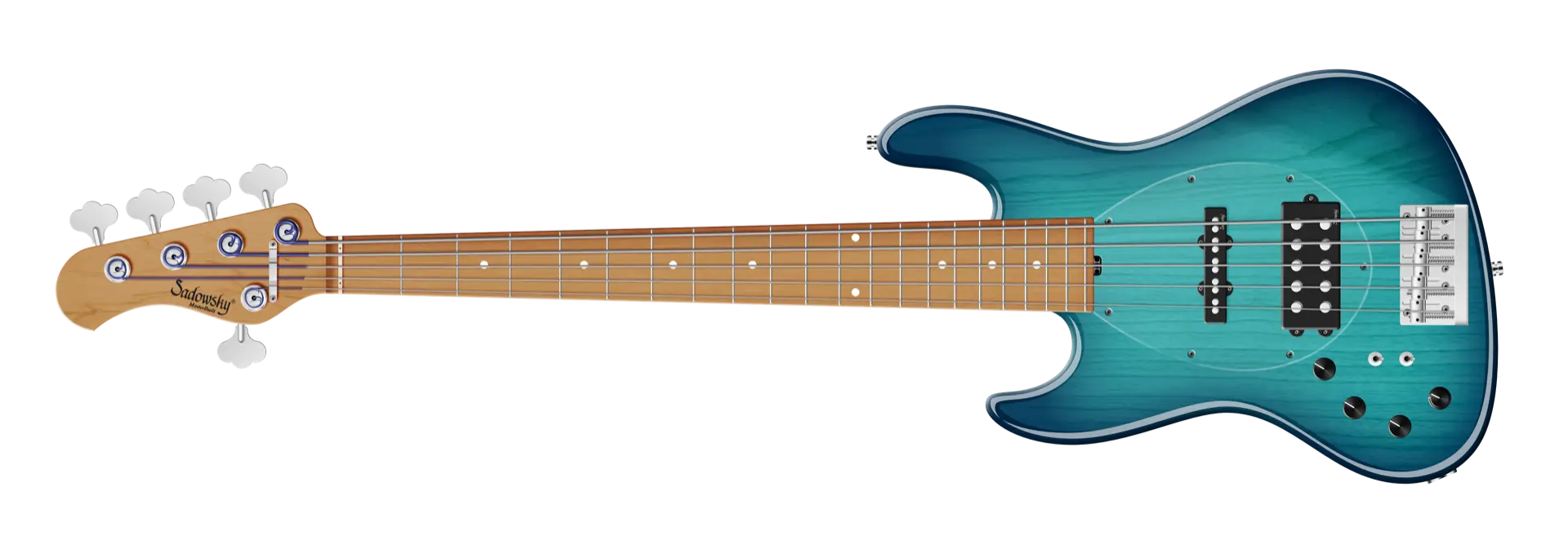 Der Sadowsky MasterBuilt 21-Fret Vintage M/J Bass bietet das Aussehen eines Vintage M/J Basses, aber mit dem berühmten modernen Sadowsky Ton. Dieser 5-saitige Linkshänder-Bass, hier in einem Bora Blue Burst Transparent High Polish Finish, hat einen schlanken, unterdimensionierten J-Style Korpus aus amerikanischer Sumpfesche (chambered). Der Hals ist aus geröstetem amerikanischem Ahorn gefertigt und hat ein Griffbrett aus geröstetem amerikanischem Ahorn. Zu den besonderen Merkmalen dieses Basses gehören ein brummunterdrückender Sadowsky J-Style Halstonabnehmer und ein Sadowsky Quad-Coil Humbucker mit Alnico V Magneten. Die aktive Elektronik verfügt über True Bypass, Vintage Tone Control, Treble und Bass Boost und zwei 3-Wege-Kippschalter für Pickup-Konfiguration (Serie / Parallel / Single Coil). Dieser Bass verfügt außerdem über leichte, offene Sadowsky-Mechaniken und die Sadowsky Quick String Release Bridge. Sadowsky MasterBuilt 21-Fret Vintage M/J Bässe werden ausschließlich in Deutschland hergestellt. Das Gewicht dieses Basses beträgt nie mehr als 3,8 kg. Eine gute Wahl für Spieler, die einen leichten Bass suchen, der einen modernen Bass-Sound bietet.