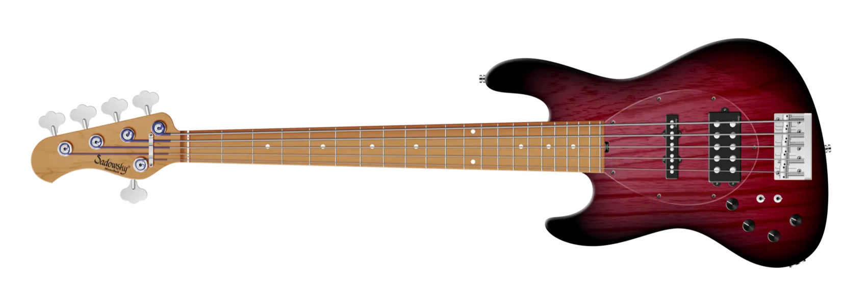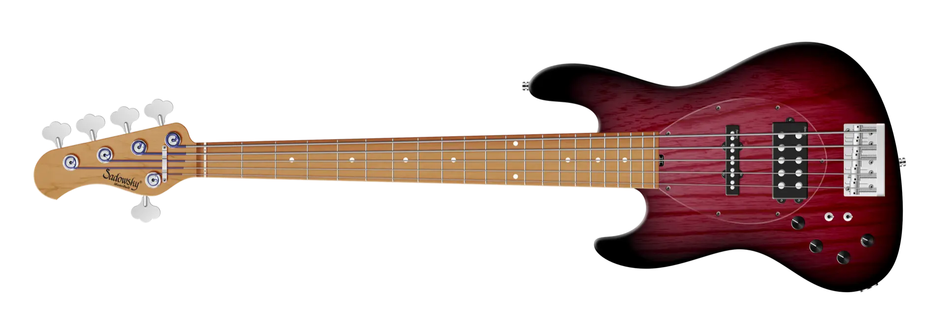 Der Sadowsky MasterBuilt 21-Fret Vintage M/J Bass bietet das Aussehen eines Vintage M/J Basses, aber mit dem berühmten modernen Sadowsky Ton. Dieser 5-saitige Linkshänder-Bass, hier in einem Burgundy Blackburst Transparent Satin Finish, hat einen schlanken, unterdimensionierten J-Style Korpus aus amerikanischer Sumpfesche (chambered). Der Hals ist aus geröstetem amerikanischem Ahorn gefertigt und hat ein Griffbrett aus geröstetem amerikanischem Ahorn. Zu den besonderen Merkmalen dieses Basses gehören ein brummunterdrückender Sadowsky J-Style Halstonabnehmer und ein Sadowsky Quad-Coil Humbucker mit Alnico V Magneten. Die aktive Elektronik verfügt über True Bypass, Vintage Tone Control, Treble und Bass Boost und zwei 3-Wege-Kippschalter für Pickup-Konfiguration (Serie / Parallel / Single Coil). Dieser Bass verfügt außerdem über leichte, offene Sadowsky-Mechaniken und die Sadowsky Quick String Release Bridge. Sadowsky MasterBuilt 21-Fret Vintage M/J Bässe werden ausschließlich in Deutschland hergestellt. Das Gewicht dieses Basses beträgt nie mehr als 3,8 kg. Eine gute Wahl für Spieler, die einen leichten Bass suchen, der einen modernen Bass-Sound bietet.
