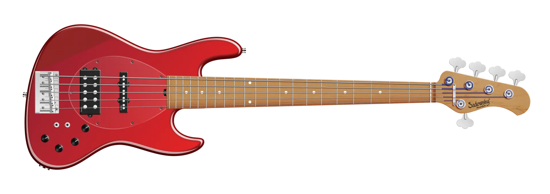 Der Sadowsky MasterBuilt 21-Fret Vintage M/J Bass bietet das Aussehen eines Vintage M/J Basses, aber mit dem berühmten modernen Sadowsky Ton. Dieser 5-saitige Bass, hier in einem Solid Candy Apple Red Metallic High Polish Finish, hat einen schlanken, unterdimensionierten J-Style Korpus aus amerikanischer Sumpfesche (chambered). Der Hals ist aus geröstetem amerikanischem Ahorn gefertigt und hat ein Griffbrett aus geröstetem amerikanischem Ahorn. Zu den besonderen Merkmalen dieses Basses gehören ein brummunterdrückender Sadowsky J-Style Halstonabnehmer und ein Sadowsky Quad-Coil Humbucker mit Alnico V Magneten. Die aktive Elektronik verfügt über True Bypass, Vintage Tone Control, Treble und Bass Boost und zwei 3-Wege-Kippschalter für Pickup-Konfiguration (Serie / Parallel / Single Coil). Dieser Bass verfügt außerdem über leichte, offene Sadowsky-Mechaniken und die Sadowsky Quick String Release Bridge. Sadowsky MasterBuilt 21-Fret Vintage M/J Bässe werden ausschließlich in Deutschland hergestellt. Das Gewicht dieses Basses beträgt nie mehr als 3,8 kg. Eine gute Wahl für Spieler, die einen leichten Bass suchen, der einen modernen Bass-Sound bietet.