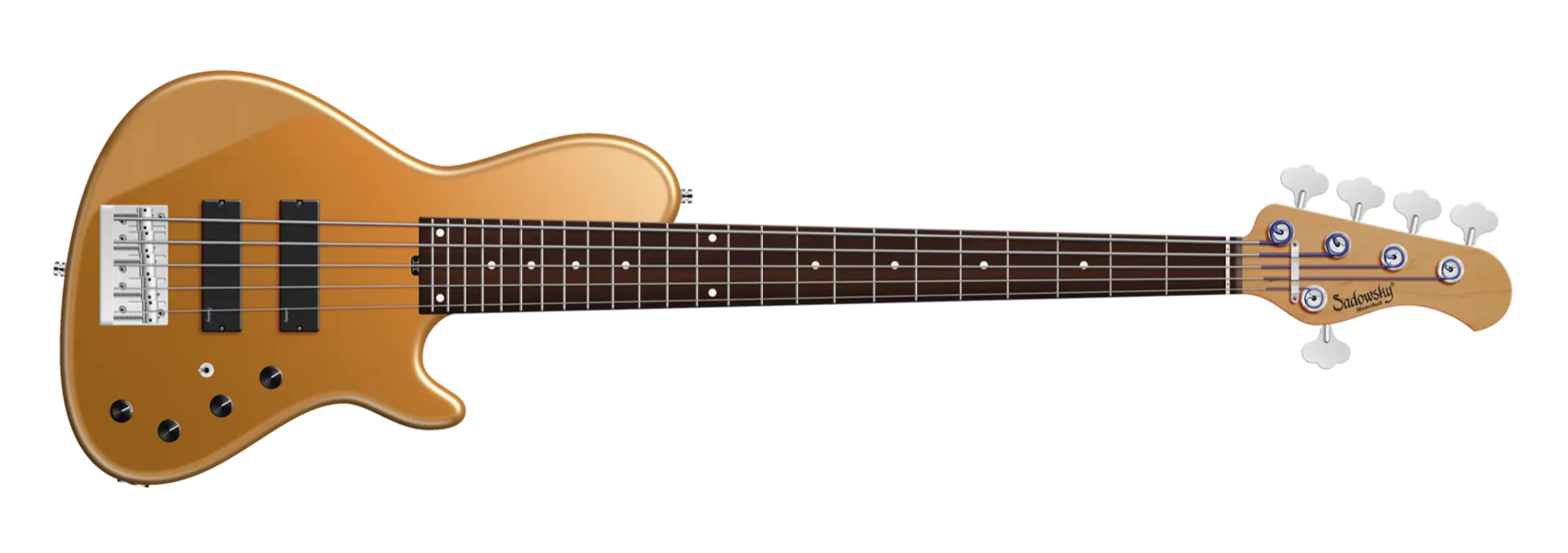 Der Sadowsky MasterBuilt 24-Fret Single Cut Bass 5-saitiger Bass verfügt über einen schlanken Single-Cut-Stil Korpus aus amerikanischer Roterle (chambered) mit einer Solid Firemist Gold Metallic Satin Lackierung. Der Hals ist aus geröstetem amerikanischem Ahorn gefertigt und mit einem Morado (Pau Ferro) Griffbrett ausgestattet. Zu den besonderen Merkmalen dieses Basses gehören Sadowsky Soapbar Pickups sowie Rogers berühmte Elektronik mit einem Preamp mit schaltbarem Mid-Boost und Trimmpoti (wahlweise 500 oder 800 Hz, schmal- oder breitbandig), Vintage Tone Control und Preamp Bypass. Zu den Reglern gehören Volume, Balance, VTC (P/P), Treble und Bass. Die Hardware umfasst eine Sadowsky Quick String Release Bridge und leichte, offene Sadowsky Mechaniken. Ein Sadowsky MasterBuilt 24-Fret Single Cut Bass, der ausschließlich in Deutschland hergestellt wird, wiegt nie mehr als 3,8 kg. Er ist eine gute Wahl für Spieler, die einen leichten Single-Cut-Bass mit dem berühmten Sadowsky-Ton suchen: ein starker, kraftvoller Bass, der nie matschig ist. Mitten, die präsent, aber nicht zu aggressiv sind, und ein süßer und luftiger Höhenbereich.