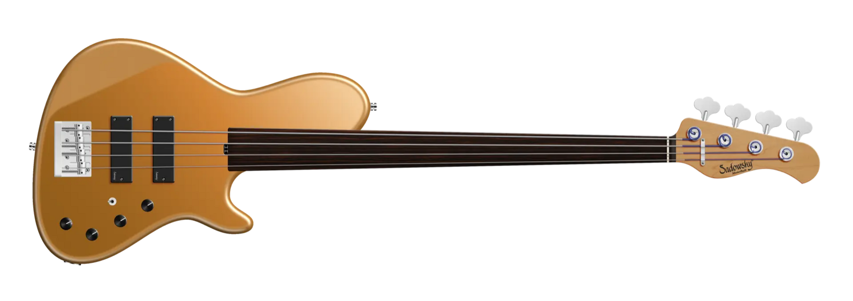 Der Sadowsky MasterBuilt 24-Fret Single Cut Bass 4-saitiger Fretless-Bass verfügt über einen schlanken Single-Cut-Stil Korpus aus amerikanischer Roterle (chambered) mit einer Solid Firemist Gold Metallic Satin Lackierung. Der Hals ist aus geröstetem amerikanischem Ahorn gefertigt und mit einem Morado (Pau Ferro) Griffbrett ausgestattet. Zu den besonderen Merkmalen dieses Basses gehören Sadowsky Soapbar Pickups sowie Rogers berühmte Elektronik mit einem Preamp mit schaltbarem Mid-Boost und Trimmpoti (wahlweise 500 oder 800 Hz, schmal- oder breitbandig), Vintage Tone Control und Preamp Bypass. Zu den Reglern gehören Volume, Balance, VTC (P/P), Treble und Bass. Die Hardware umfasst eine Sadowsky Quick String Release Bridge und leichte, offene Sadowsky Mechaniken. Ein Sadowsky MasterBuilt 24-Fret Single Cut Bass, der ausschließlich in Deutschland hergestellt wird, wiegt nie mehr als 3,8 kg. Er ist eine gute Wahl für Spieler, die einen leichten Single-Cut-Bass mit dem berühmten Sadowsky-Ton suchen: ein starker, kraftvoller Bass, der nie matschig ist. Mitten, die präsent, aber nicht zu aggressiv sind, und ein süßer und luftiger Höhenbereich.