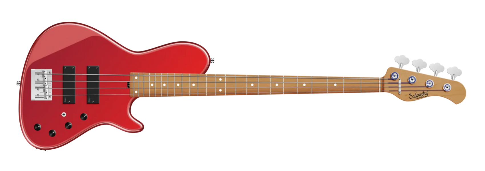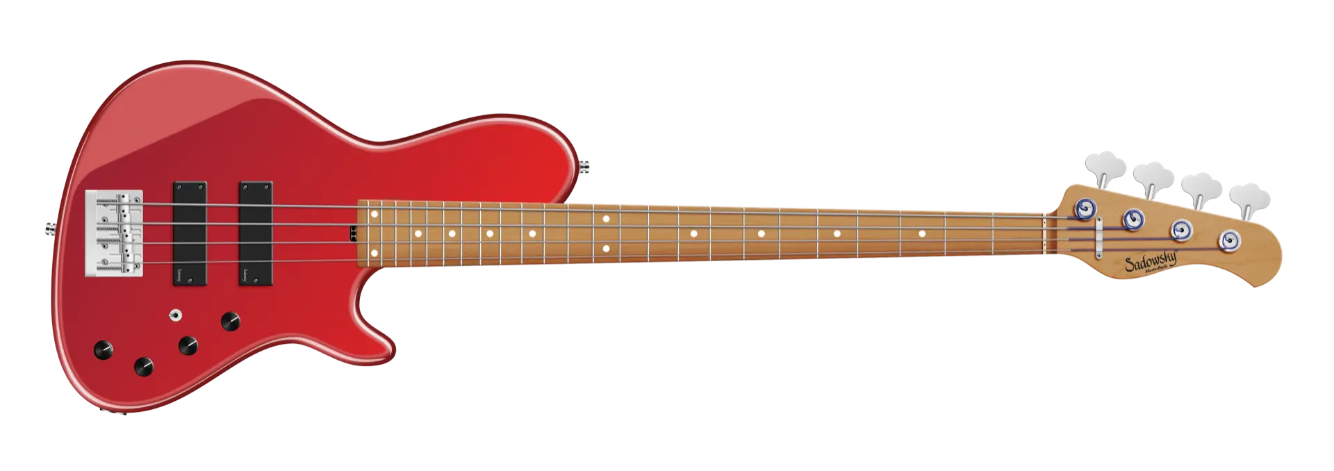 Der Sadowsky MasterBuilt 24-Fret Single Cut Bass 4-saitiger Bass verfügt über einen schlanken Single-Cut-Stil Korpus aus amerikanischer Sumpfesche (chambered) mit einer Solid Dakota Red High Polish Lackierung. Der Hals ist aus geröstetem amerikanischem Ahorn gefertigt und mit einem Griffbrett aus geröstetem amerikanischem Ahorn. Zu den besonderen Merkmalen dieses Basses gehören Sadowsky Soapbar Pickups sowie Rogers berühmte Elektronik mit einem Preamp mit schaltbarem Mid-Boost und Trimmpoti (wahlweise 500 oder 800 Hz, schmal- oder breitbandig), Vintage Tone Control und Preamp Bypass. Zu den Reglern gehören Volume, Balance, VTC (P/P), Treble und Bass. Die Hardware umfasst eine Sadowsky Quick String Release Bridge und leichte, offene Sadowsky Mechaniken. Ein Sadowsky MasterBuilt 24-Fret Single Cut Bass, der ausschließlich in Deutschland hergestellt wird, wiegt nie mehr als 3,8 kg. Er ist eine gute Wahl für Spieler, die einen leichten Single-Cut-Bass mit dem berühmten Sadowsky-Ton suchen: ein starker, kraftvoller Bass, der nie matschig ist. Mitten, die präsent, aber nicht zu aggressiv sind, und ein süßer und luftiger Höhenbereich.