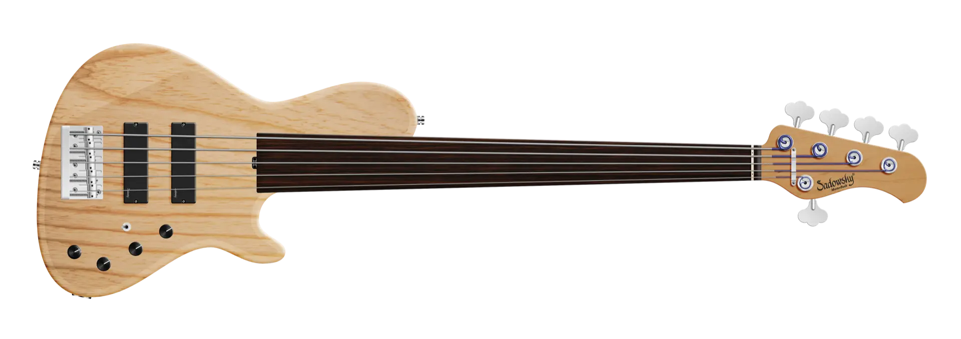 Der Sadowsky MasterBuilt 24-Fret Single Cut Bass 5-saitiger Fretless-Bass verfügt über einen schlanken Single-Cut-Stil Korpus aus amerikanischer Sumpfesche (chambered) mit einer Natural Transparent Satin Lackierung. Der Hals ist aus geröstetem amerikanischem Ahorn gefertigt und mit einem Griffbrett aus Tigerstripe Ebony. Zu den besonderen Merkmalen dieses Basses gehören Sadowsky Soapbar Pickups sowie Rogers berühmte Elektronik mit einem Preamp mit schaltbarem Mid-Boost und Trimmpoti (wahlweise 500 oder 800 Hz, schmal- oder breitbandig), Vintage Tone Control und Preamp Bypass. Zu den Reglern gehören Volume, Balance, VTC (P/P), Treble und Bass. Die Hardware umfasst eine Sadowsky Quick String Release Bridge und leichte, offene Sadowsky Mechaniken. Ein Sadowsky MasterBuilt 24-Fret Single Cut Bass, der ausschließlich in Deutschland hergestellt wird, wiegt nie mehr als 3,8 kg. Er ist eine gute Wahl für Spieler, die einen leichten Single-Cut-Bass mit dem berühmten Sadowsky-Ton suchen: ein starker, kraftvoller Bass, der nie matschig ist. Mitten, die präsent, aber nicht zu aggressiv sind, und ein süßer und luftiger Höhenbereich.