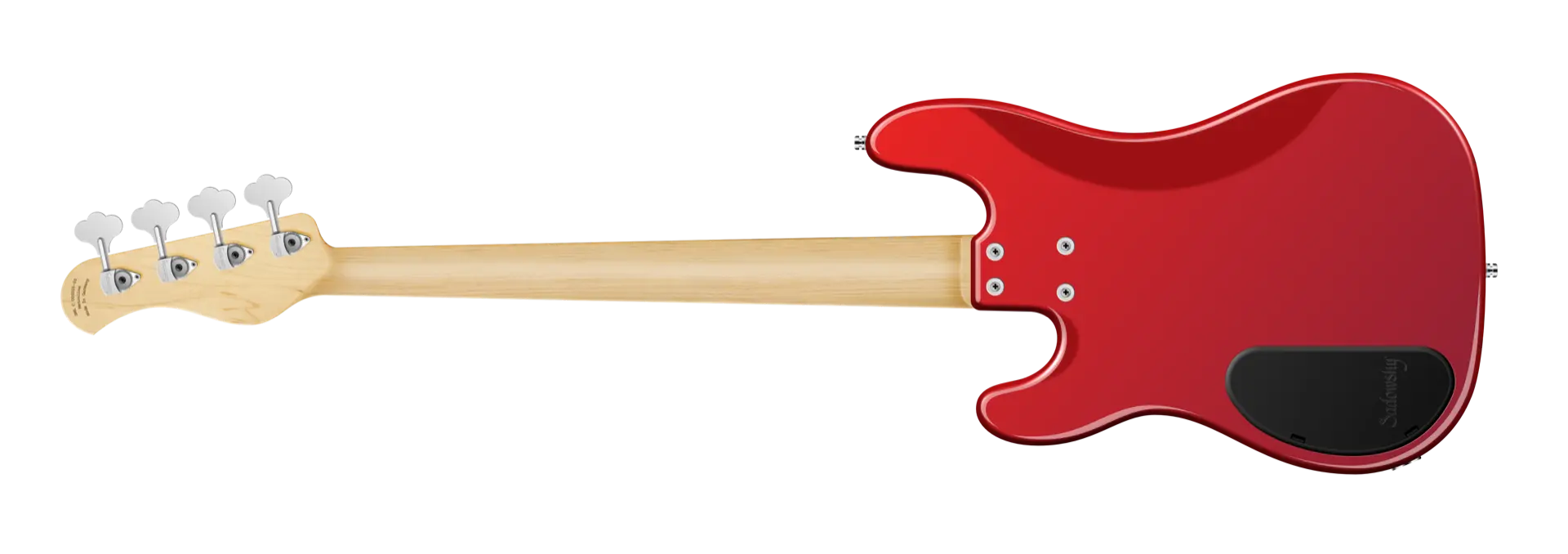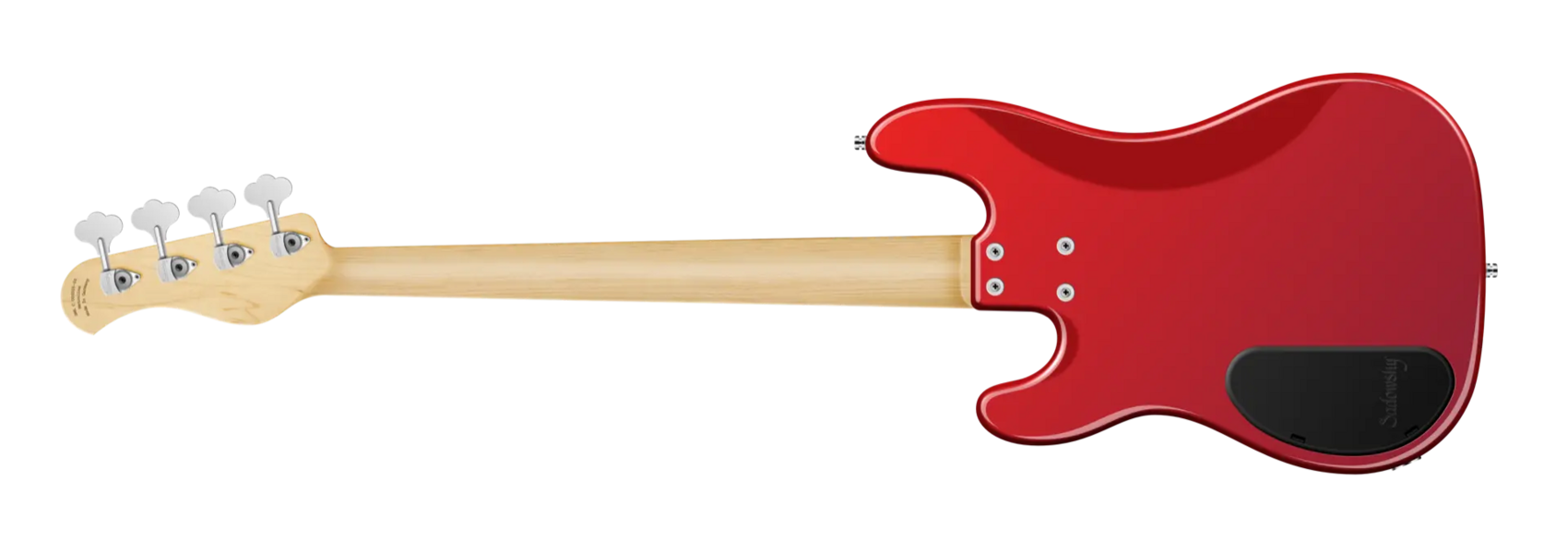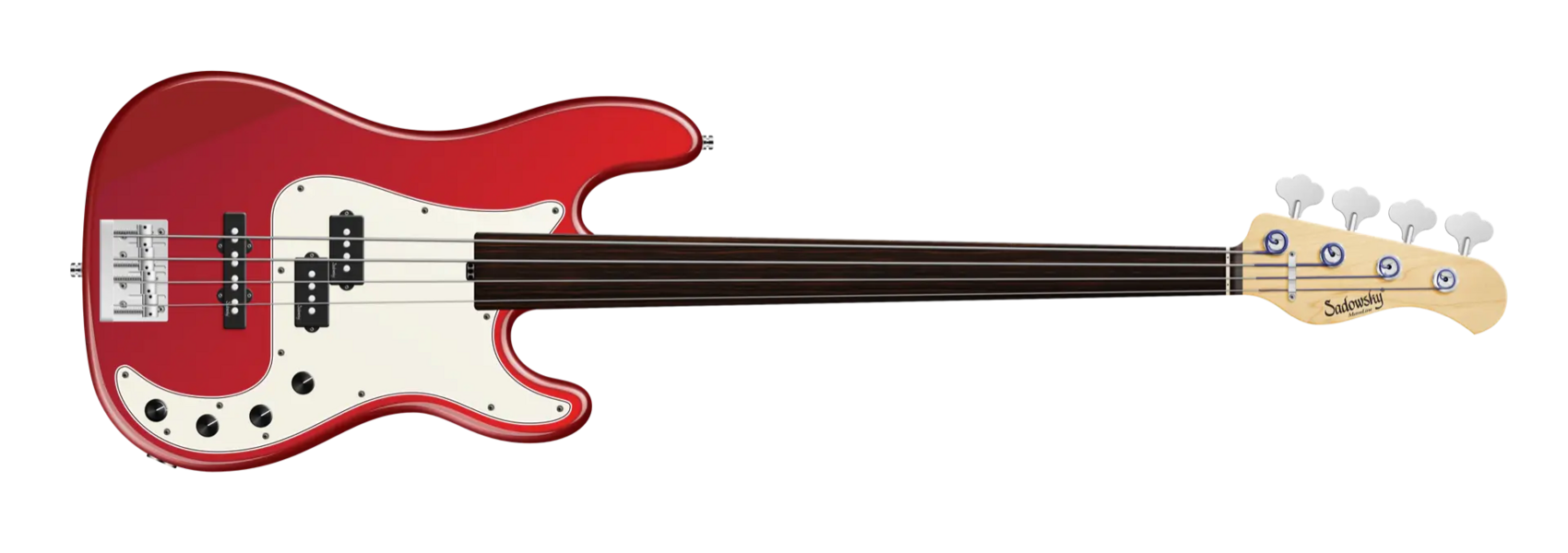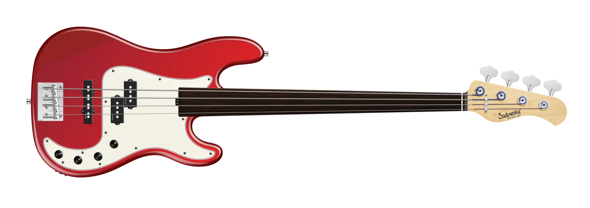 Roger Sadowsky hat es sich zur Aufgabe gemacht ein bereits sehr erfolgreiches Bass-Design noch weiter zu verbessern, indem er eine Reihe von Detailverbesserungen vornahm. Zusammen mit der von ihm entwickelten Elektronik hat er es geschafft, den bekannten P/J-Bass-Sound auf ein neues Level zu heben, so dass man heute von einem typischen Sadowsky Tone sprechen kann: Niemals harsch klingend, mit tiefen, definierten, keinesfalls dumpfen Bässen, präsenten, jedoch nicht aufdringlichen Mitten sowie süßen und luftigen Höhen. Dieser 4-saitige Fretless-Bass, hier in einer Solid Candy Apple Red Metallic High Polish Finish, hat einen P-Style Korpus (chambered) aus amerikanischer Sumpfesche. Der Hals ist aus Ahorn gefertigt und verfügt über ein Tigerstripe Ebony Griffbrett. Besondere Merkmale dieses Basses sind Sadowsky P und J Pickups, aktive Elektronik mit True Bypass, Vintage Tone Control, Treble und Bass Boost. Dieser Bass verfügt außerdem über leichte, offene Sadowsky-Mechaniken und die Sadowsky Quick String Release Bridge. Sadowsky MetroLine 21-Fret Hybrid P/J Bässe werden ausschließlich in Deutschland hergestellt. Das Gewicht dieses Basses beträgt nie mehr als 4,0 kg und sind damit auch für Bassisten interessant, die neben einem modernen Bass-Sound auch eine leichtgewichtige Lösung für die Bühne suchen.