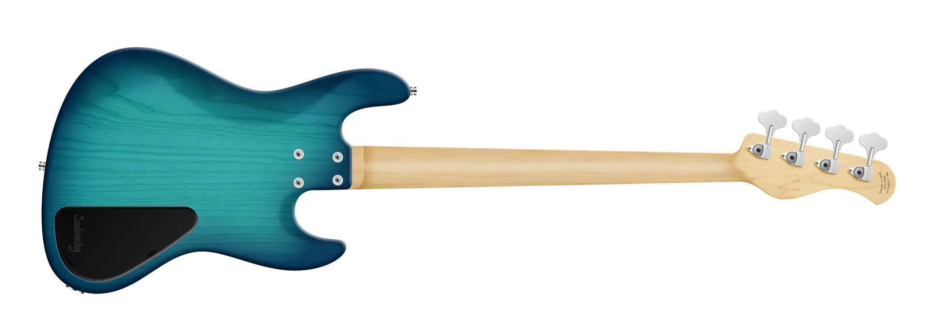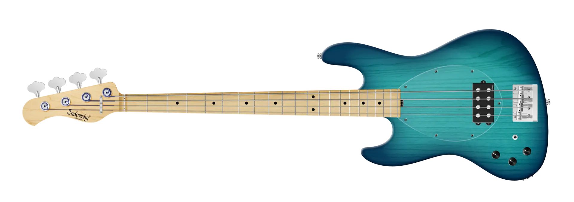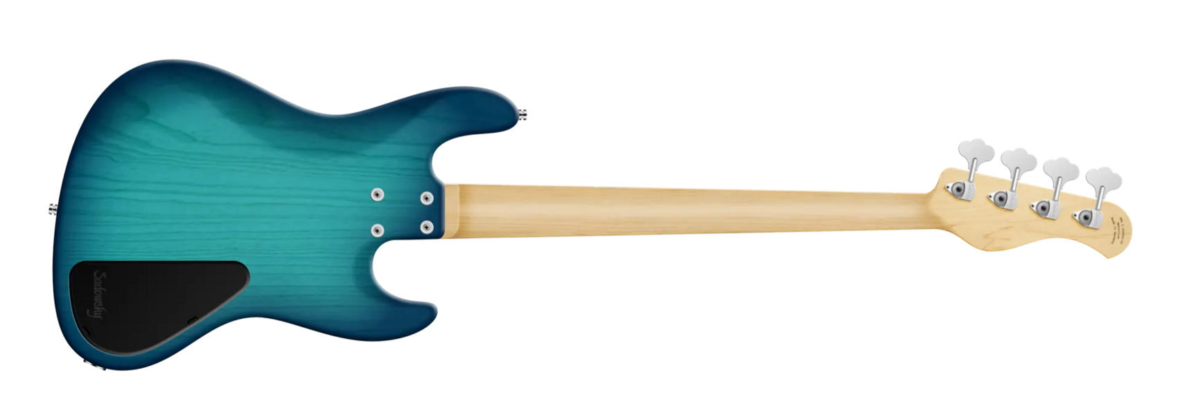 Roger Sadowsky hat es sich zur Aufgabe gemacht, ein bereits sehr erfolgreiches Bass-Design noch weiter zu verbessern, indem er eine Reihe von Detailveränderungen vornahm. Mit der von ihm entwickelten Elektronik hat er es geschafft, den bekannten Vintage M-Bass-Sound auf ein neues Level zu heben, so dass man heute von einem typischen Sadowsky Tone sprechen kann: Niemals harsch klingend, mit tiefen, definierten, keinesfalls dumpfen Bässen, präsenten, jedoch nicht aufdringlichen Mitten sowie süßen und luftigen Höhen. Dieser 4-saitige Linkshänderbass, hier in einer Bora Blue Burst Transparent Satin Lackierung, hat einen leichten, verkleinerten J-Style Korpus (chambered), der aus amerikanischer Sumpfesche gefertigt ist. Der Hals ist aus amerikanischem Ahorn und hat ein Griffbrett aus amerikanischem Ahorn. Besondere Merkmale dieses Basses sind ein Sadowsky M-Tonabnehmer, aktive Elektronik mit True Bypass, Vintage Tone Control, Treble und Bass Boost und ein 3-Wege-Kippschalter für Humbucker-Pickup-Konfiguration (Seriell / Parallel / Single Coil). Dieser Bass verfügt außerdem über leichte, offene Sadowsky-Mechaniken und die Sadowsky Quick String Release Bridge. Sadowsky MetroLine 21-Fret Vintage M Bässe werden ausschließlich in Deutschland hergestellt. Das Gewicht eines Basses beträgt nie mehr als 4,0 kg und ist damit auch für Bassisten interessant, die neben einem modernen Bass-Sound auch eine leichtgewichtige Lösung für die Bühne suchen.