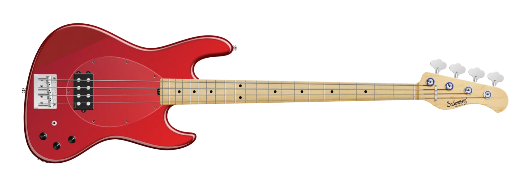 Roger Sadowsky hat es sich zur Aufgabe gemacht, ein bereits sehr erfolgreiches Bass-Design noch weiter zu verbessern, indem er eine Reihe von Detailveränderungen vornahm. Mit der von ihm entwickelten Elektronik hat er es geschafft, den bekannten Vintage M-Bass-Sound auf ein neues Level zu heben, so dass man heute von einem typischen Sadowsky Tone sprechen kann: Niemals harsch klingend, mit tiefen, definierten, keinesfalls dumpfen Bässen, präsenten, jedoch nicht aufdringlichen Mitten sowie süßen und luftigen Höhen. Dieser 4-saitige Bass, hier in einer Solid Candy Apple Red Metallic High Polish Lackierung, hat einen leichten, verkleinerten J-Style Korpus (chambered), der aus amerikanischer Sumpfesche gefertigt ist. Der Hals ist aus amerikanischem Ahorn und hat ein Griffbrett aus amerikanischem Ahorn. Besondere Merkmale dieses Basses sind ein Sadowsky M-Tonabnehmer, aktive Elektronik mit True Bypass, Vintage Tone Control, Treble und Bass Boost und ein 3-Wege-Kippschalter für Humbucker-Pickup-Konfiguration (Seriell / Parallel / Single Coil). Dieser Bass verfügt außerdem über leichte, offene Sadowsky-Mechaniken und die Sadowsky Quick String Release Bridge. Sadowsky MetroLine 21-Fret Vintage M Bässe werden ausschließlich in Deutschland hergestellt. Das Gewicht eines Basses beträgt nie mehr als 4,0 kg und ist damit auch für Bassisten interessant, die neben einem modernen Bass-Sound auch eine leichtgewichtige Lösung für die Bühne suchen.