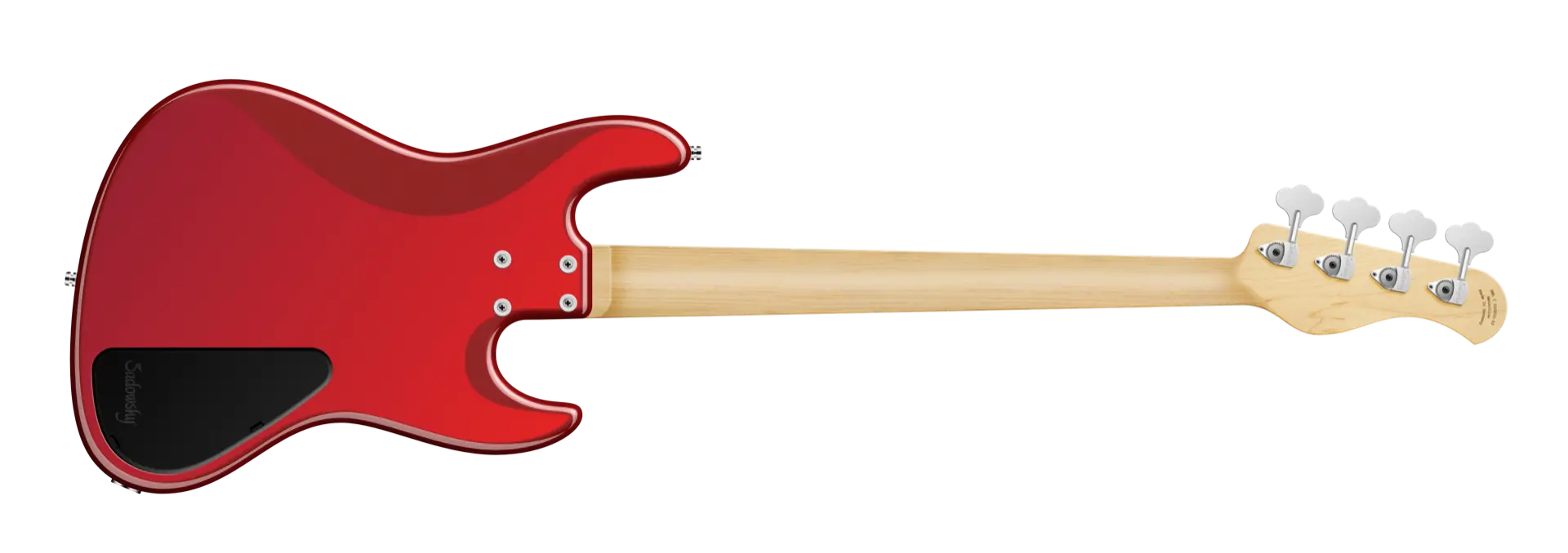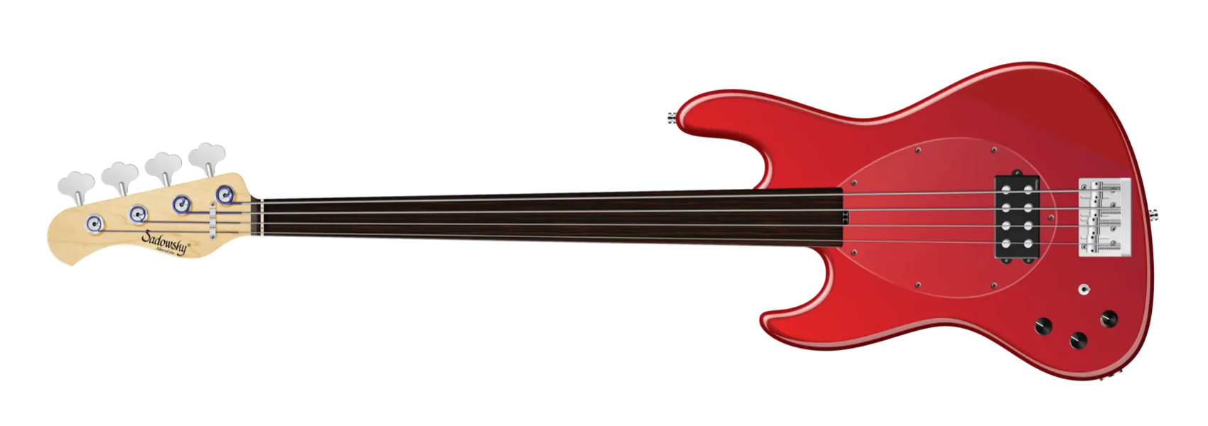 Roger Sadowsky hat es sich zur Aufgabe gemacht, ein bereits sehr erfolgreiches Bass-Design noch weiter zu verbessern, indem er eine Reihe von Detailveränderungen vornahm. Mit der von ihm entwickelten Elektronik hat er es geschafft, den bekannten Vintage M-Bass-Sound auf ein neues Level zu heben, so dass man heute von einem typischen Sadowsky Tone sprechen kann: Niemals harsch klingend, mit tiefen, definierten, keinesfalls dumpfen Bässen, präsenten, jedoch nicht aufdringlichen Mitten sowie süßen und luftigen Höhen. Dieser 4-saitige Fretless Linkshänderbass, hier in einer Solid Candy Apple Red Metallic High Polish Lackierung, hat einen leichten, verkleinerten J-Style Korpus (chambered), der aus amerikanischer Sumpfesche gefertigt ist. Der Hals ist aus amerikanischem Ahorn gefertigt und verfügt über ein Tigerstripe Ebony Griffbrett. Besondere Merkmale dieses Basses sind ein Sadowsky M-Tonabnehmer, aktive Elektronik mit True Bypass, Vintage Tone Control, Treble und Bass Boost und ein 3-Wege-Kippschalter für Humbucker-Pickup-Konfiguration (Seriell / Parallel / Single Coil). Dieser Bass verfügt außerdem über leichte, offene Sadowsky-Mechaniken und die Sadowsky Quick String Release Bridge. Sadowsky MetroLine 21-Fret Vintage M Bässe werden ausschließlich in Deutschland hergestellt. Das Gewicht eines Basses beträgt nie mehr als 4,0 kg und ist damit auch für Bassisten interessant, die neben einem modernen Bass-Sound auch eine leichtgewichtige Lösung für die Bühne suchen.