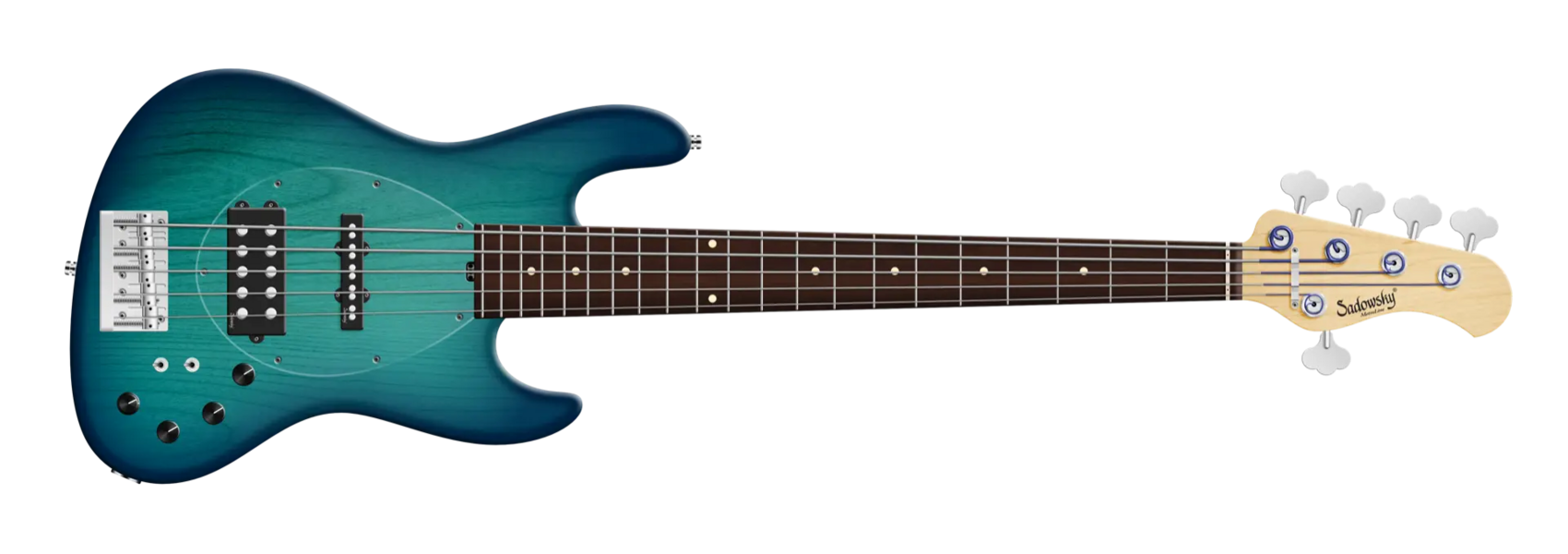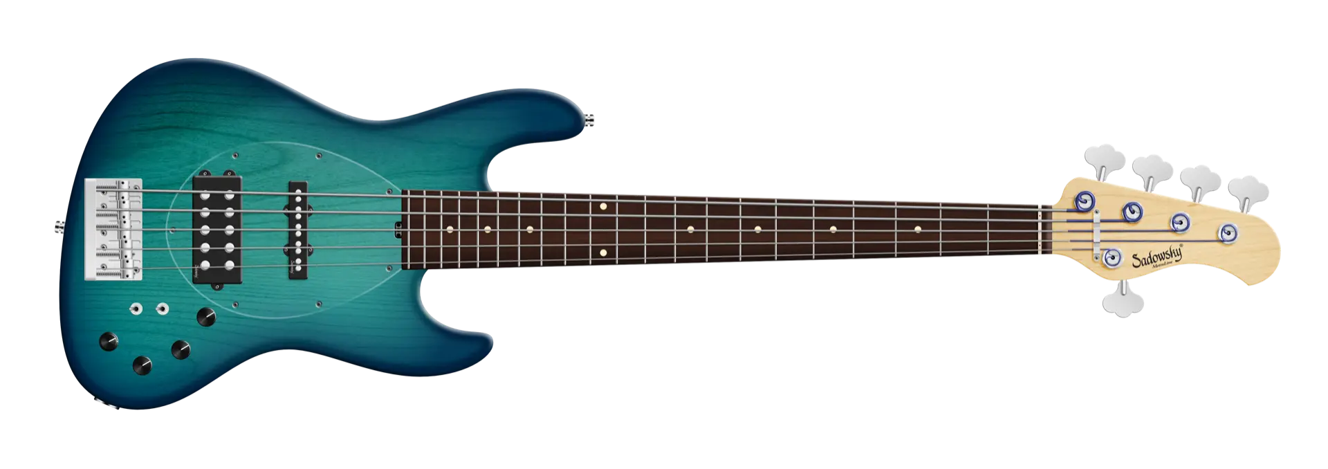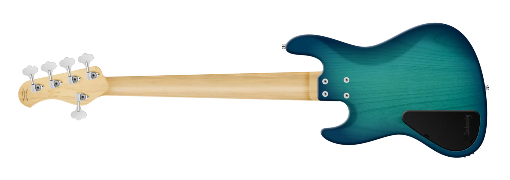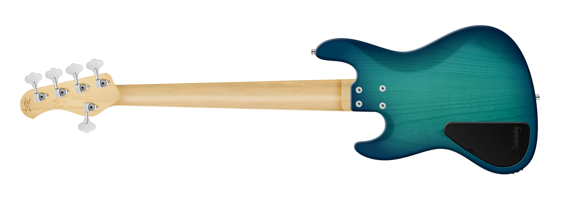 Roger Sadowsky hat es sich zur Aufgabe gemacht, ein bereits sehr erfolgreiches Bass-Design noch weiter zu verbessern, indem er eine Reihe von Detailveränderungen vornahm. Mit der von ihm entwickelten Elektronik hat er es geschafft, den bekannten M/J-Bass-Sound auf ein neues Level zu heben, so dass man heute von einem typischen Sadowsky Tone sprechen kann: Niemals harsch klingend, mit tiefen, definierten, keinesfalls dumpfen Bässen, präsenten, jedoch nicht aufdringlichen Mitten sowie süßen und luftigen Höhen. Dieser 5-saitige Bass, hier in einer Bora Blue Burst Transparent Satin Lackierung, hat einen leichten, verkleinerten J-Style Korpus (chambered), der aus amerikanischer Roterle gefertigt ist. Der Hals ist aus amerikanischem Ahorn gefertigt und verfügt über ein Morado (Pau Ferro) Griffbrett. Besondere Merkmale dieses Basses sind Sadowsky M und J Pickups, aktive Elektronik mit True Bypass, Vintage Tone Control, Treble und Bass Boost und zwei 3-Wege-Kippschalter für Pickup-Konfiguration (Seriell / Parallel / Single Coil). Dieser Bass verfügt außerdem über leichte, offene Sadowsky-Mechaniken und die Sadowsky Quick String Release Bridge. Sadowsky MetroLine 21-Fret Vintage M/J Bässe werden ausschließlich in Deutschland hergestellt. Das Gewicht eines Basses beträgt nie mehr als 4,0 kg und ist damit auch für Bassisten interessant, die neben einem modernen Bass-Sound auch eine leichtgewichtige Lösung für die Bühne suchen.