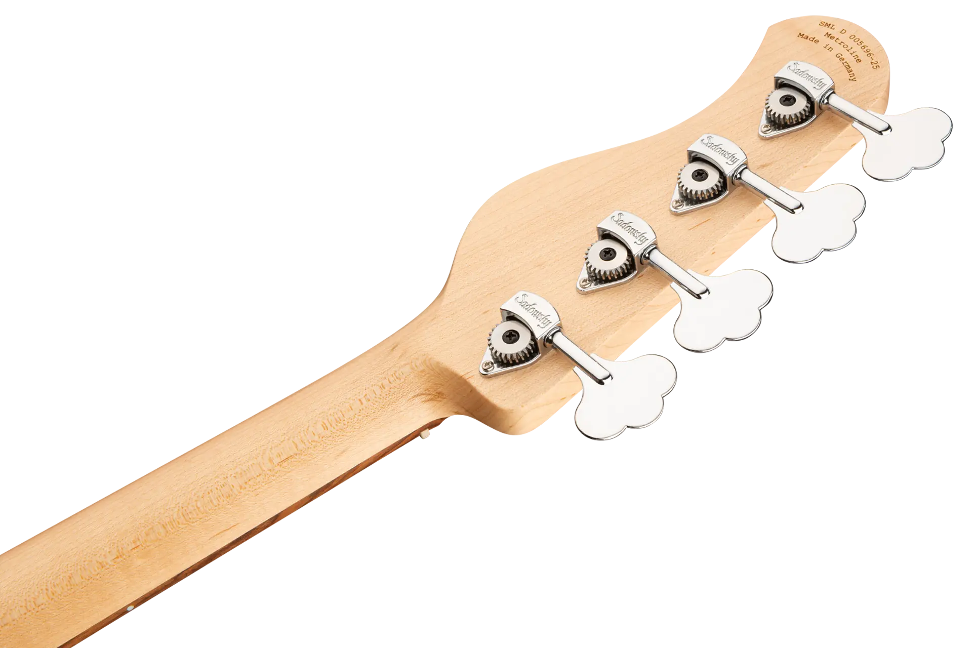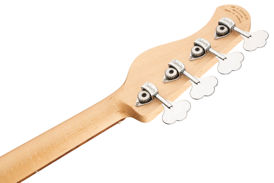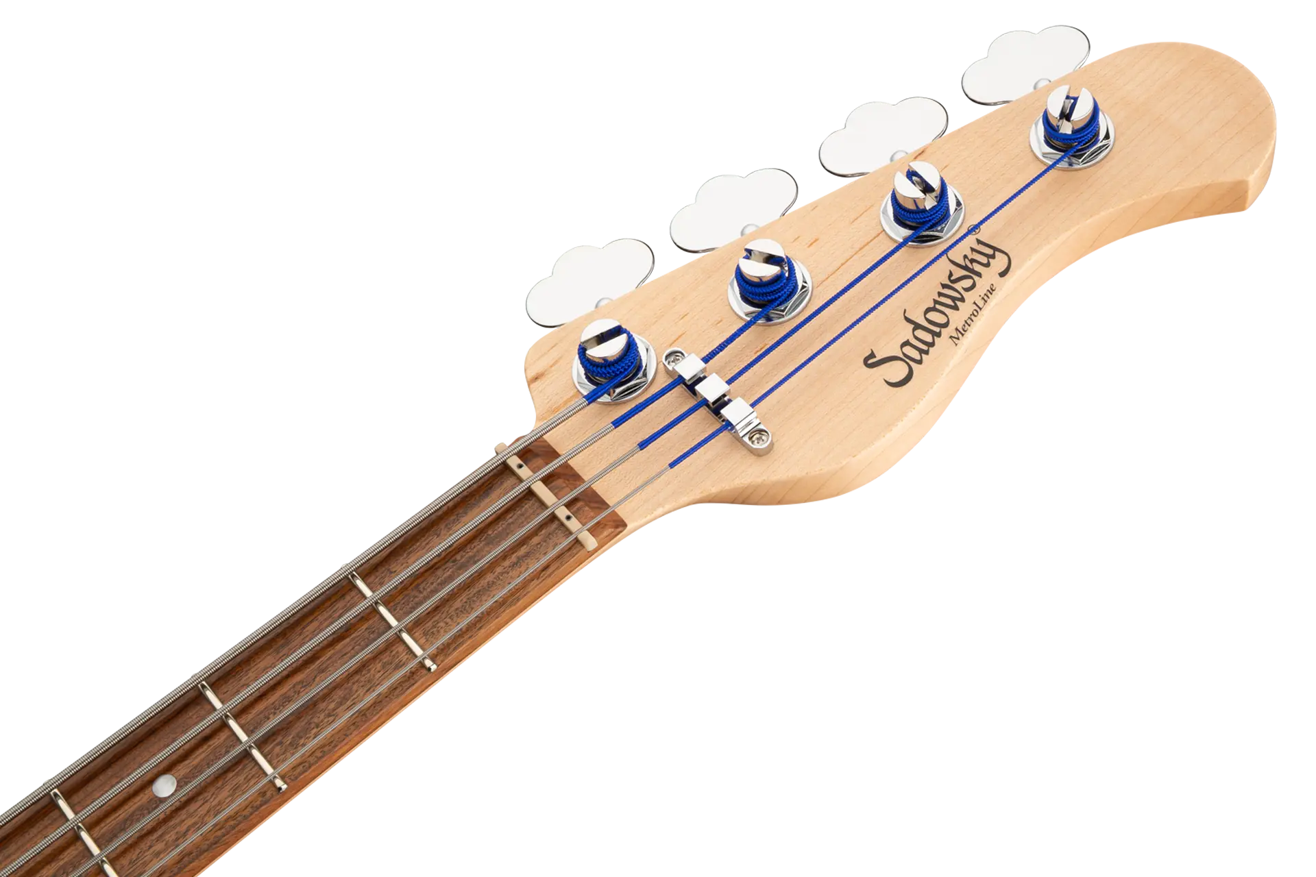 Der Sadowsky MetroLine 24-Fret Modern Bass ist perfekt für alle Spieler, die einen Bass in moderner Optik und dem berühmten Sadowsky-Ton suchen: Niemals harsch oder schrill klingend, mit starken, kraftvollen, aber nie matschigen Bässen, mit präsenten, aber nicht zu aggressiven Mitten und einem süßen und luftigen Höhenbereich. Der 4-saitige Bass hat einen Korpus aus amerikanischer Roterle (chambered). Hier in einer Nirvana Black Transparent Satin-Lackierung zu sehen, ist die Korpusform schlank und unterdimensioniert mit tieferen Cutaways für bessere Bespielbarkeit und einen vollen Tonumfang von zwei Oktaven. Der Hals ist aus amerikanischem Ahorn gefertigt und hat ein Morado (Pau Ferro) Griffbrett mit 24 Neusilberbünden. Dieser Bass ist mit zwei passiven Sadowsky Soapbar-Tonabnehmern ausgestattet, beide in moderner Position, und verfügt über eine aktive Elektronik, die True Bypass, Vintage Tone Control sowie Treble- und Bass-Boost bietet. Die Hardware umfasst Sadowsky Light Open Gear Mechaniken und eine Sadowsky Quick String Release Brücke. Jeder Sadowsky MetroLine 24-Fret Modern Bass wird ausschließlich in unserer Werkstatt in Deutschland gefertigt und wiegt nicht mehr als 4,0 kg. Eine gute Wahl für Bassisten, die auf der Suche nach einem leichten, modern aussehenden Bass mit dem speziellen modernen Sadowsky-Sound sind.