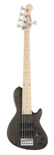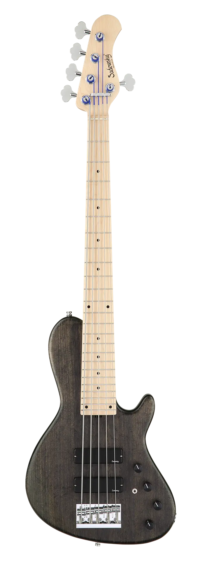Der Sadowsky MetroLine 24-Fret Single Cut 5-saitiger Bass verfügt über einen schlanken, unterdimensionierten Korpus im Single-Cut-Stil aus amerikanischer Sumpfesche (chambered) mit einer Nirvana Black Transparent Satin-Lackierung. Der Hals ist aus amerikanischem Ahorn und hat ein Griffbrett aus amerikanischem Ahorn. Zu den besonderen Merkmalen dieses Basses gehören Sadowsky Soapbar Pickups sowie Rogers berühmte Elektronik mit einem Preamp mit schaltbarem Mid-Boost und Trim-Poti (wahlweise 500 oder 800 Hz, schmal- oder breitbandig), Vintage Tone Control und einem Preamp Bypass. Zu den Reglern gehören Volume, Balance, VTC (P/P), Treble und Bass. Die Hardware umfasst eine Sadowsky Quick String Release Bridge und leichte, offene Sadowsky Mechaniken. Ein Sadowsky MetroLine 24-Fret Single Cut Bass wird ausschließlich in Deutschland hergestellt und wiegt nie mehr als 4,0 kg. Er ist eine gute Wahl für Spieler, die einen leichten Single-Cut-Bass mit dem berühmten Sadowsky Sound suchen: ein starker, kraftvoller Bass, der nie matschig ist. Mitten, die präsent, aber nicht zu aggressiv sind, und ein süßer und luftiger Höhenbereich.