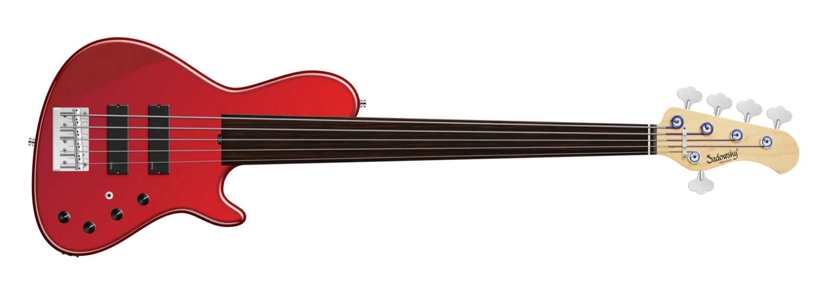 Der Sadowsky MetroLine 24-Fret Single Cut 5-saitiger Bass verfügt über einen schlanken, unterdimensionierten Korpus im Single-Cut-Stil aus amerikanischer Sumpfesche (chambered) mit einer Solid Candy Apple Red Metallic High Polish-Lackierung. Der Hals ist aus amerikanischem Ahorn gefertigt und mit einem Tigerstripe Ebony Griffbrett ausgestattet. Zu den besonderen Merkmalen dieses Basses gehören Sadowsky Soapbar Pickups sowie Rogers berühmte Elektronik mit einem Preamp mit schaltbarem Mid-Boost und Trim-Poti (wahlweise 500 oder 800 Hz, schmal- oder breitbandig), Vintage Tone Control und einem Preamp Bypass. Zu den Reglern gehören Volume, Balance, VTC (P/P), Treble und Bass. Die Hardware umfasst eine Sadowsky Quick String Release Bridge und leichte, offene Sadowsky Mechaniken. Ein Sadowsky MetroLine 24-Fret Single Cut Bass wird ausschließlich in Deutschland hergestellt und wiegt nie mehr als 4,0 kg. Er ist eine gute Wahl für Spieler, die einen leichten Single-Cut-Bass mit dem berühmten Sadowsky Sound suchen: ein starker, kraftvoller Bass, der nie matschig ist. Mitten, die präsent, aber nicht zu aggressiv sind, und ein süßer und luftiger Höhenbereich.