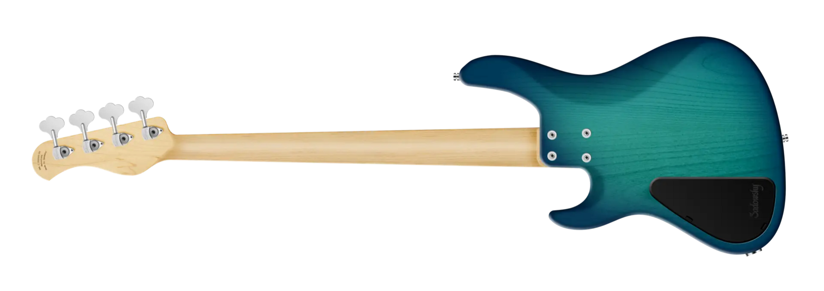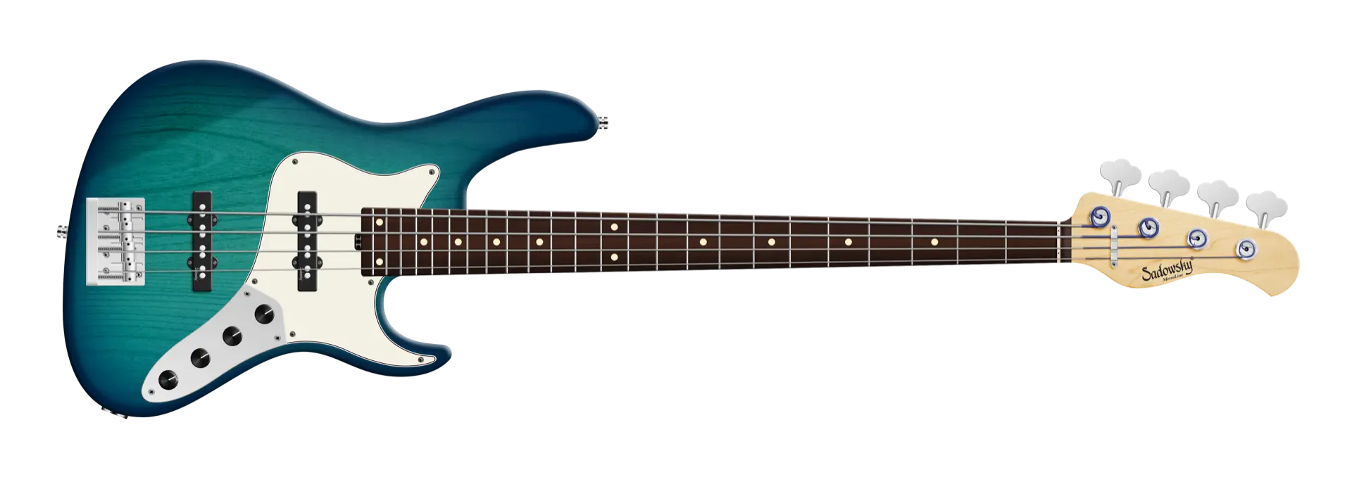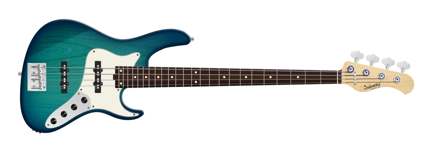 Der Sadowsky MetroLine 24-Fret Vintage J/J Bass ist eine Hommage an Roger Sadowskys Fähigkeit, ein bereits erfolgreiches Bassdesign durch eine Reihe von Detailveränderungen erheblich zu verbessern, was zu dem speziellen Sadowsky-Basston führt: Niemals harsch oder schrill klingend, mit starken, kraftvollen, aber niemals matschigen Bässen. Präsent, aber nicht zu aggressiv in den Mitten, und mit süßen und luftigen Höhen. Dieser 4-saitige Bass hat einen schlanken, unterdimensionierten, J-Style-Korpus aus amerikanischer Roterle (chambered), der mit einer Bora Blue Burst Transparent Satin-Lackierung versehen ist. Er ist mit Sadowsky J-Style Pickups und aktiver Elektronik mit True Bypass, Vintage Tone Control und Treble/Bass Boost ausgestattet. Der amerikanische Ahorn Hals hat ein Morado (Pau Ferro) Griffbrett mit 24 Neusilber-Bünden. Die Hardware umfasst ultraleichte Sadowsky Mechaniken und die spezielle Sadowsky Quick String Release Brücke. Ein Sadowsky MetroLine 24-Fret Vintage J/J Bass, der ausschließlich in Deutschland hergestellt wird, wiegt nie mehr als 4,0 kg / 8,9 lbs. Er ist eine ausgezeichnete Wahl für Bassisten, die ein leichtes Instrument mit einem modernen Bass-Sound suchen.
