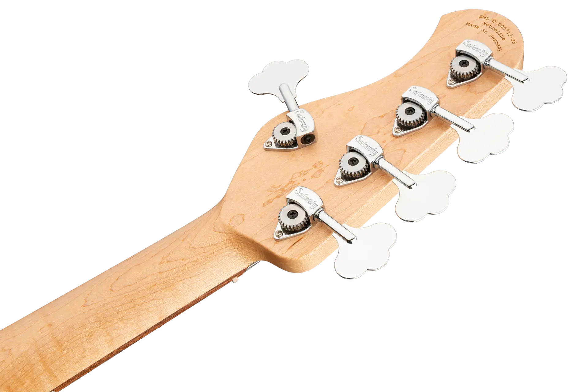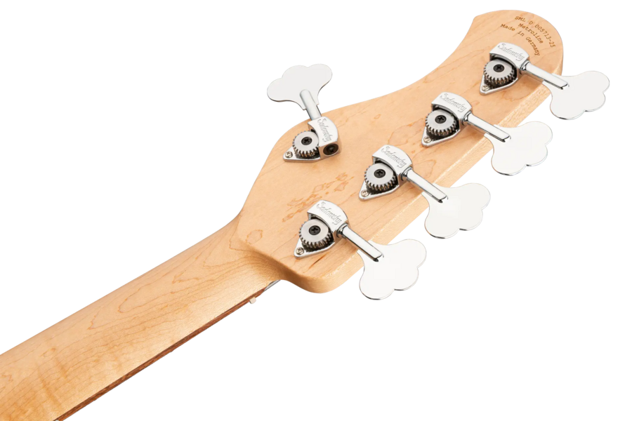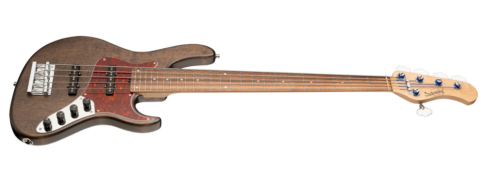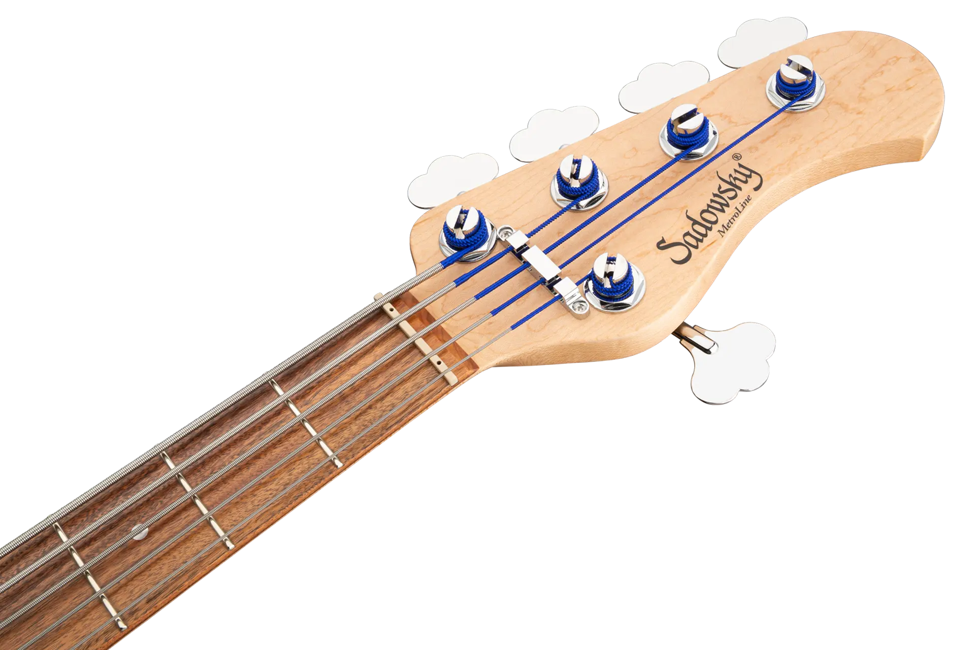 Der Sadowsky MetroLine 24-Fret Vintage J/J Bass ist eine Hommage an Roger Sadowskys Fähigkeit, ein bereits erfolgreiches Bassdesign durch eine Reihe von Detailveränderungen erheblich zu verbessern, was zu dem speziellen Sadowsky-Basston führt: Niemals harsch oder schrill klingend, mit starken, kraftvollen, aber niemals matschigen Bässen. Präsent, aber nicht zu aggressiv in den Mitten, und mit süßen und luftigen Höhen. Dieser 5-saitige Bass hat einen schlanken, unterdimensionierten, J-Style-Korpus aus amerikanischer Roterle (chambered), der mit einer Nirvana Black Transparent Satin-Lackierung versehen ist. Er ist mit Sadowsky J-Style Pickups und aktiver Elektronik mit True Bypass, Vintage Tone Control und Treble/Bass Boost ausgestattet. Der amerikanische Ahorn Hals hat ein Morado (Pau Ferro) Griffbrett mit 24 Neusilber-Bünden. Die Hardware umfasst ultraleichte Sadowsky Mechaniken und die spezielle Sadowsky Quick String Release Brücke. Ein Sadowsky MetroLine 24-Fret Vintage J/J Bass, der ausschließlich in Deutschland hergestellt wird, wiegt nie mehr als 4,0 kg / 8,9 lbs. Er ist eine ausgezeichnete Wahl für Bassisten, die ein leichtes Instrument mit einem modernen Bass-Sound suchen.