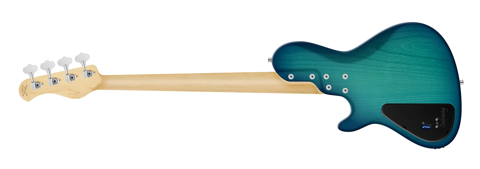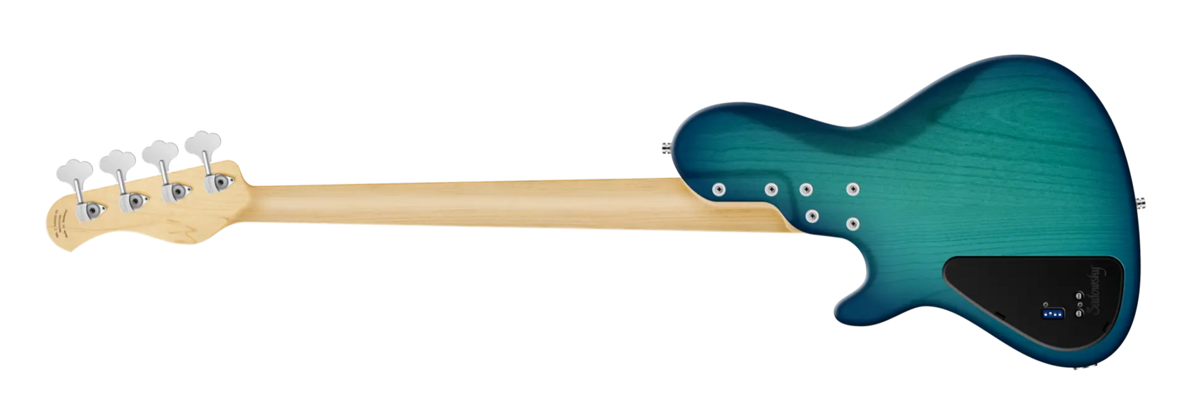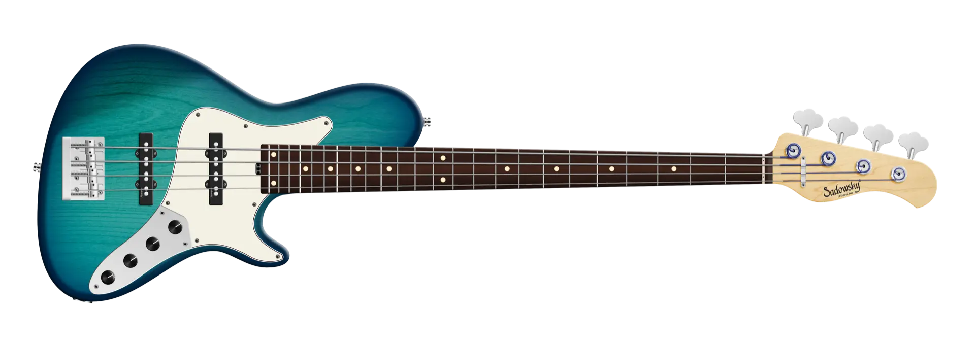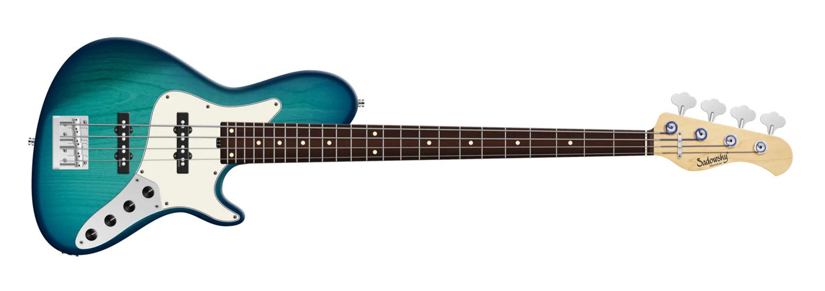 Der Sadowsky MetroLine 24-Fret Vintage Single Cut 4-saitiger Bass verfügt über einen schlanken, unterdimensionierten Korpus im Single-Cut-Stil aus amerikanischer Roterle (chambered) mit einer Bora Blue Burst Transparent Satin-Lackierung. Der Hals ist aus amerikanischem Ahorn gefertigt und mit einem Morado (Pau Ferro) Griffbrett ausgestattet. Zu den besonderen Merkmalen dieses Basses gehören Sadowsky J-Style Pickups sowie Rogers berühmte Elektronik mit einem Preamp mit schaltbarem Mid-Boost und Trim-Poti (wahlweise 500 oder 800 Hz, schmal- oder breitbandig), Vintage Tone Control und einem Preamp Bypass. Zu den Reglern gehören Volume, Balance, VTC (P/P), Treble und Bass. Die Hardware umfasst eine Sadowsky Quick String Release Bridge und leichte, offene Sadowsky Mechaniken. Ein Sadowsky MetroLine 24-Fret Vintage Single Cut Bass wird ausschließlich in Deutschland hergestellt und wiegt nie mehr als 4,0 kg. Er ist eine gute Wahl für Spieler, die einen leichten Single-Cut-Bass mit dem berühmten Sadowsky Sound suchen: ein starker, kraftvoller Bass, der nie matschig ist. Mitten, die präsent, aber nicht zu aggressiv sind, und ein süßer und luftiger Höhenbereich.