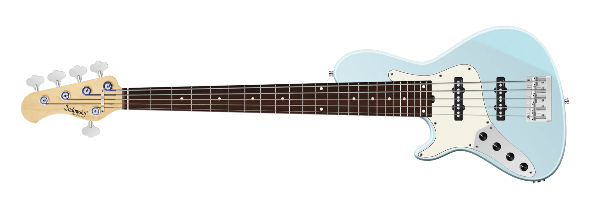 Der Sadowsky MetroLine 24-Fret Vintage Single Cut 5-saitiger Linkshänder-Bass verfügt über einen schlanken, unterdimensionierten Korpus im Single-Cut-Stil aus amerikanischer Roterle (chambered) mit einer Solid Ice Blue Metallic Satin-Lackierung. Der Hals ist aus amerikanischem Ahorn gefertigt und mit einem Morado (Pau Ferro) Griffbrett ausgestattet. Zu den besonderen Merkmalen dieses Basses gehören Sadowsky J-Style Pickups sowie Rogers berühmte Elektronik mit einem Preamp mit schaltbarem Mid-Boost und Trim-Poti (wahlweise 500 oder 800 Hz, schmal- oder breitbandig), Vintage Tone Control und einem Preamp Bypass. Zu den Reglern gehören Volume, Balance, VTC (P/P), Treble und Bass. Die Hardware umfasst eine Sadowsky Quick String Release Bridge und leichte, offene Sadowsky Mechaniken. Ein Sadowsky MetroLine 24-Fret Vintage Single Cut Bass wird ausschließlich in Deutschland hergestellt und wiegt nie mehr als 4,0 kg. Er ist eine gute Wahl für Spieler, die einen leichten Single-Cut-Bass mit dem berühmten Sadowsky Sound suchen: ein starker, kraftvoller Bass, der nie matschig ist. Mitten, die präsent, aber nicht zu aggressiv sind, und ein süßer und luftiger Höhenbereich.
