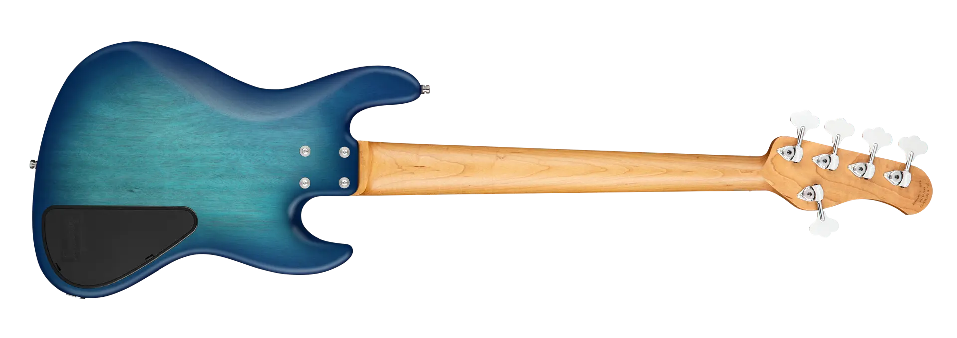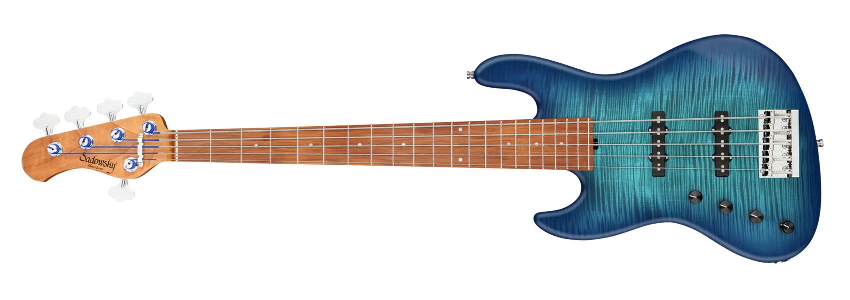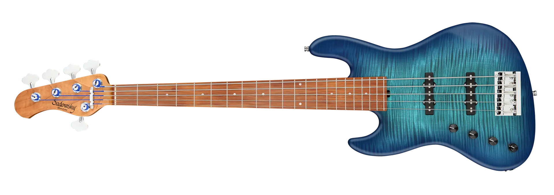 Der Sadowsky MetroLine Deluxe 21-Fret Standard J/J Bass bringt einen neuen Aspekt zu einem bereits fantastischen Sadowsky Bass: einen leichten Okoume Holzkörper mit einer wunderschönen geflammten Ahorndecke und einem gerösteten Ahornhals. Dieser Bass sieht nicht nur fantastisch aus, er spielt sich auch wunderbar! Klanglich sorgt die berühmte Sadowsky-Elektronik für den speziellen Sadowsky-Sound: Niemals harsch oder schrill klingend, mit starken, kraftvollen (aber niemals matschigen!) Bässen, Mitten, die präsent, aber nicht zu aggressiv sind, und einem süßen und luftigen Höhenbereich. Diese 5-saitige Linkshänder-Version hat eine schlanke, unterdimensionierte J-Korpusform (chambered) und ist mit einem Bora Blue Burst Transparent Satin Finish versehen. Der Hals aus geröstetem amerikanischen Ahorn ist mit einem Morado (Pau Ferro) Griffbrett ausgestattet. Zu den besonderen Merkmalen dieses Basses gehören zwei brummfreie Sadowsky J-Style-Tonabnehmer, eine aktive Elektronik mit True Bypass, Treble- und Bass-Boost und Vintage Tone Control. Außerdem verfügt er über leichte, offene Sadowsky-Mechaniken und eine Sadowsky Quick String Release Bridge. Dieser Bass wird ausschließlich in unserer Werkstatt in Deutschland hergestellt und wiegt nie mehr als 4,0 kg. Eine gute Wahl für Bassisten, die einen schönen und leichten Bass suchen, der einen modernen Bass-Sound bietet.