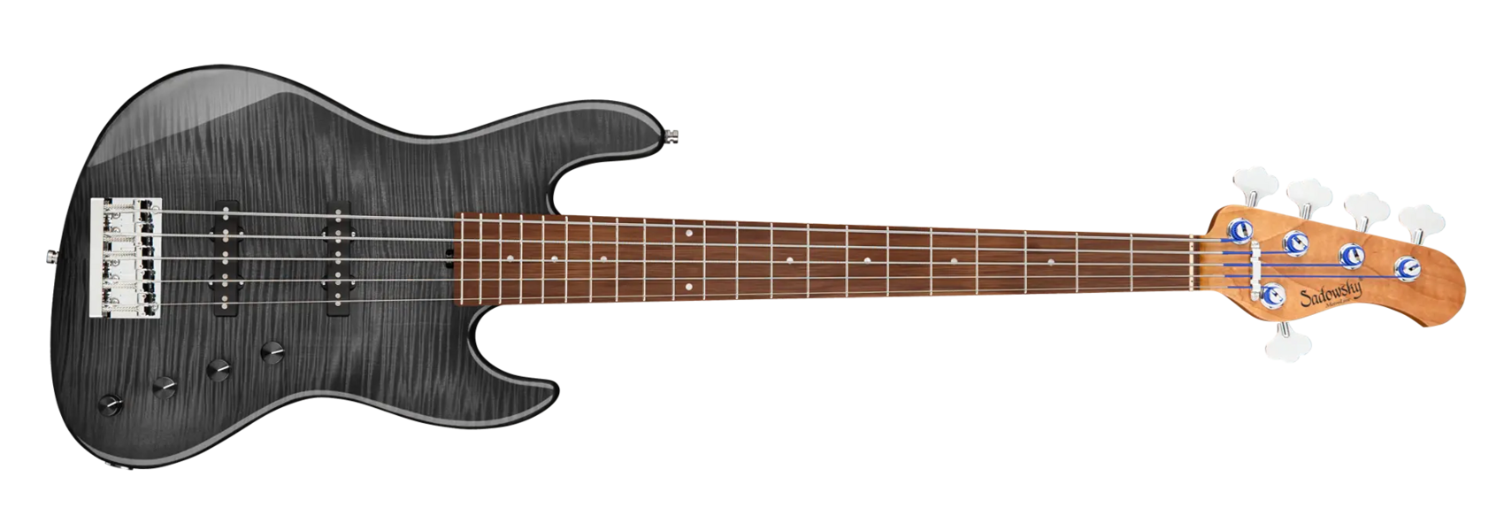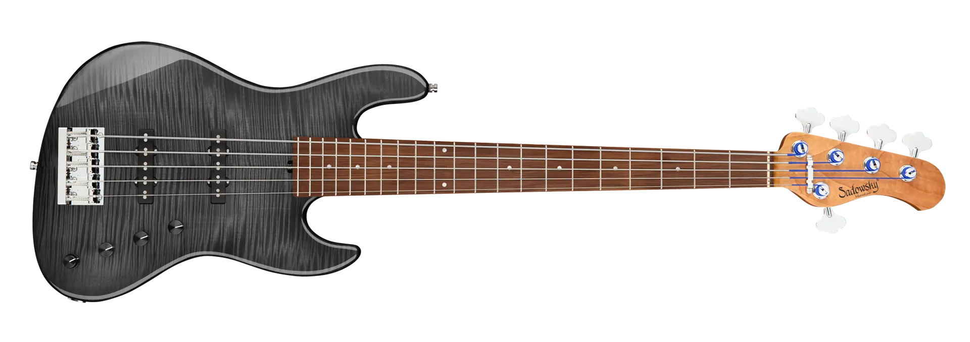 Der Sadowsky MetroLine Deluxe 21-Fret Standard J/J Bass bringt einen neuen Aspekt zu einem bereits fantastischen Sadowsky Bass: einen leichten Okoume Holzkörper mit einer wunderschönen geflammten Ahorndecke und einem gerösteten Ahornhals. Dieser Bass sieht nicht nur fantastisch aus, er spielt sich auch wunderbar! Klanglich sorgt die berühmte Sadowsky-Elektronik für den speziellen Sadowsky-Sound: Niemals harsch oder schrill klingend, mit starken, kraftvollen (aber niemals matschigen!) Bässen, Mitten, die präsent, aber nicht zu aggressiv sind, und einem süßen und luftigen Höhenbereich. Diese 5-saitige Version hat eine schlanke, unterdimensionierte J-Korpusform (chambered) und ist mit einem Nirvana Black Transparent High Polish Finish versehen. Der Hals aus geröstetem amerikanischen Ahorn ist mit einem Morado (Pau Ferro) Griffbrett ausgestattet. Zu den besonderen Merkmalen dieses Basses gehören zwei brummfreie Sadowsky J-Style-Tonabnehmer, eine aktive Elektronik mit True Bypass, Treble- und Bass-Boost und Vintage Tone Control. Außerdem verfügt er über leichte, offene Sadowsky-Mechaniken und eine Sadowsky Quick String Release Bridge. Dieser Bass wird ausschließlich in unserer Werkstatt in Deutschland hergestellt und wiegt nie mehr als 4,0 kg. Eine gute Wahl für Bassisten, die einen schönen und leichten Bass suchen, der einen modernen Bass-Sound bietet.