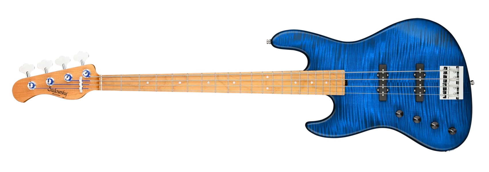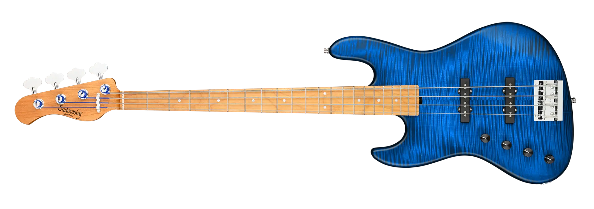 Der Sadowsky MetroLine Deluxe 21-Fret Standard J/J Bass bringt einen neuen Aspekt zu einem bereits fantastischen Sadowsky Bass: einen leichten Okoume Holzkörper mit einer wunderschönen geflammten Ahorndecke und einem gerösteten Ahornhals. Dieser Bass sieht nicht nur fantastisch aus, er spielt sich auch wunderbar! Klanglich sorgt die berühmte Sadowsky-Elektronik für den speziellen Sadowsky-Sound: Niemals harsch oder schrill klingend, mit starken, kraftvollen (aber niemals matschigen!) Bässen, Mitten, die präsent, aber nicht zu aggressiv sind, und einem süßen und luftigen Höhenbereich. Diese 4-saitige Linkshänder-Version hat eine schlanke, unterdimensionierte J-Korpusform (chambered) und ist mit einem Ocean Blue Transparent Satin Finish versehen. Der Hals aus geröstetem amerikanischen Ahorn ist mit einem Griffbrett aus geröstetem amerikanischen Ahorn ausgestattet. Zu den besonderen Merkmalen dieses Basses gehören zwei brummfreie Sadowsky J-Style-Tonabnehmer, eine aktive Elektronik mit True Bypass, Treble- und Bass-Boost und Vintage Tone Control. Außerdem verfügt er über leichte, offene Sadowsky-Mechaniken und eine Sadowsky Quick String Release Bridge. Dieser Bass wird ausschließlich in unserer Werkstatt in Deutschland hergestellt und wiegt nie mehr als 4,0 kg. Eine gute Wahl für Bassisten, die einen schönen und leichten Bass suchen, der einen modernen Bass-Sound bietet.
