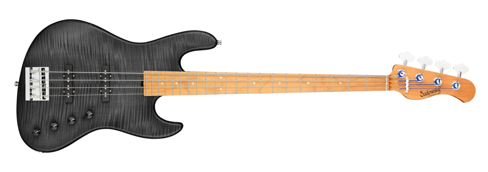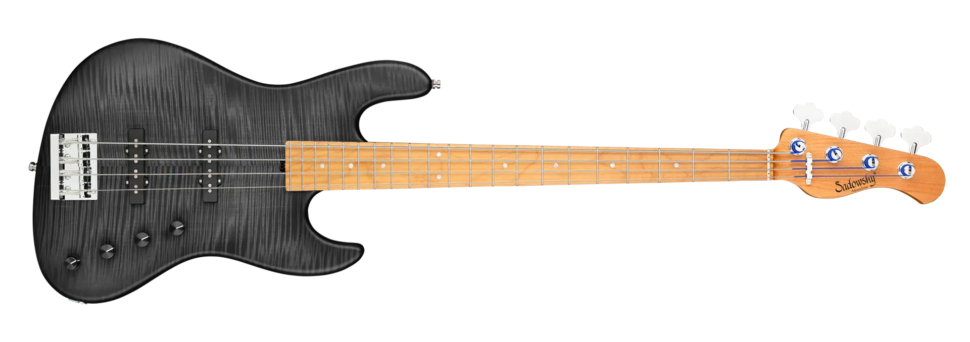 Der Sadowsky MetroLine Deluxe 21-Fret Standard J/J Bass bringt einen neuen Aspekt zu einem bereits fantastischen Sadowsky Bass: einen leichten Okoume Holzkörper mit einer wunderschönen geflammten Ahorndecke und einem gerösteten Ahornhals. Dieser Bass sieht nicht nur fantastisch aus, er spielt sich auch wunderbar! Klanglich sorgt die berühmte Sadowsky-Elektronik für den speziellen Sadowsky-Sound: Niemals harsch oder schrill klingend, mit starken, kraftvollen (aber niemals matschigen!) Bässen, Mitten, die präsent, aber nicht zu aggressiv sind, und einem süßen und luftigen Höhenbereich. Diese 4-saitige Version hat eine schlanke, unterdimensionierte J-Korpusform (chambered) und ist mit einem Nirvana Black Transparent Satin Finish versehen. Der Hals aus geröstetem amerikanischen Ahorn ist mit einem Griffbrett aus geröstetem amerikanischen Ahorn ausgestattet. Zu den besonderen Merkmalen dieses Basses gehören zwei brummfreie Sadowsky J-Style-Tonabnehmer, eine aktive Elektronik mit True Bypass, Treble- und Bass-Boost und Vintage Tone Control. Außerdem verfügt er über leichte, offene Sadowsky-Mechaniken und eine Sadowsky Quick String Release Bridge. Dieser Bass wird ausschließlich in unserer Werkstatt in Deutschland hergestellt und wiegt nie mehr als 4,0 kg. Eine gute Wahl für Bassisten, die einen schönen und leichten Bass suchen, der einen modernen Bass-Sound bietet.