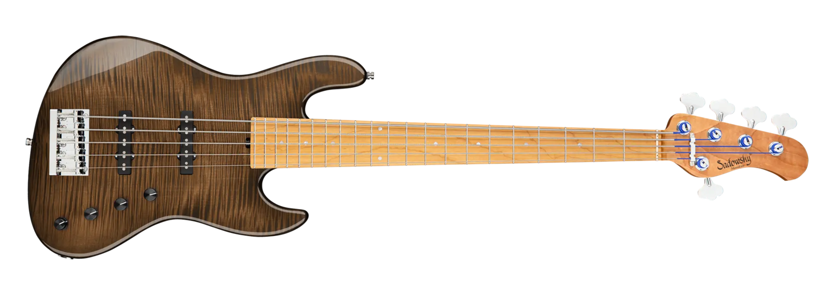 Der Sadowsky MetroLine Deluxe 21-Fret Standard J/J Bass bringt einen neuen Aspekt zu einem bereits fantastischen Sadowsky Bass: einen leichten Okoume Holzkörper mit einer wunderschönen geflammten Ahorndecke und einem gerösteten Ahornhals. Dieser Bass sieht nicht nur fantastisch aus, er spielt sich auch wunderbar! Klanglich sorgt die berühmte Sadowsky-Elektronik für den speziellen Sadowsky-Sound: Niemals harsch oder schrill klingend, mit starken, kraftvollen (aber niemals matschigen!) Bässen, Mitten, die präsent, aber nicht zu aggressiv sind, und einem süßen und luftigen Höhenbereich. Diese 5-saitige Version hat eine schlanke, unterdimensionierte J-Korpusform (chambered) und ist mit einem Antique Tobacco Transparent High Polish Finish versehen. Der Hals aus geröstetem amerikanischen Ahorn ist mit einem Griffbrett aus geröstetem amerikanischen Ahorn ausgestattet. Zu den besonderen Merkmalen dieses Basses gehören zwei brummfreie Sadowsky J-Style-Tonabnehmer, eine aktive Elektronik mit True Bypass, Treble- und Bass-Boost und Vintage Tone Control. Außerdem verfügt er über leichte, offene Sadowsky-Mechaniken und eine Sadowsky Quick String Release Bridge. Dieser Bass wird ausschließlich in unserer Werkstatt in Deutschland hergestellt und wiegt nie mehr als 4,0 kg. Eine gute Wahl für Bassisten, die einen schönen und leichten Bass suchen, der einen modernen Bass-Sound bietet.