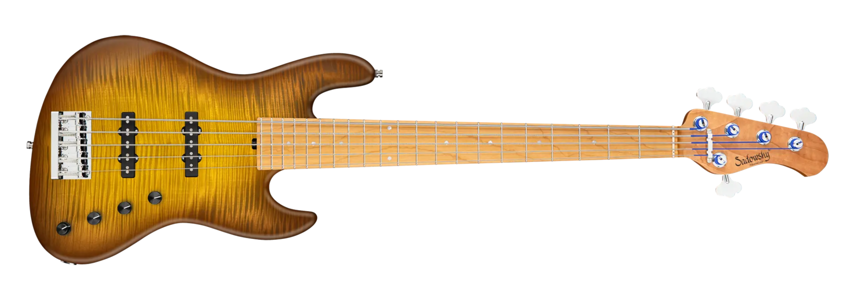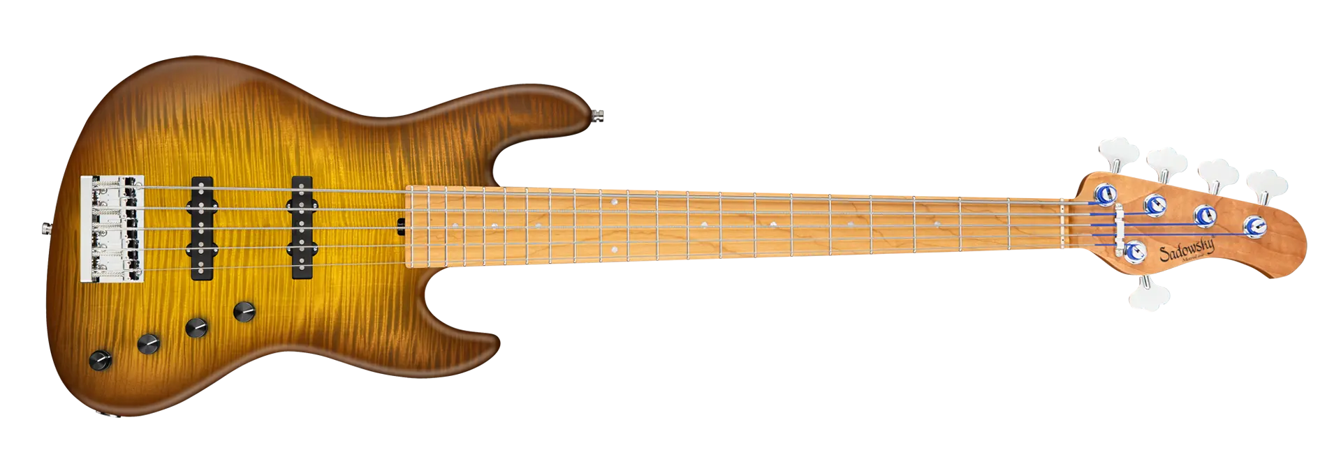 Der Sadowsky MetroLine Deluxe 21-Fret Standard J/J Bass bringt einen neuen Aspekt zu einem bereits fantastischen Sadowsky Bass: einen leichten Okoume Holzkörper mit einer wunderschönen geflammten Ahorndecke und einem gerösteten Ahornhals. Dieser Bass sieht nicht nur fantastisch aus, er spielt sich auch wunderbar! Klanglich sorgt die berühmte Sadowsky-Elektronik für den speziellen Sadowsky-Sound: Niemals harsch oder schrill klingend, mit starken, kraftvollen (aber niemals matschigen!) Bässen, Mitten, die präsent, aber nicht zu aggressiv sind, und einem süßen und luftigen Höhenbereich. Diese 5-saitige Version hat eine schlanke, unterdimensionierte J-Korpusform (chambered) und ist mit einem Caramel Burst Transparent Satin Finish versehen. Der Hals aus geröstetem amerikanischen Ahorn ist mit einem Griffbrett aus geröstetem amerikanischen Ahorn ausgestattet. Zu den besonderen Merkmalen dieses Basses gehören zwei brummfreie Sadowsky J-Style-Tonabnehmer, eine aktive Elektronik mit True Bypass, Treble- und Bass-Boost und Vintage Tone Control. Außerdem verfügt er über leichte, offene Sadowsky-Mechaniken und eine Sadowsky Quick String Release Bridge. Dieser Bass wird ausschließlich in unserer Werkstatt in Deutschland hergestellt und wiegt nie mehr als 4,0 kg. Eine gute Wahl für Bassisten, die einen schönen und leichten Bass suchen, der einen modernen Bass-Sound bietet.
