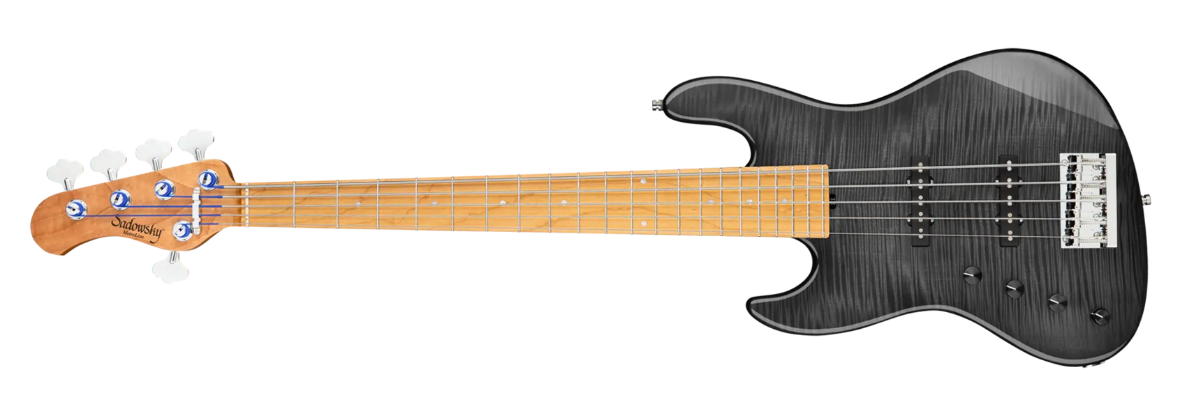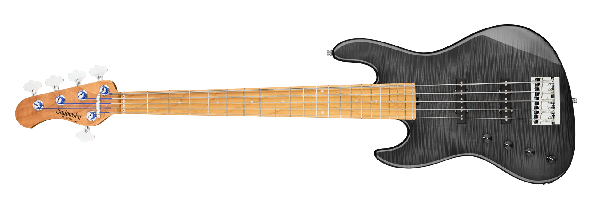 Der Sadowsky MetroLine Deluxe 21-Fret Standard J/J Bass bringt einen neuen Aspekt zu einem bereits fantastischen Sadowsky Bass: einen leichten Okoume Holzkörper mit einer wunderschönen geflammten Ahorndecke und einem gerösteten Ahornhals. Dieser Bass sieht nicht nur fantastisch aus, er spielt sich auch wunderbar! Klanglich sorgt die berühmte Sadowsky-Elektronik für den speziellen Sadowsky-Sound: Niemals harsch oder schrill klingend, mit starken, kraftvollen (aber niemals matschigen!) Bässen, Mitten, die präsent, aber nicht zu aggressiv sind, und einem süßen und luftigen Höhenbereich. Diese 5-saitige Linkshänder-Version hat eine schlanke, unterdimensionierte J-Korpusform (chambered) und ist mit einem Nirvana Black Transparent High Polish Finish versehen. Der Hals aus geröstetem amerikanischen Ahorn ist mit einem Griffbrett aus geröstetem amerikanischen Ahorn ausgestattet. Zu den besonderen Merkmalen dieses Basses gehören zwei brummfreie Sadowsky J-Style-Tonabnehmer, eine aktive Elektronik mit True Bypass, Treble- und Bass-Boost und Vintage Tone Control. Außerdem verfügt er über leichte, offene Sadowsky-Mechaniken und eine Sadowsky Quick String Release Bridge. Dieser Bass wird ausschließlich in unserer Werkstatt in Deutschland hergestellt und wiegt nie mehr als 4,0 kg. Eine gute Wahl für Bassisten, die einen schönen und leichten Bass suchen, der einen modernen Bass-Sound bietet.