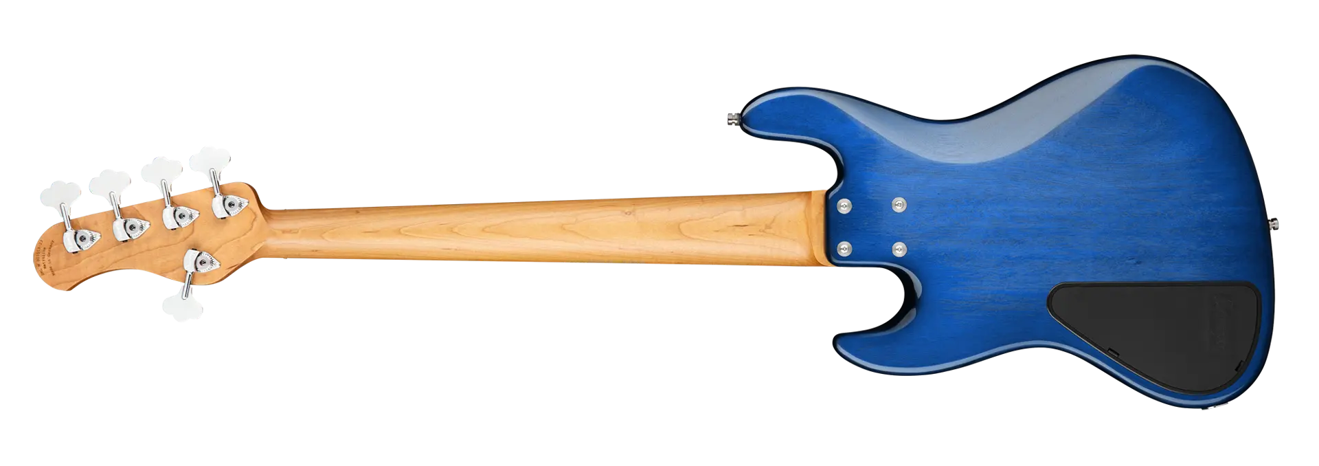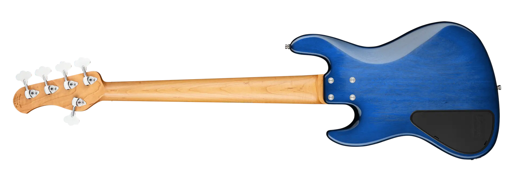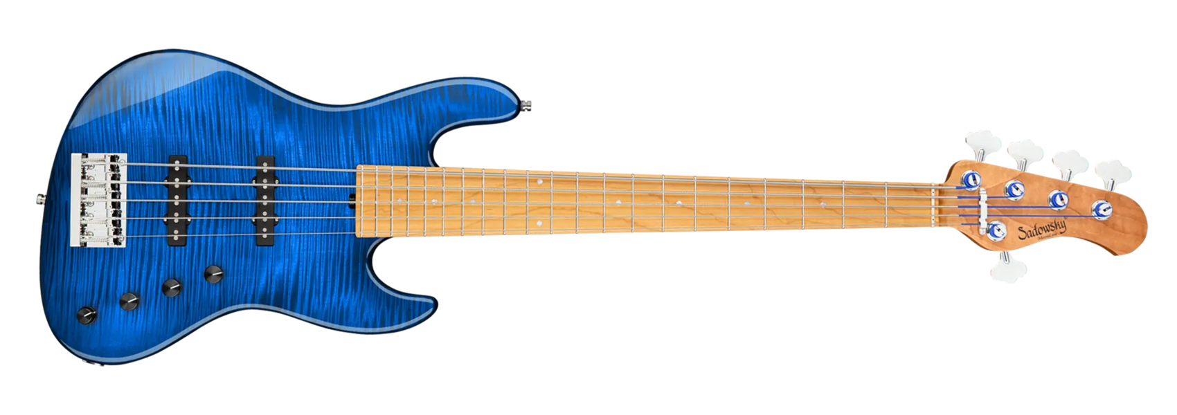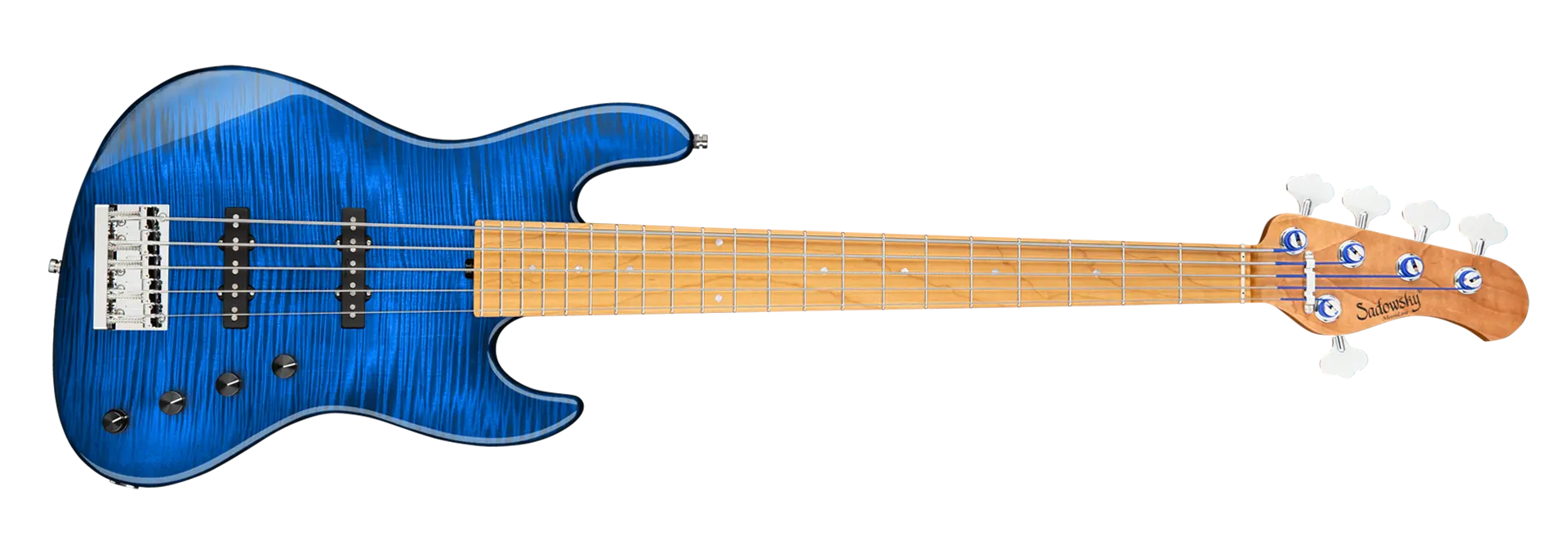 Der Sadowsky MetroLine Deluxe 21-Fret Standard J/J Bass bringt einen neuen Aspekt zu einem bereits fantastischen Sadowsky Bass: einen leichten Okoume Holzkörper mit einer wunderschönen geflammten Ahorndecke und einem gerösteten Ahornhals. Dieser Bass sieht nicht nur fantastisch aus, er spielt sich auch wunderbar! Klanglich sorgt die berühmte Sadowsky-Elektronik für den speziellen Sadowsky-Sound: Niemals harsch oder schrill klingend, mit starken, kraftvollen (aber niemals matschigen!) Bässen, Mitten, die präsent, aber nicht zu aggressiv sind, und einem süßen und luftigen Höhenbereich. Diese 5-saitige Version hat eine schlanke, unterdimensionierte J-Korpusform (chambered) und ist mit einem Ocean Blue Transparent High Polish Finish versehen. Der Hals aus geröstetem amerikanischen Ahorn ist mit einem Griffbrett aus geröstetem amerikanischen Ahorn ausgestattet. Zu den besonderen Merkmalen dieses Basses gehören zwei brummfreie Sadowsky J-Style-Tonabnehmer, eine aktive Elektronik mit True Bypass, Treble- und Bass-Boost und Vintage Tone Control. Außerdem verfügt er über leichte, offene Sadowsky-Mechaniken und eine Sadowsky Quick String Release Bridge. Dieser Bass wird ausschließlich in unserer Werkstatt in Deutschland hergestellt und wiegt nie mehr als 4,0 kg. Eine gute Wahl für Bassisten, die einen schönen und leichten Bass suchen, der einen modernen Bass-Sound bietet.