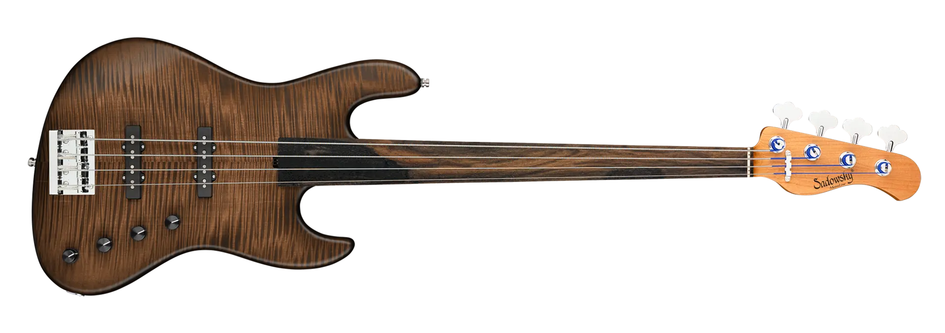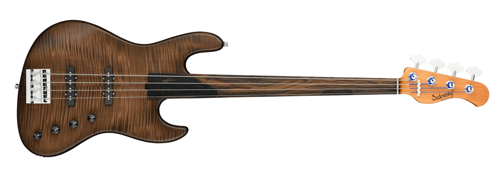 Der Sadowsky MetroLine Deluxe 21-Fret Standard J/J Bass bringt einen neuen Aspekt zu einem bereits fantastischen Sadowsky Bass: einen leichten Okoume Holzkörper mit einer wunderschönen geflammten Ahorndecke und einem gerösteten Ahornhals. Dieser Bass sieht nicht nur fantastisch aus, er spielt sich auch wunderbar! Klanglich sorgt die berühmte Sadowsky-Elektronik für den speziellen Sadowsky-Sound: Niemals harsch oder schrill klingend, mit starken, kraftvollen (aber niemals matschigen!) Bässen, Mitten, die präsent, aber nicht zu aggressiv sind, und einem süßen und luftigen Höhenbereich. Diese 4-saitige Fretless-Version hat eine schlanke, unterdimensionierte J-Korpusform (chambered) und ist mit einem Antique Tobacco Transparent Satin Finish versehen. Der Hals aus geröstetem amerikanischen Ahorn ist mit einem Tigerstripe Ebony Griffbrett ausgestattet. Zu den besonderen Merkmalen dieses Basses gehören zwei brummfreie Sadowsky J-Style-Tonabnehmer, eine aktive Elektronik mit True Bypass, Treble- und Bass-Boost und Vintage Tone Control. Außerdem verfügt er über leichte, offene Sadowsky-Mechaniken und eine Sadowsky Quick String Release Bridge. Dieser Bass wird ausschließlich in unserer Werkstatt in Deutschland hergestellt und wiegt nie mehr als 4,0 kg. Eine gute Wahl für Bassisten, die einen schönen und leichten Bass suchen, der einen modernen Bass-Sound bietet.