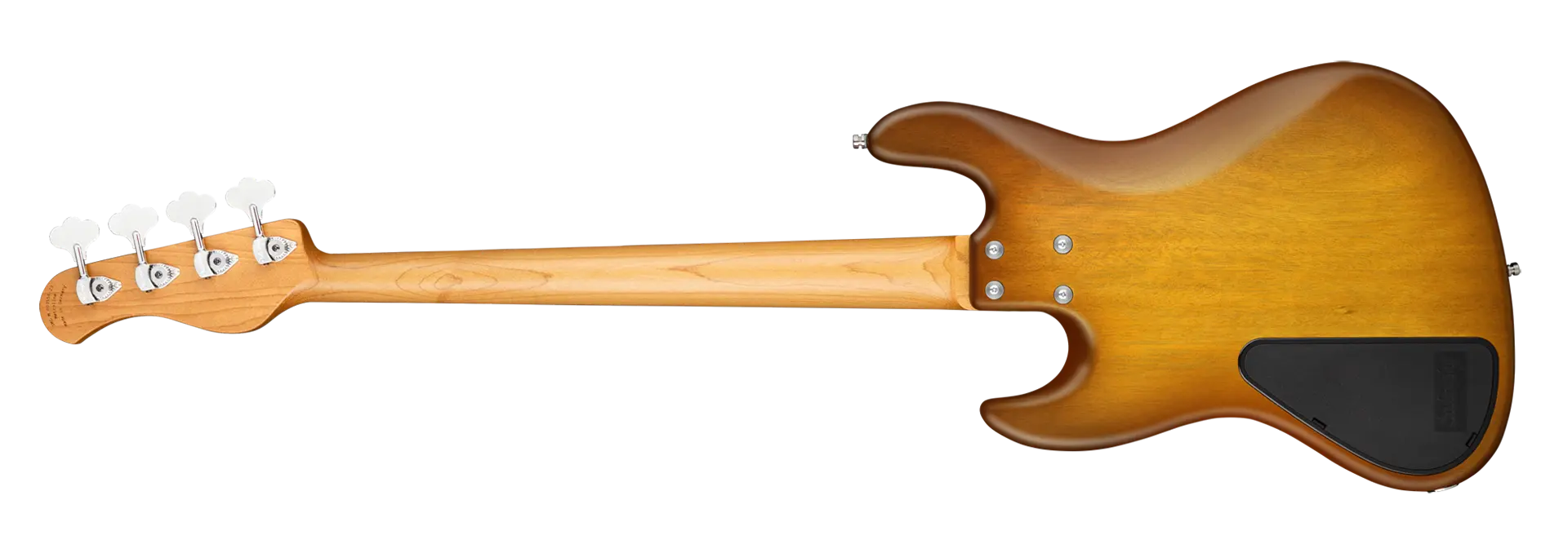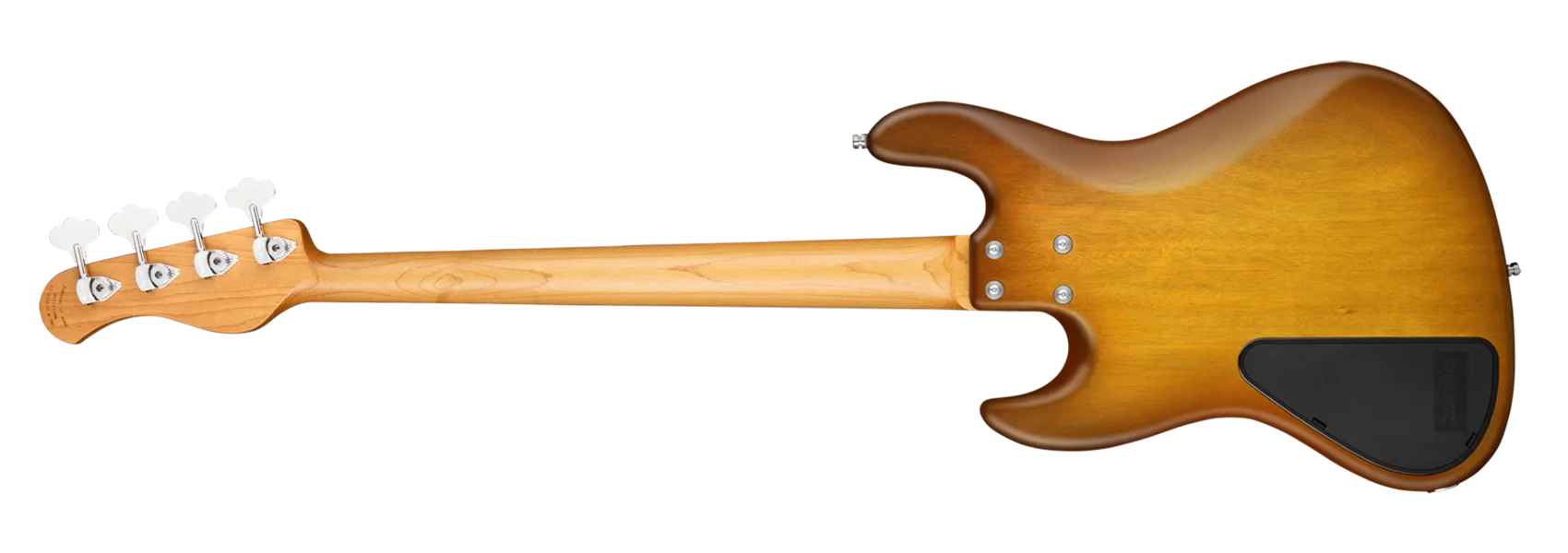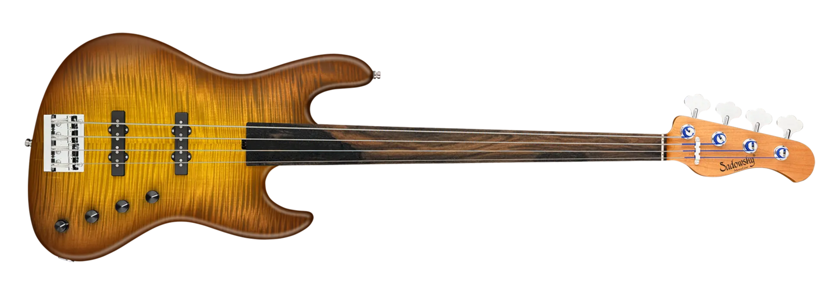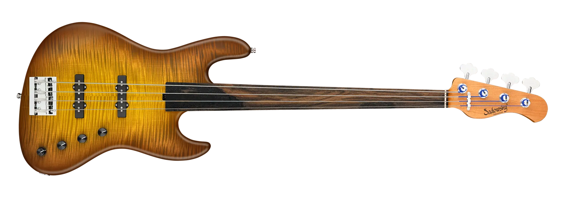 Der Sadowsky MetroLine Deluxe 21-Fret Standard J/J Bass bringt einen neuen Aspekt zu einem bereits fantastischen Sadowsky Bass: einen leichten Okoume Holzkörper mit einer wunderschönen geflammten Ahorndecke und einem gerösteten Ahornhals. Dieser Bass sieht nicht nur fantastisch aus, er spielt sich auch wunderbar! Klanglich sorgt die berühmte Sadowsky-Elektronik für den speziellen Sadowsky-Sound: Niemals harsch oder schrill klingend, mit starken, kraftvollen (aber niemals matschigen!) Bässen, Mitten, die präsent, aber nicht zu aggressiv sind, und einem süßen und luftigen Höhenbereich. Diese 4-saitige Fretless-Version hat eine schlanke, unterdimensionierte J-Korpusform (chambered) und ist mit einem Caramel Burst Transparent Satin Finish versehen. Der Hals aus geröstetem amerikanischen Ahorn ist mit einem Tigerstripe Ebony Griffbrett ausgestattet. Zu den besonderen Merkmalen dieses Basses gehören zwei brummfreie Sadowsky J-Style-Tonabnehmer, eine aktive Elektronik mit True Bypass, Treble- und Bass-Boost und Vintage Tone Control. Außerdem verfügt er über leichte, offene Sadowsky-Mechaniken und eine Sadowsky Quick String Release Bridge. Dieser Bass wird ausschließlich in unserer Werkstatt in Deutschland hergestellt und wiegt nie mehr als 4,0 kg. Eine gute Wahl für Bassisten, die einen schönen und leichten Bass suchen, der einen modernen Bass-Sound bietet.