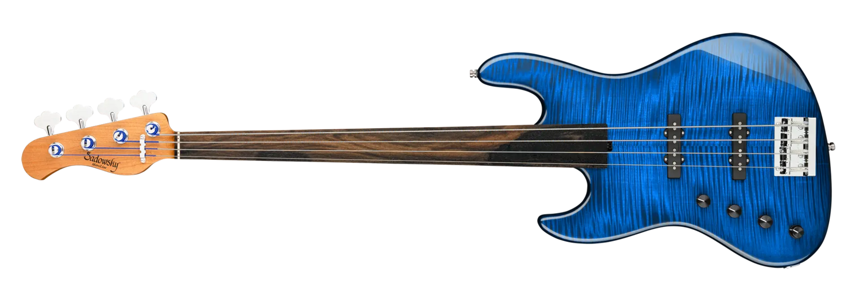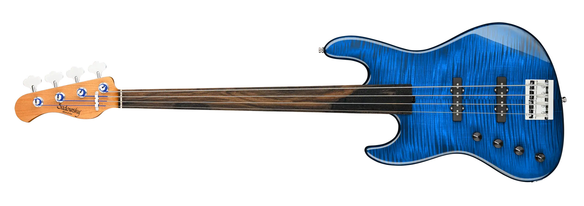 Der Sadowsky MetroLine Deluxe 21-Fret Standard J/J Bass bringt einen neuen Aspekt zu einem bereits fantastischen Sadowsky Bass: einen leichten Okoume Holzkörper mit einer wunderschönen geflammten Ahorndecke und einem gerösteten Ahornhals. Dieser Bass sieht nicht nur fantastisch aus, er spielt sich auch wunderbar! Klanglich sorgt die berühmte Sadowsky-Elektronik für den speziellen Sadowsky-Sound: Niemals harsch oder schrill klingend, mit starken, kraftvollen (aber niemals matschigen!) Bässen, Mitten, die präsent, aber nicht zu aggressiv sind, und einem süßen und luftigen Höhenbereich. Diese 4-saitige Fretless Linkshänder-Version hat eine schlanke, unterdimensionierte J-Korpusform (chambered) und ist mit einem Ocean Blue Transparent High Polish Finish versehen. Der Hals aus geröstetem amerikanischen Ahorn ist mit einem Tigerstripe Ebony Griffbrett ausgestattet. Zu den besonderen Merkmalen dieses Basses gehören zwei brummfreie Sadowsky J-Style-Tonabnehmer, eine aktive Elektronik mit True Bypass, Treble- und Bass-Boost und Vintage Tone Control. Außerdem verfügt er über leichte, offene Sadowsky-Mechaniken und eine Sadowsky Quick String Release Bridge. Dieser Bass wird ausschließlich in unserer Werkstatt in Deutschland hergestellt und wiegt nie mehr als 4,0 kg. Eine gute Wahl für Bassisten, die einen schönen und leichten Bass suchen, der einen modernen Bass-Sound bietet.