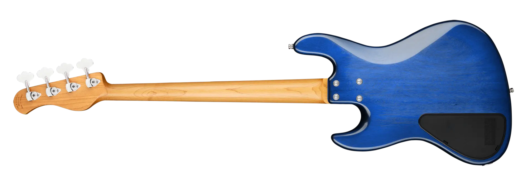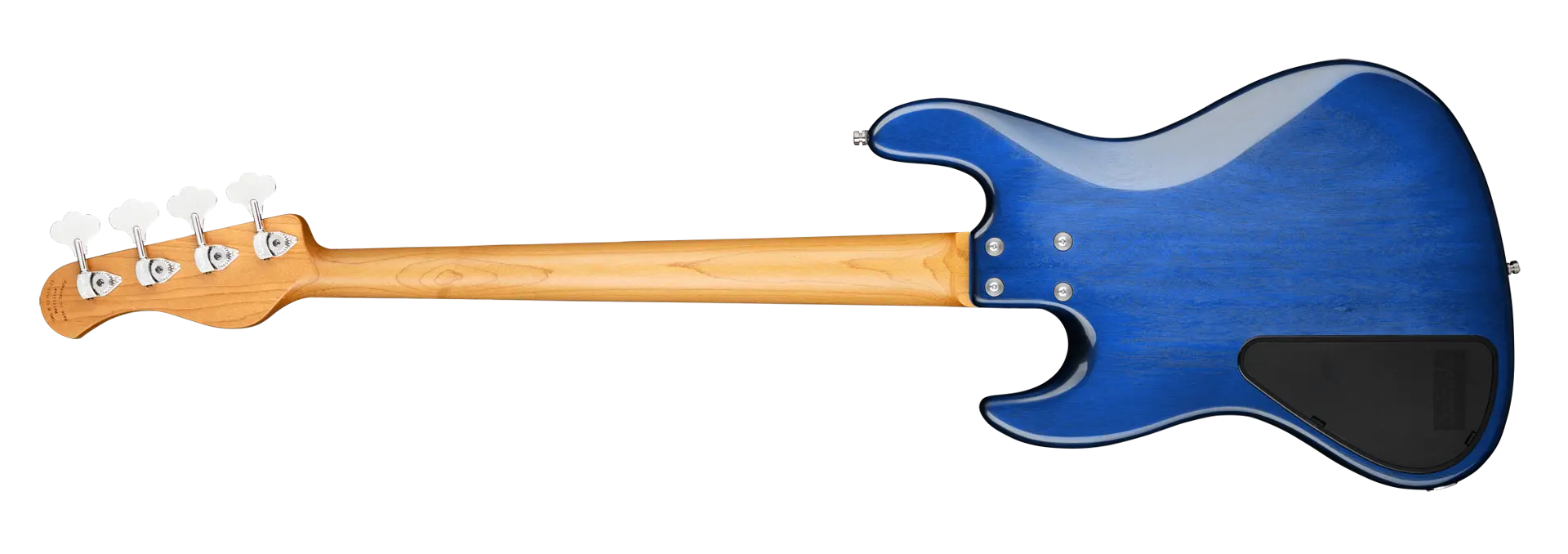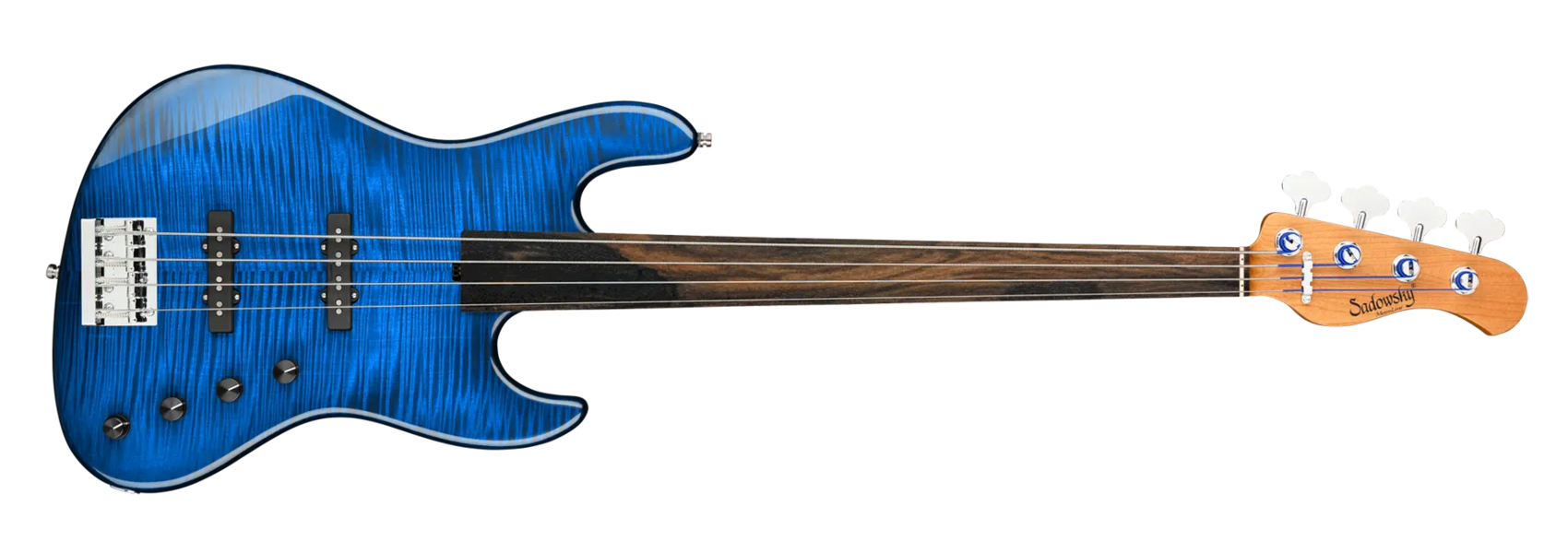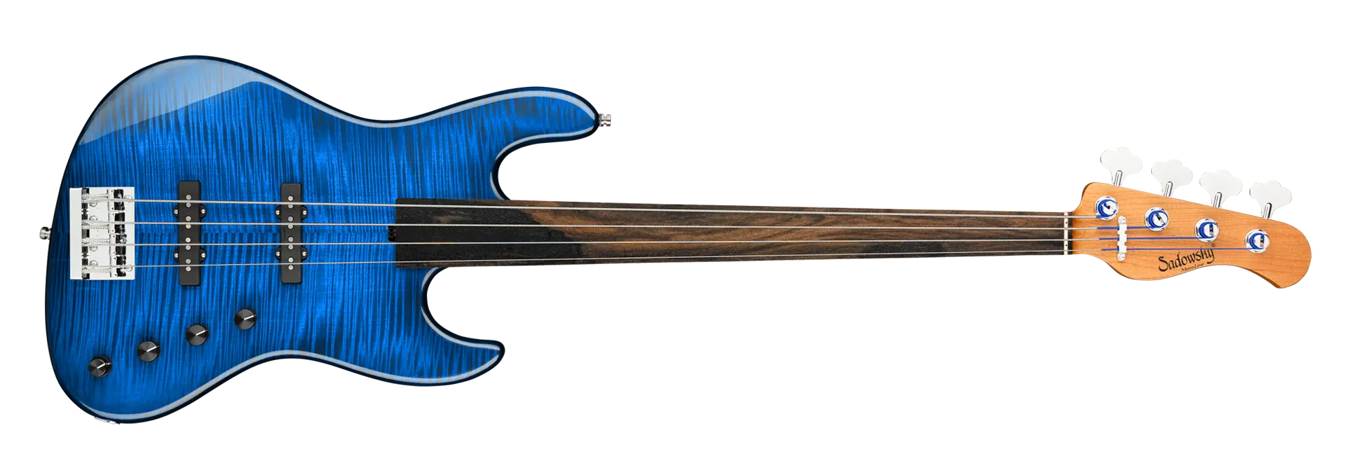 Der Sadowsky MetroLine Deluxe 21-Fret Standard J/J Bass bringt einen neuen Aspekt zu einem bereits fantastischen Sadowsky Bass: einen leichten Okoume Holzkörper mit einer wunderschönen geflammten Ahorndecke und einem gerösteten Ahornhals. Dieser Bass sieht nicht nur fantastisch aus, er spielt sich auch wunderbar! Klanglich sorgt die berühmte Sadowsky-Elektronik für den speziellen Sadowsky-Sound: Niemals harsch oder schrill klingend, mit starken, kraftvollen (aber niemals matschigen!) Bässen, Mitten, die präsent, aber nicht zu aggressiv sind, und einem süßen und luftigen Höhenbereich. Diese 4-saitige Fretless-Version hat eine schlanke, unterdimensionierte J-Korpusform (chambered) und ist mit einem Ocean Blue Transparent High Polish Finish versehen. Der Hals aus geröstetem amerikanischen Ahorn ist mit einem Tigerstripe Ebony Griffbrett ausgestattet. Zu den besonderen Merkmalen dieses Basses gehören zwei brummfreie Sadowsky J-Style-Tonabnehmer, eine aktive Elektronik mit True Bypass, Treble- und Bass-Boost und Vintage Tone Control. Außerdem verfügt er über leichte, offene Sadowsky-Mechaniken und eine Sadowsky Quick String Release Bridge. Dieser Bass wird ausschließlich in unserer Werkstatt in Deutschland hergestellt und wiegt nie mehr als 4,0 kg. Eine gute Wahl für Bassisten, die einen schönen und leichten Bass suchen, der einen modernen Bass-Sound bietet.