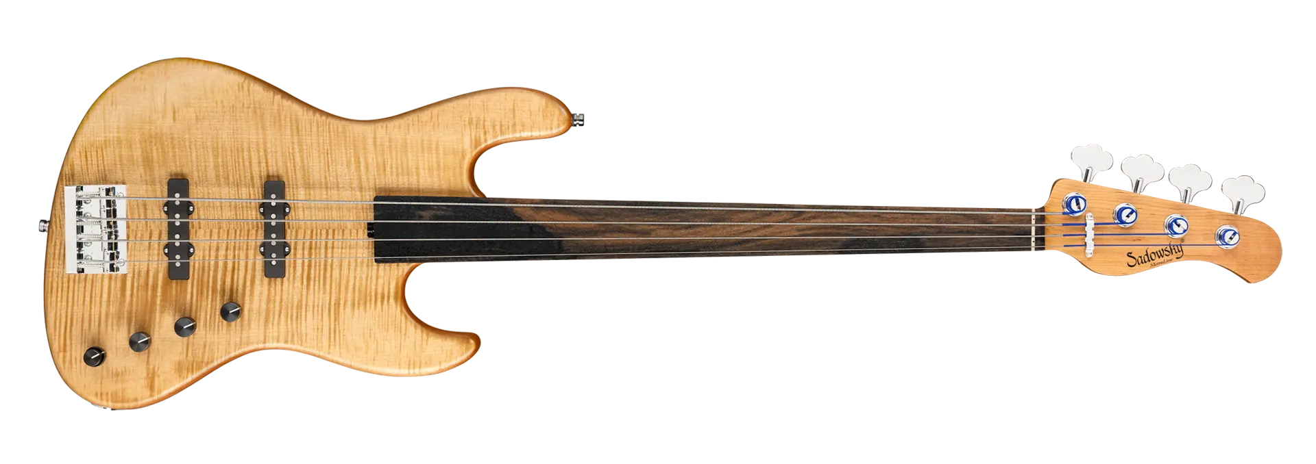 Der Sadowsky MetroLine Deluxe 21-Fret Standard J/J Bass bringt einen neuen Aspekt zu einem bereits fantastischen Sadowsky Bass: einen leichten Okoume Holzkörper mit einer wunderschönen geflammten Ahorndecke und einem gerösteten Ahornhals. Dieser Bass sieht nicht nur fantastisch aus, er spielt sich auch wunderbar! Klanglich sorgt die berühmte Sadowsky-Elektronik für den speziellen Sadowsky-Sound: Niemals harsch oder schrill klingend, mit starken, kraftvollen (aber niemals matschigen!) Bässen, Mitten, die präsent, aber nicht zu aggressiv sind, und einem süßen und luftigen Höhenbereich. Diese 4-saitige Fretless-Version hat eine schlanke, unterdimensionierte J-Korpusform (chambered) und ist mit einem Vintage Tinted Natural Transparent Satin Finish versehen. Der Hals aus geröstetem amerikanischen Ahorn ist mit einem Tigerstripe Ebony Griffbrett ausgestattet. Zu den besonderen Merkmalen dieses Basses gehören zwei brummfreie Sadowsky J-Style-Tonabnehmer, eine aktive Elektronik mit True Bypass, Treble- und Bass-Boost und Vintage Tone Control. Außerdem verfügt er über leichte, offene Sadowsky-Mechaniken und eine Sadowsky Quick String Release Bridge. Dieser Bass wird ausschließlich in unserer Werkstatt in Deutschland hergestellt und wiegt nie mehr als 4,0 kg. Eine gute Wahl für Bassisten, die einen schönen und leichten Bass suchen, der einen modernen Bass-Sound bietet.