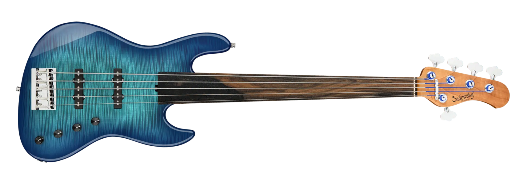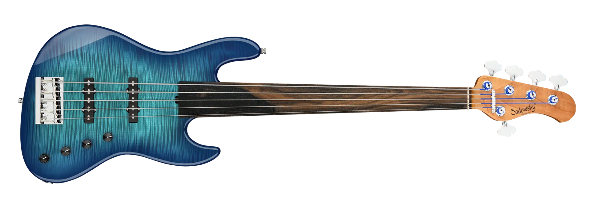 Der Sadowsky MetroLine Deluxe 21-Fret Standard J/J Bass bringt einen neuen Aspekt zu einem bereits fantastischen Sadowsky Bass: einen leichten Okoume Holzkörper mit einer wunderschönen geflammten Ahorndecke und einem gerösteten Ahornhals. Dieser Bass sieht nicht nur fantastisch aus, er spielt sich auch wunderbar! Klanglich sorgt die berühmte Sadowsky-Elektronik für den speziellen Sadowsky-Sound: Niemals harsch oder schrill klingend, mit starken, kraftvollen (aber niemals matschigen!) Bässen, Mitten, die präsent, aber nicht zu aggressiv sind, und einem süßen und luftigen Höhenbereich. Diese 5-saitige Fretless-Version hat eine schlanke, unterdimensionierte J-Korpusform (chambered) und ist mit einem Bora Blue Burst Transparent High Polish Finish versehen. Der Hals aus geröstetem amerikanischen Ahorn ist mit einem Tigerstripe Ebony Griffbrett ausgestattet. Zu den besonderen Merkmalen dieses Basses gehören zwei brummfreie Sadowsky J-Style-Tonabnehmer, eine aktive Elektronik mit True Bypass, Treble- und Bass-Boost und Vintage Tone Control. Außerdem verfügt er über leichte, offene Sadowsky-Mechaniken und eine Sadowsky Quick String Release Bridge. Dieser Bass wird ausschließlich in unserer Werkstatt in Deutschland hergestellt und wiegt nie mehr als 4,0 kg. Eine gute Wahl für Bassisten, die einen schönen und leichten Bass suchen, der einen modernen Bass-Sound bietet.