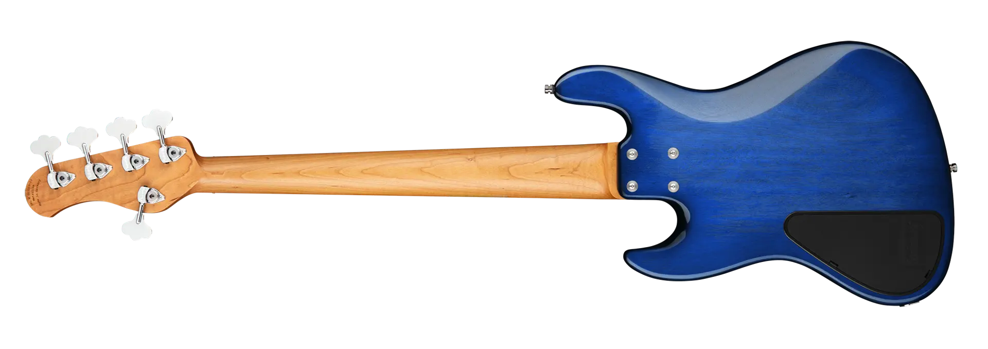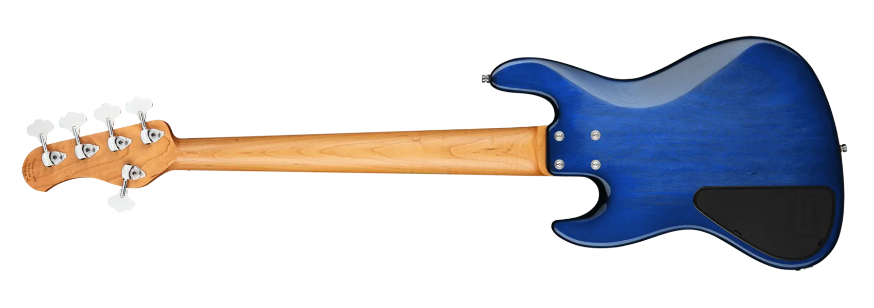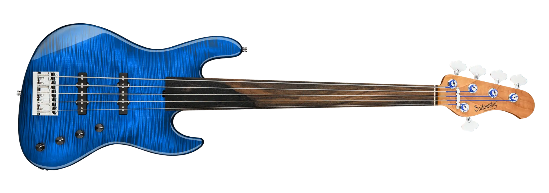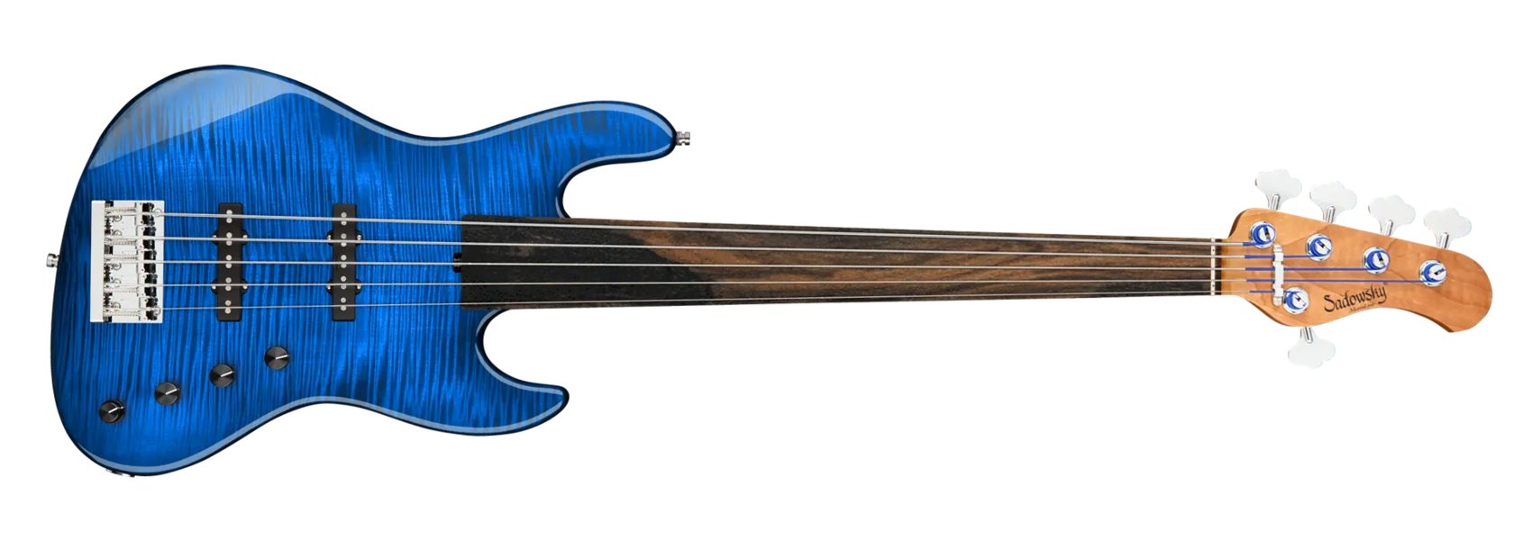 Der Sadowsky MetroLine Deluxe 21-Fret Standard J/J Bass bringt einen neuen Aspekt zu einem bereits fantastischen Sadowsky Bass: einen leichten Okoume Holzkörper mit einer wunderschönen geflammten Ahorndecke und einem gerösteten Ahornhals. Dieser Bass sieht nicht nur fantastisch aus, er spielt sich auch wunderbar! Klanglich sorgt die berühmte Sadowsky-Elektronik für den speziellen Sadowsky-Sound: Niemals harsch oder schrill klingend, mit starken, kraftvollen (aber niemals matschigen!) Bässen, Mitten, die präsent, aber nicht zu aggressiv sind, und einem süßen und luftigen Höhenbereich. Diese 5-saitige Fretless-Version hat eine schlanke, unterdimensionierte J-Korpusform (chambered) und ist mit einem Ocean Blue Transparent High Polish Finish versehen. Der Hals aus geröstetem amerikanischen Ahorn ist mit einem Tigerstripe Ebony Griffbrett ausgestattet. Zu den besonderen Merkmalen dieses Basses gehören zwei brummfreie Sadowsky J-Style-Tonabnehmer, eine aktive Elektronik mit True Bypass, Treble- und Bass-Boost und Vintage Tone Control. Außerdem verfügt er über leichte, offene Sadowsky-Mechaniken und eine Sadowsky Quick String Release Bridge. Dieser Bass wird ausschließlich in unserer Werkstatt in Deutschland hergestellt und wiegt nie mehr als 4,0 kg. Eine gute Wahl für Bassisten, die einen schönen und leichten Bass suchen, der einen modernen Bass-Sound bietet.