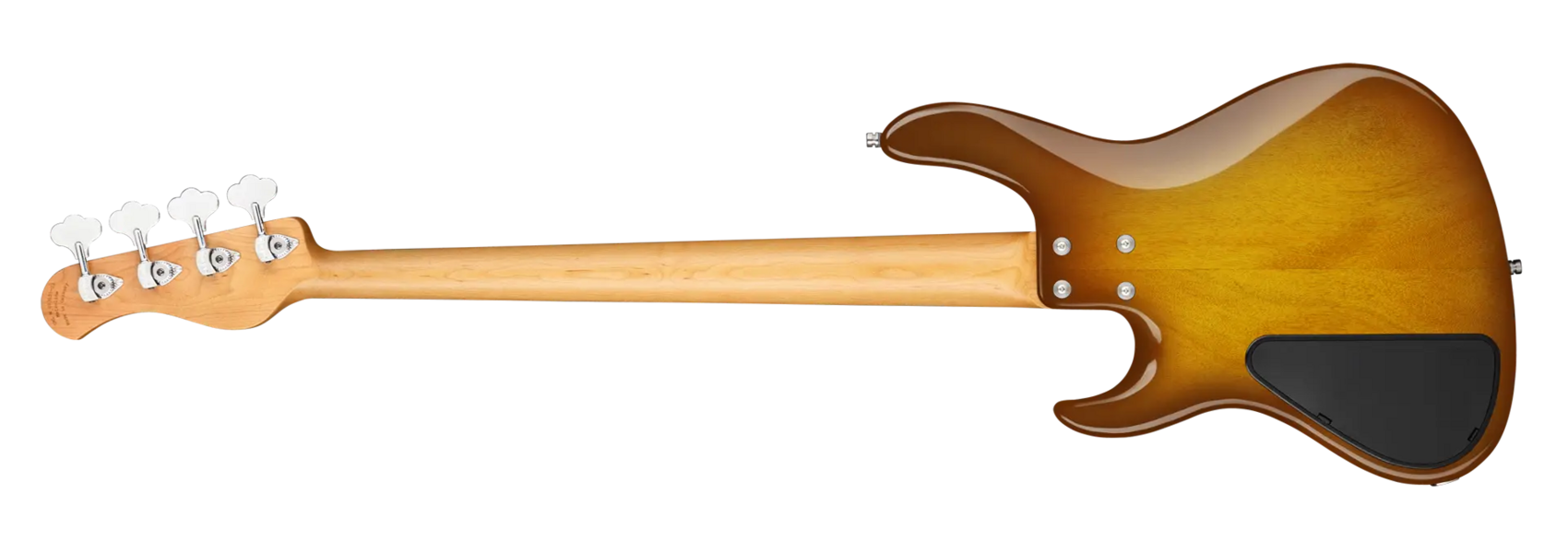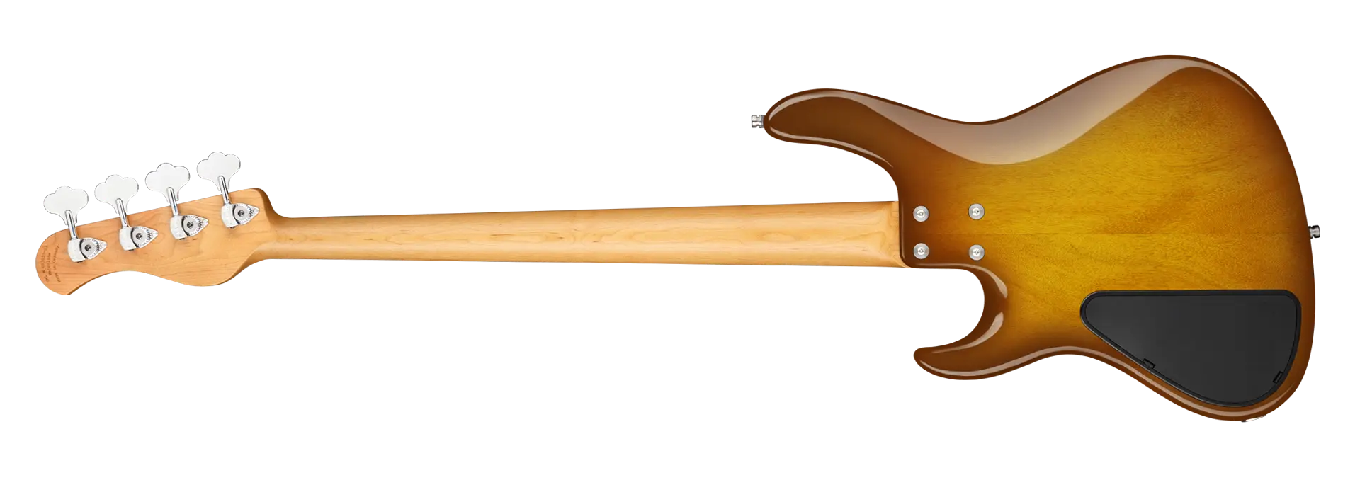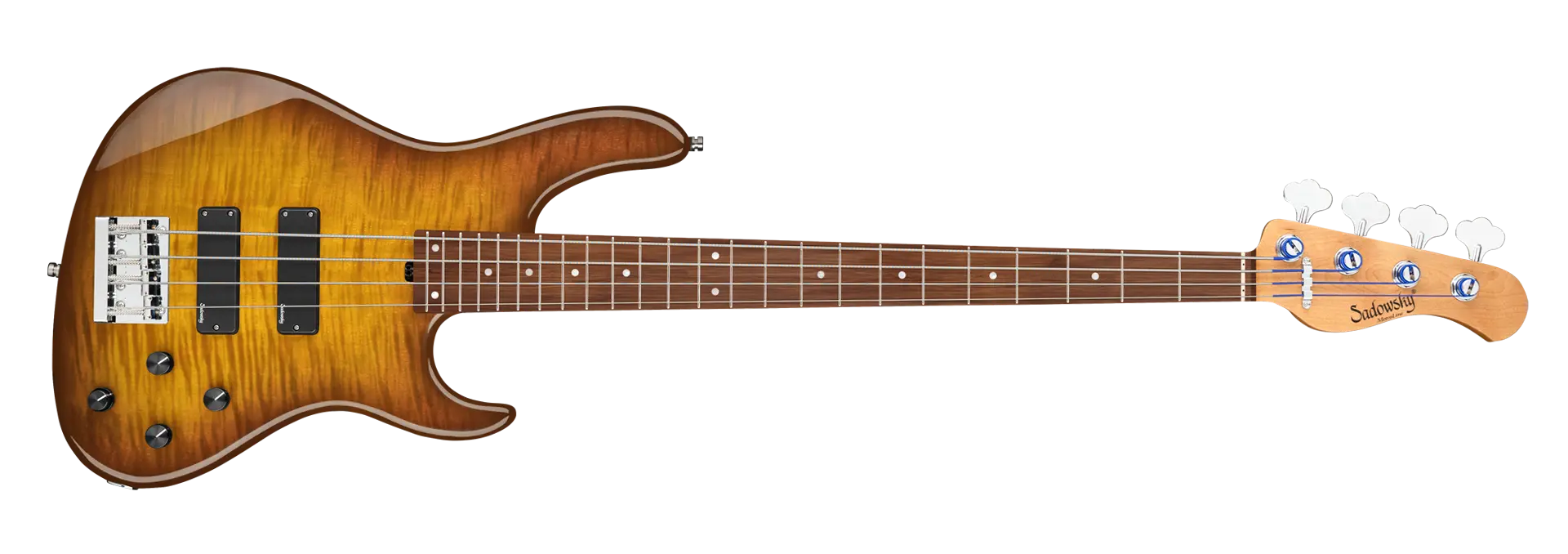 Der Sadowsky MetroLine Deluxe 24-Fret Modern Bass ist perfekt für alle Spieler, die einen Bass in moderner Optik und dem berühmten Sadowsky-Ton suchen: Niemals harsch oder schrill klingend, mit starken, kraftvollen, aber nie matschigen Bässen, mit präsenten, aber nicht zu aggressiven Mitten und einem süßen und luftigen Höhenbereich. Der 4-saitige Bass hat einen Korpus aus Okoume (chambered). Hier in einer Caramel Burst Transparent High Polish-Lackierung zu sehen, ist die Korpusform schlank und unterdimensioniert mit tieferen Cutaways für bessere Bespielbarkeit und einen vollen Tonumfang von zwei Oktaven. Der Hals ist aus geröstetem amerikanischem Ahorn gefertigt und hat ein Morado (Pau Ferro) Griffbrett mit 24 Neusilberbünden. Dieser Bass ist mit zwei passiven Sadowsky Soapbar-Tonabnehmern ausgestattet, beide in moderner Position, und verfügt über eine aktive Elektronik, die True Bypass, Vintage Tone Control sowie Treble- und Bass-Boost bietet. Die Hardware umfasst Sadowsky Light Open Gear Mechaniken und eine Sadowsky Quick String Release Brücke. Jeder Sadowsky MetroLine Deluxe 24-Fret Modern Bass wird ausschließlich in unserer Werkstatt in Deutschland gefertigt und wiegt nicht mehr als 4,0 kg. Eine gute Wahl für Bassisten, die auf der Suche nach einem leichten, modern aussehenden Bass mit dem speziellen modernen Sadowsky-Sound sind.