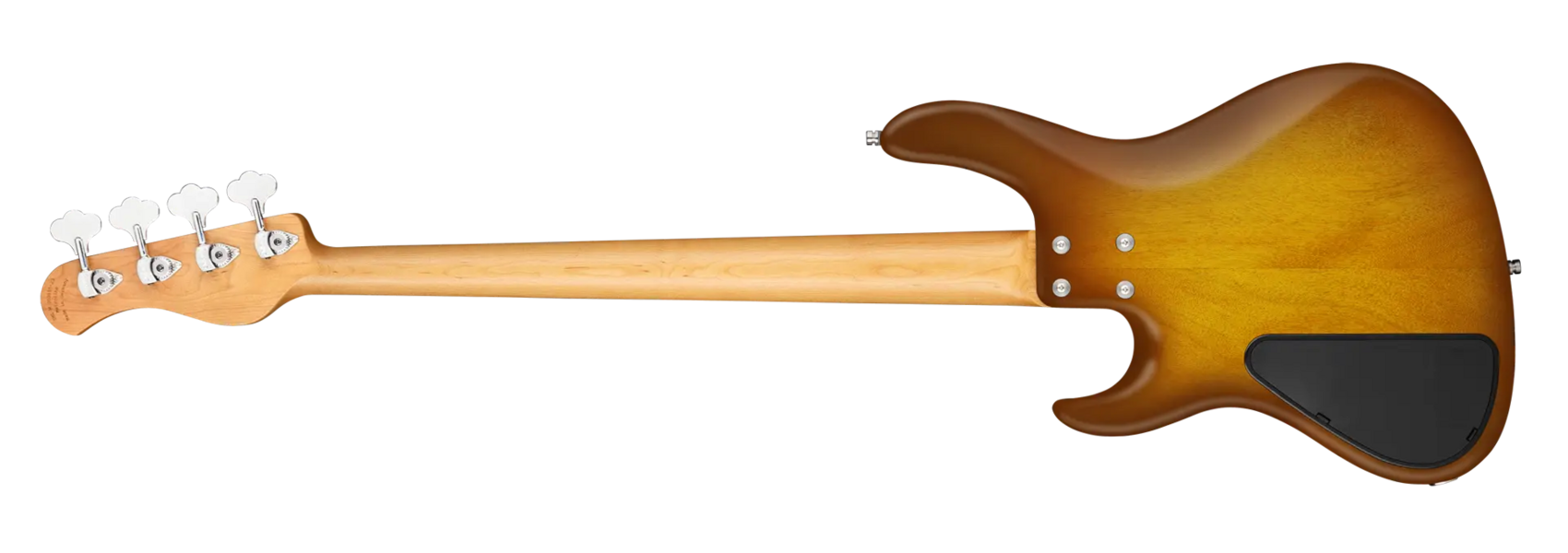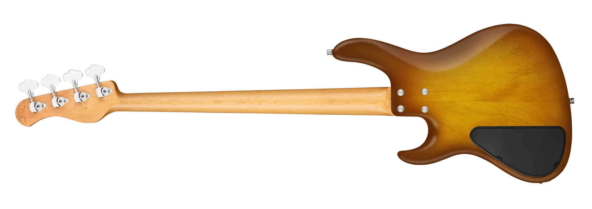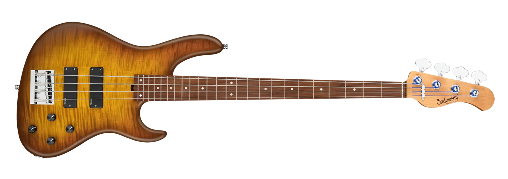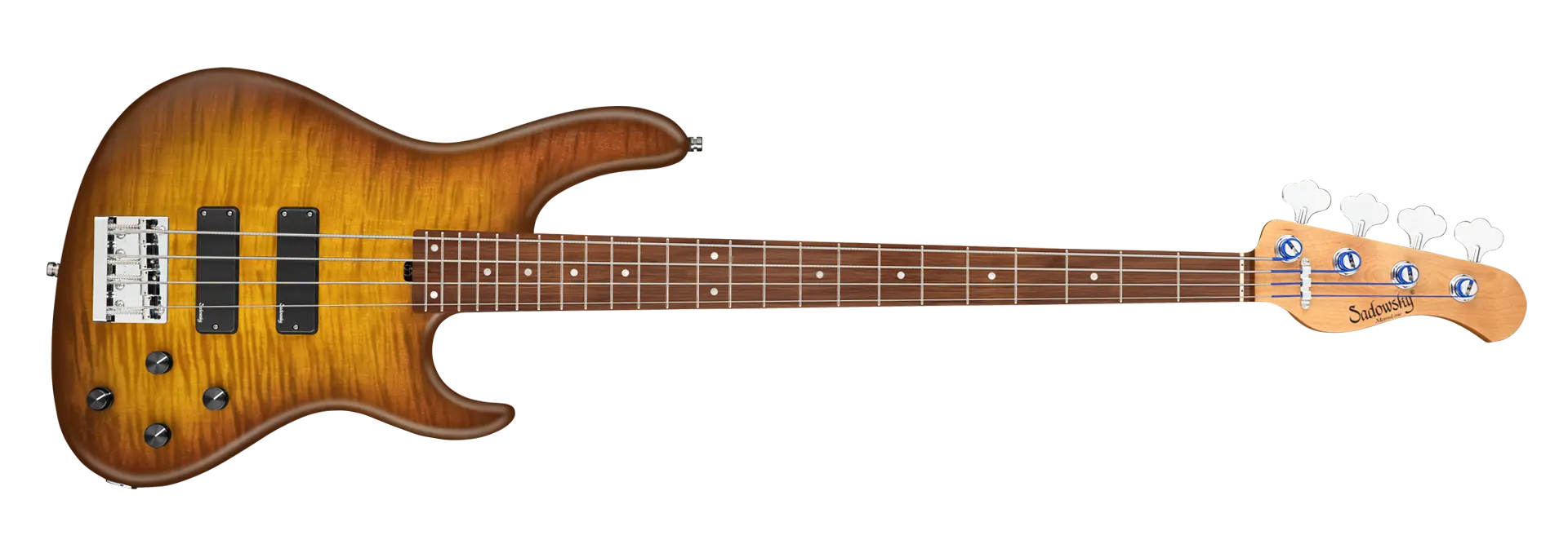 Der Sadowsky MetroLine Deluxe 24-Fret Modern Bass ist perfekt für alle Spieler, die einen Bass in moderner Optik und dem berühmten Sadowsky-Ton suchen: Niemals harsch oder schrill klingend, mit starken, kraftvollen, aber nie matschigen Bässen, mit präsenten, aber nicht zu aggressiven Mitten und einem süßen und luftigen Höhenbereich. Der 4-saitige Bass hat einen Korpus aus Okoume (chambered). Hier in einer Caramel Burst Transparent Satin-Lackierung zu sehen, ist die Korpusform schlank und unterdimensioniert mit tieferen Cutaways für bessere Bespielbarkeit und einen vollen Tonumfang von zwei Oktaven. Der Hals ist aus geröstetem amerikanischem Ahorn gefertigt und hat ein Morado (Pau Ferro) Griffbrett mit 24 Neusilberbünden. Dieser Bass ist mit zwei passiven Sadowsky Soapbar-Tonabnehmern ausgestattet, beide in moderner Position, und verfügt über eine aktive Elektronik, die True Bypass, Vintage Tone Control sowie Treble- und Bass-Boost bietet. Die Hardware umfasst Sadowsky Light Open Gear Mechaniken und eine Sadowsky Quick String Release Brücke. Jeder Sadowsky MetroLine Deluxe 24-Fret Modern Bass wird ausschließlich in unserer Werkstatt in Deutschland gefertigt und wiegt nicht mehr als 4,0 kg. Eine gute Wahl für Bassisten, die auf der Suche nach einem leichten, modern aussehenden Bass mit dem speziellen modernen Sadowsky-Sound sind.