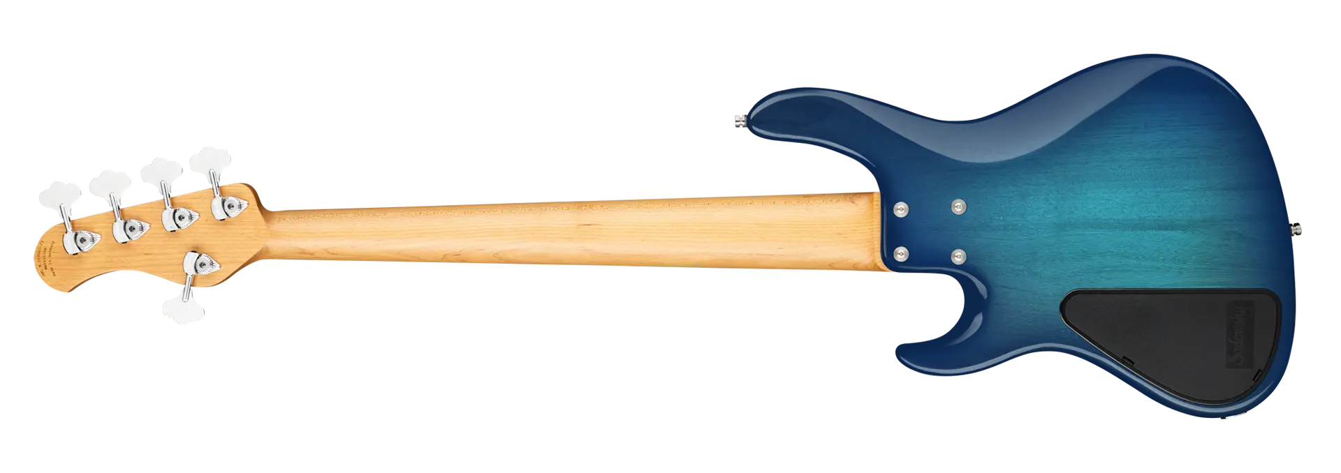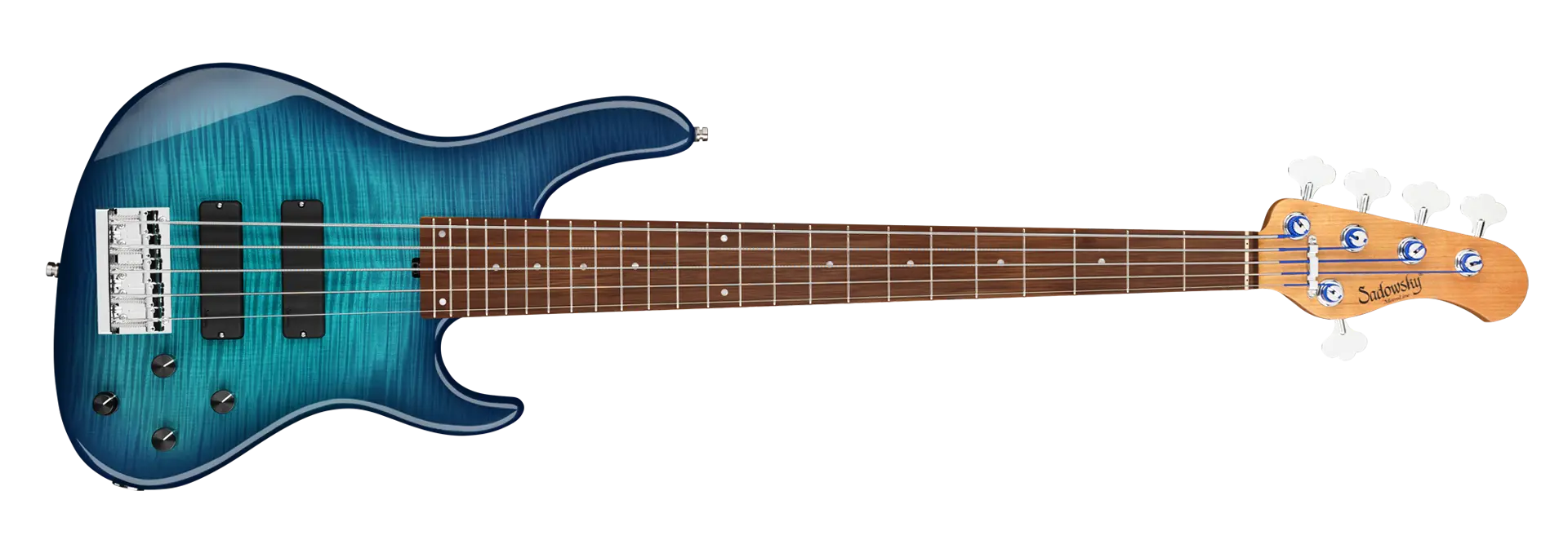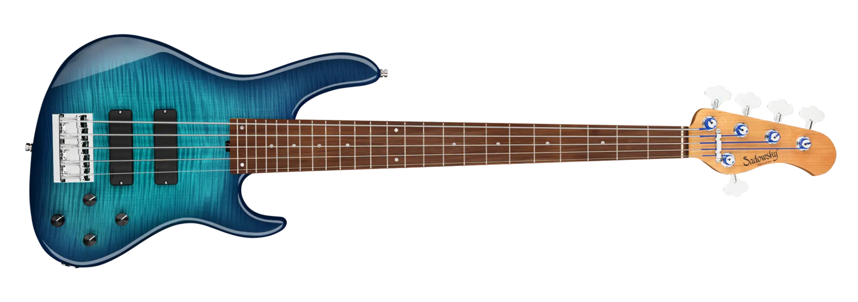 Der Sadowsky MetroLine Deluxe 24-Fret Modern Bass ist perfekt für alle Spieler, die einen Bass in moderner Optik und dem berühmten Sadowsky-Ton suchen: Niemals harsch oder schrill klingend, mit starken, kraftvollen, aber nie matschigen Bässen, mit präsenten, aber nicht zu aggressiven Mitten und einem süßen und luftigen Höhenbereich. Der 5-saitige Bass hat einen Korpus aus Okoume (chambered). Hier in einer Bora Blue Burst Transparent High Polish-Lackierung zu sehen, ist die Korpusform schlank und unterdimensioniert mit tieferen Cutaways für bessere Bespielbarkeit und einen vollen Tonumfang von zwei Oktaven. Der Hals ist aus geröstetem amerikanischem Ahorn gefertigt und hat ein Morado (Pau Ferro) Griffbrett mit 24 Neusilberbünden. Dieser Bass ist mit zwei passiven Sadowsky Soapbar-Tonabnehmern ausgestattet, beide in moderner Position, und verfügt über eine aktive Elektronik, die True Bypass, Vintage Tone Control sowie Treble- und Bass-Boost bietet. Die Hardware umfasst Sadowsky Light Open Gear Mechaniken und eine Sadowsky Quick String Release Brücke. Jeder Sadowsky MetroLine Deluxe 24-Fret Modern Bass wird ausschließlich in unserer Werkstatt in Deutschland gefertigt und wiegt nicht mehr als 4,0 kg. Eine gute Wahl für Bassisten, die auf der Suche nach einem leichten, modern aussehenden Bass mit dem speziellen modernen Sadowsky-Sound sind.